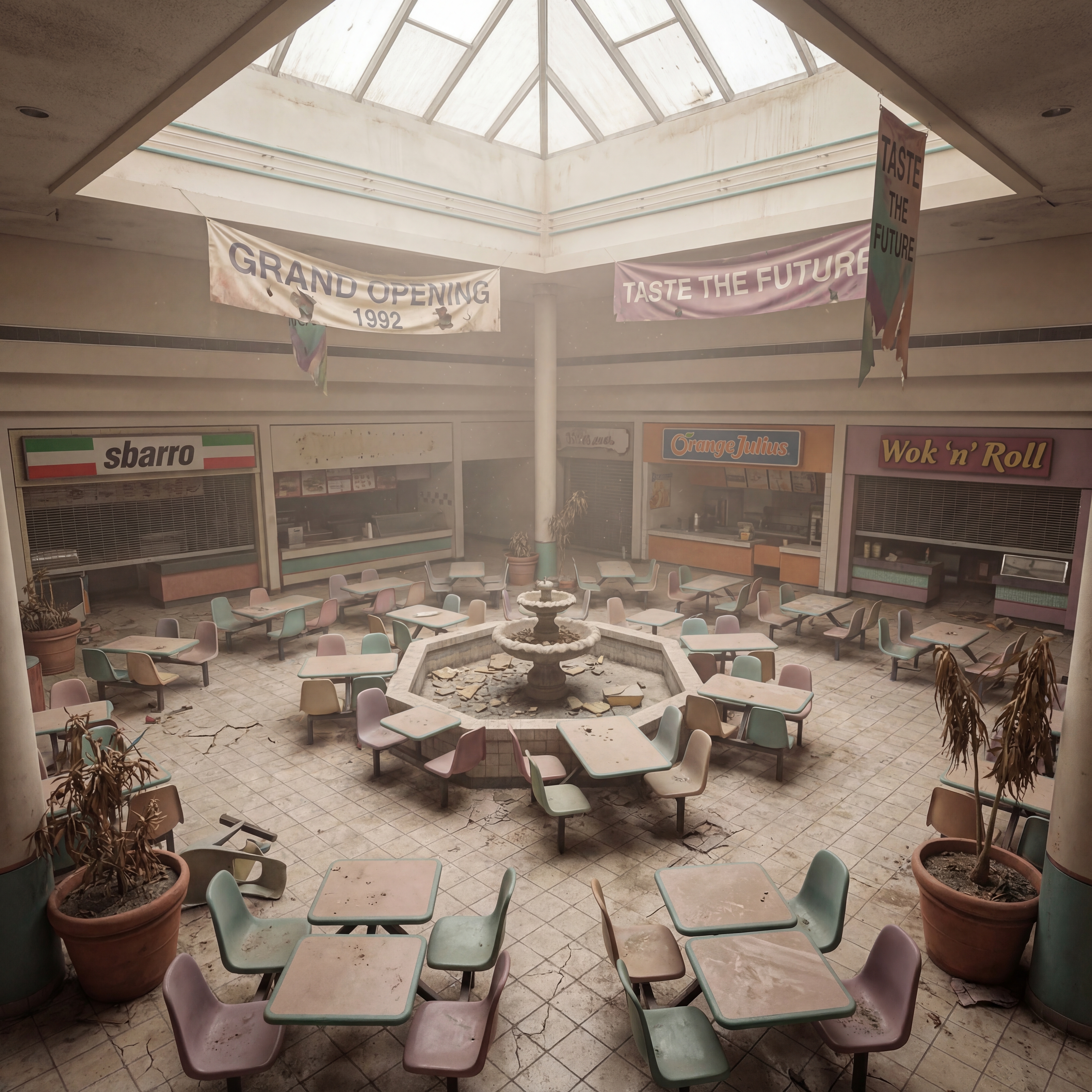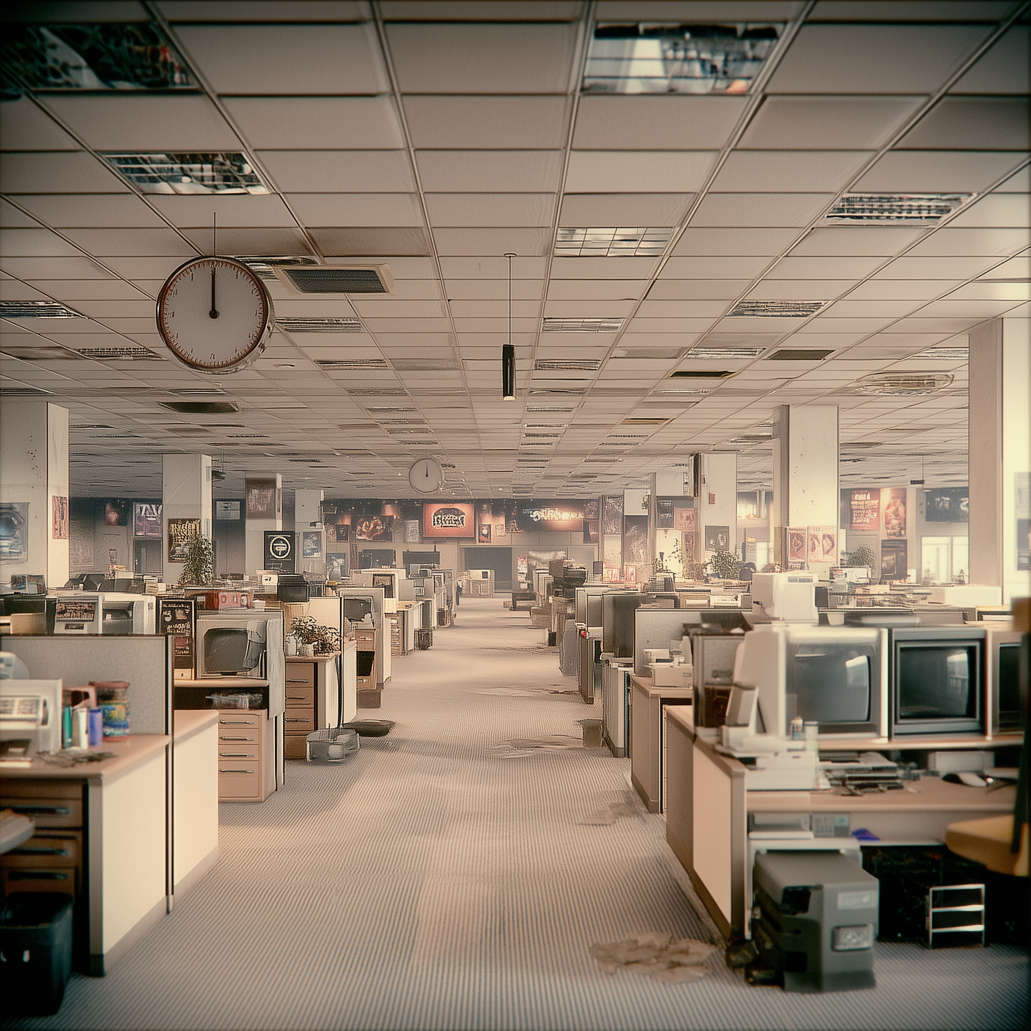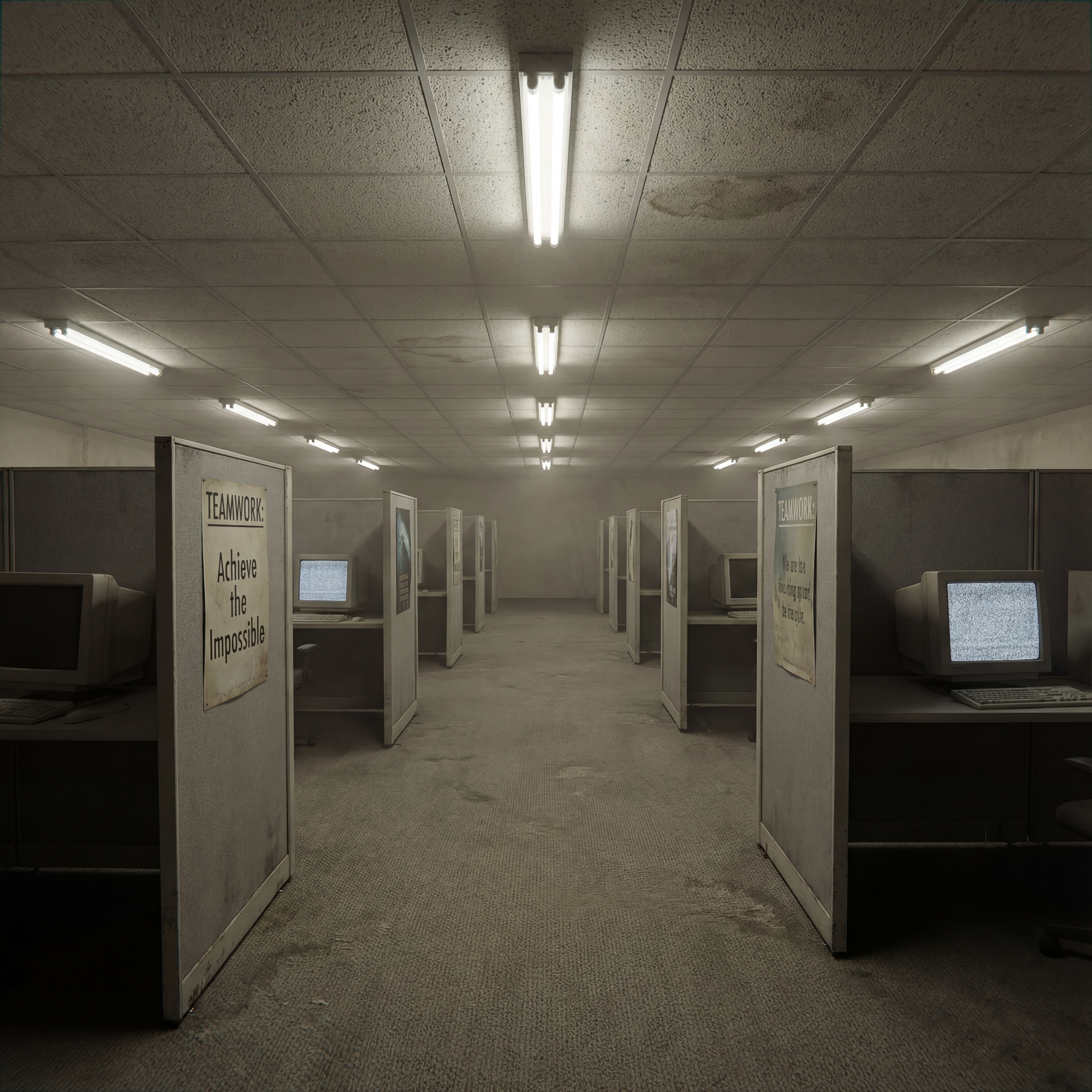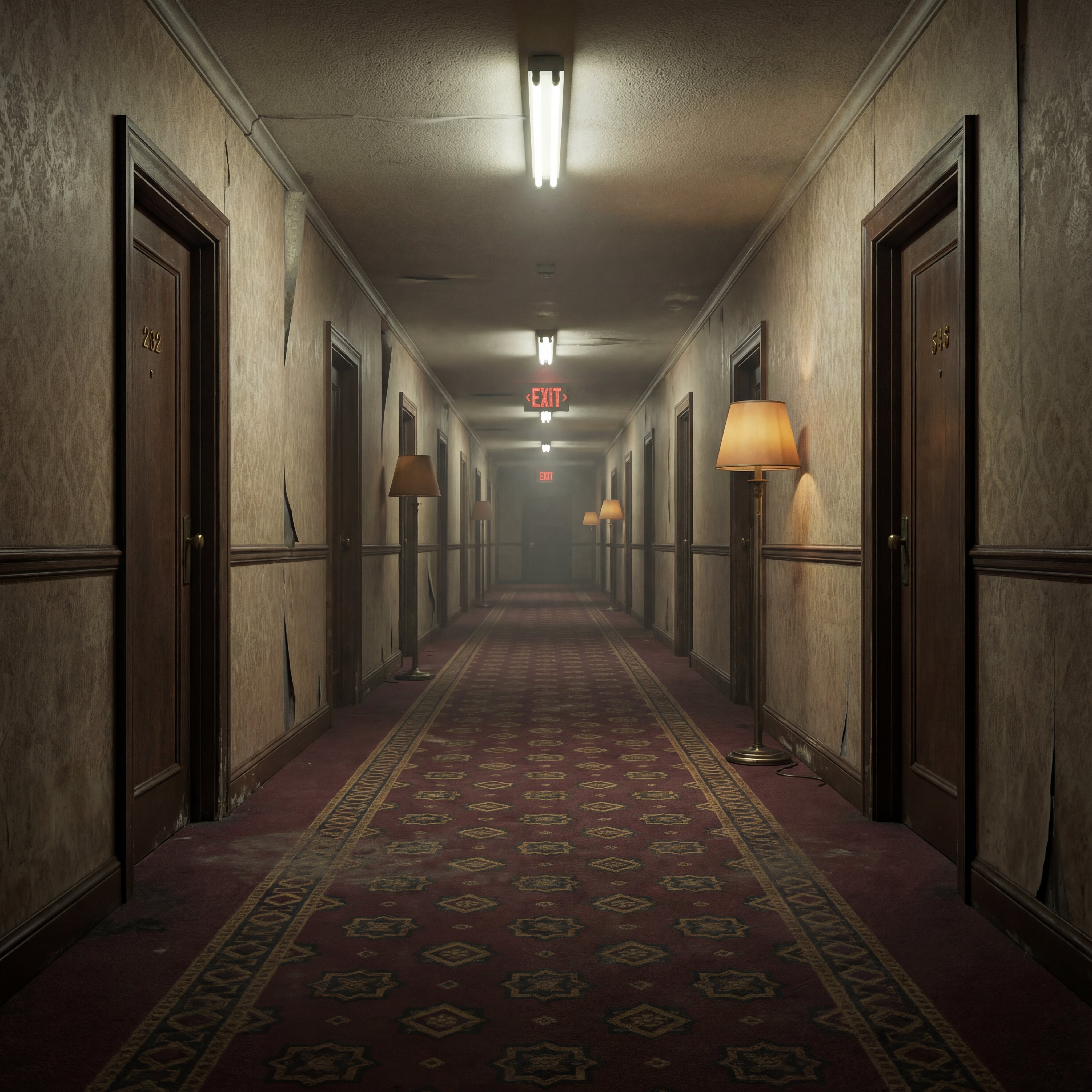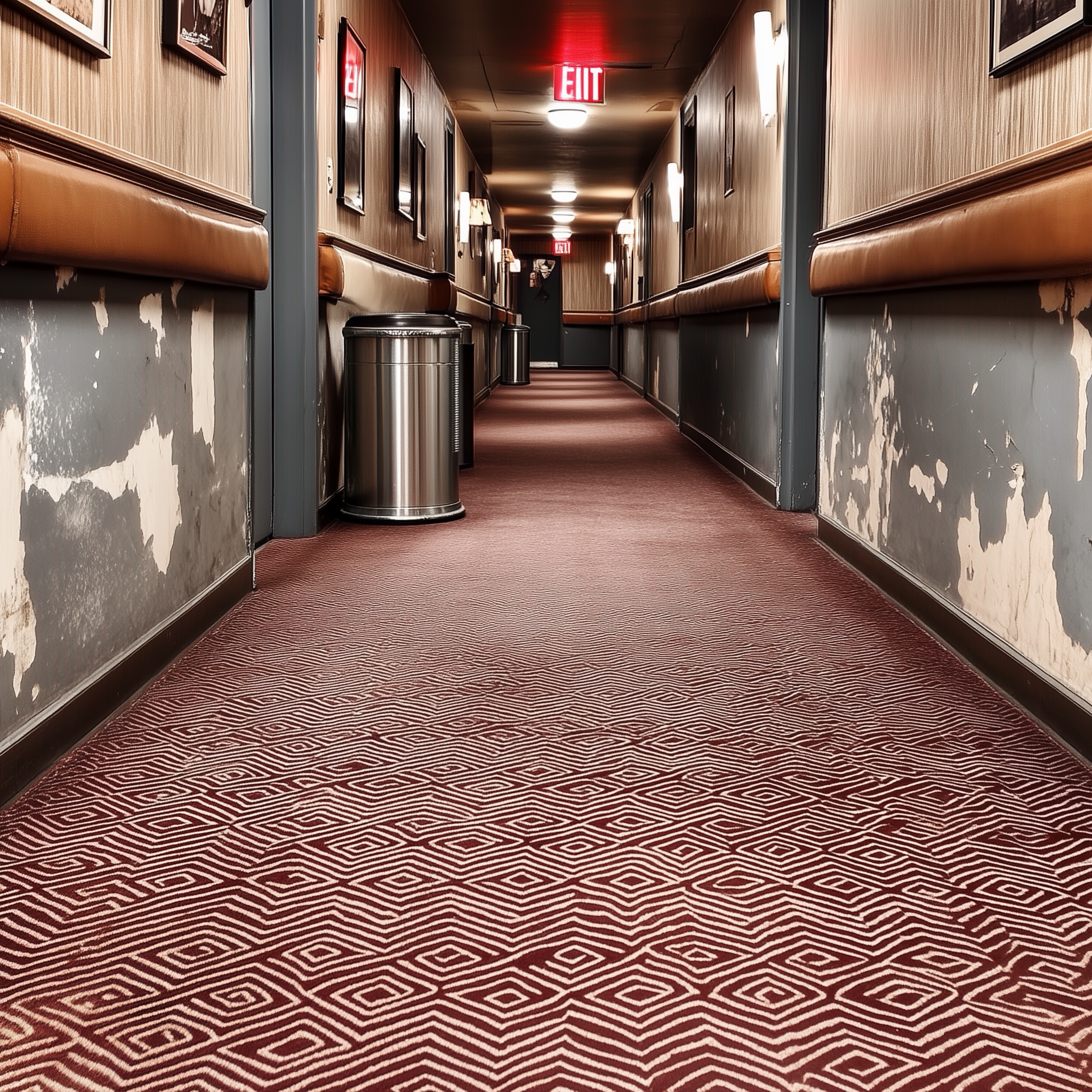 An endless hotel corridor at 3am, identical doors stretching into infinite perspective, worn burgundy carpet with repeating geometric pattern, flickering fluorescent lights casting sickly yellow glow, exit sign glowing red in the distance never getting closer, outdated wallpaper peeling at seams, no windows no people no sound, the feeling of being somewhere between awake and dreaming in a liminal space, eerie/unsettled, lonely, mysterious, nostalgic, subtle unease style, viewed from a eye level shot, wide shot, laboratory lighting lighting, at night, with a horror, retro, surreal vibe, accented by floor lamps, low light, overhead, dramatic shadows, flickering lights, low key light, featuring desaturated colors, warm tones, beige, charcoal gray, gold, dingy colors, faded, retro colors, with textured, weathered leather, worn metal effects --v 7 --ar 1:1 --c 10 --w 200 --s 1000 --q 2
