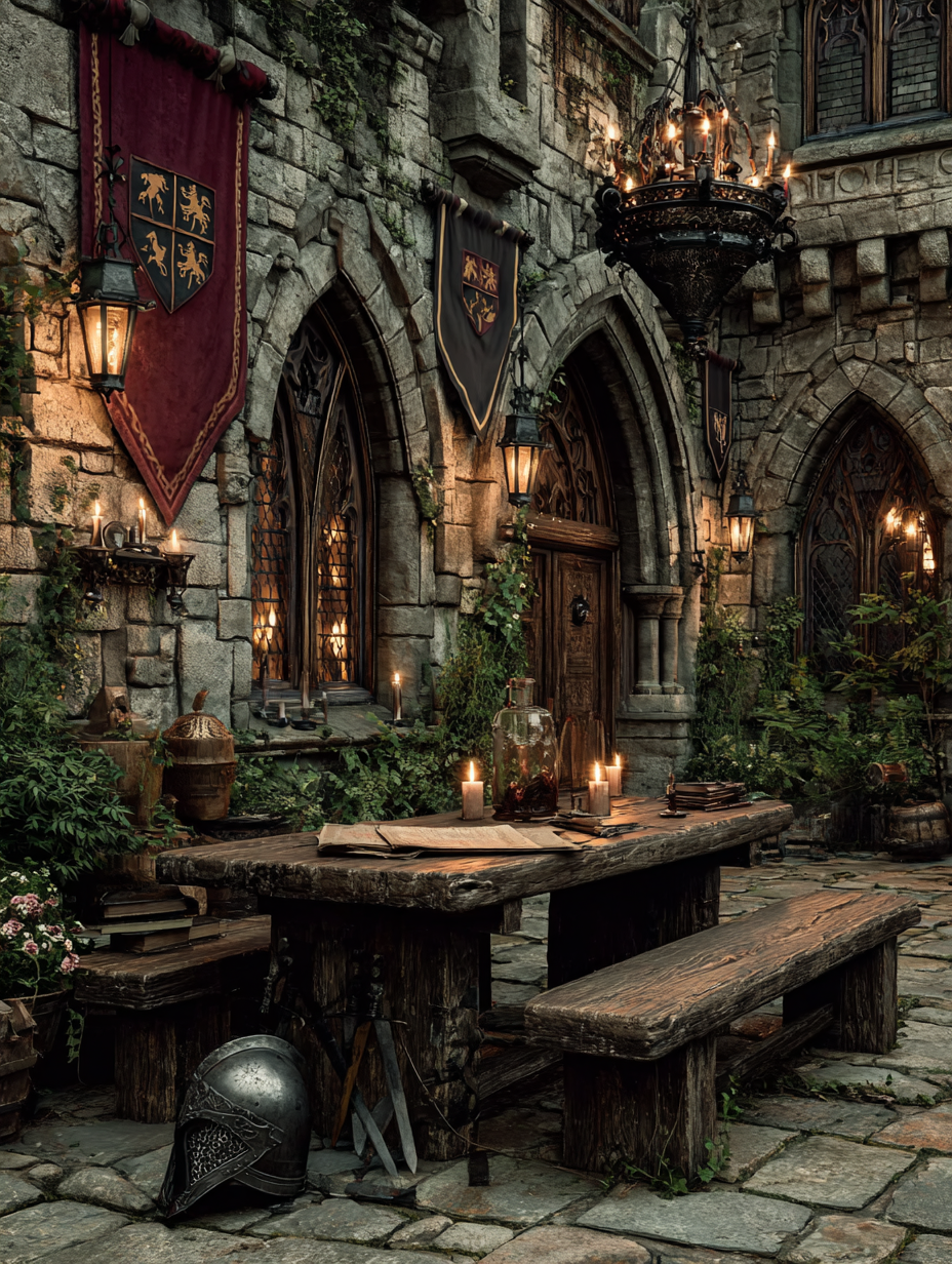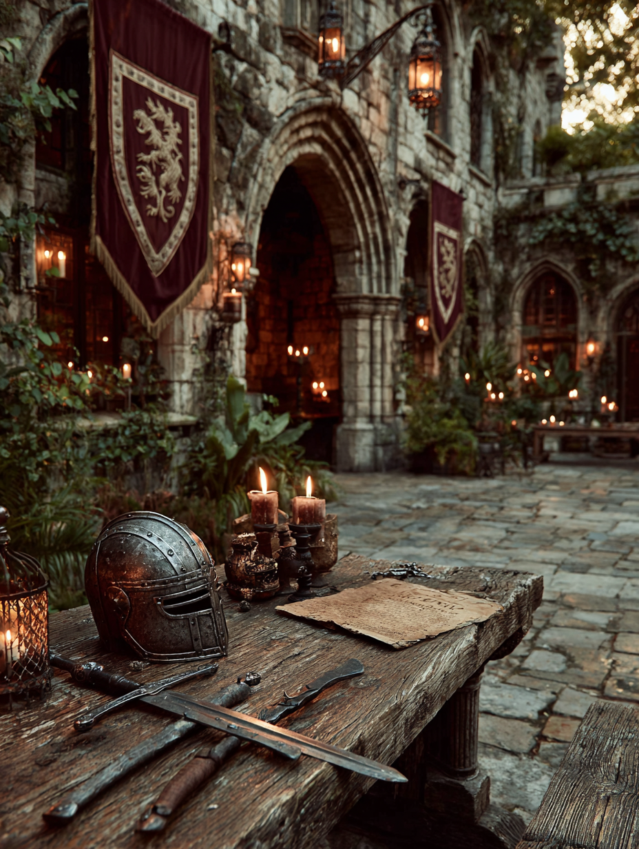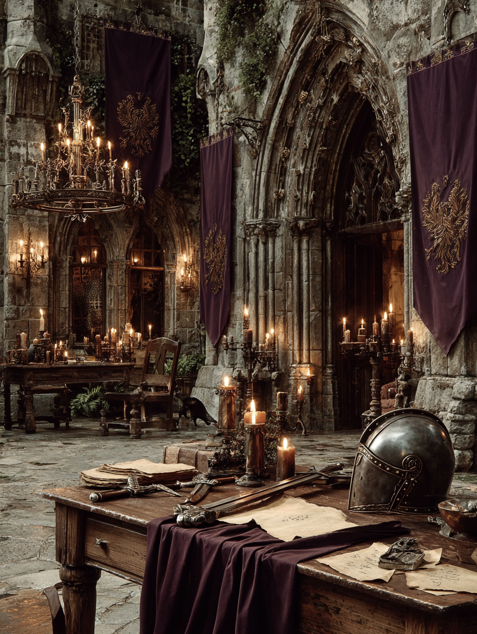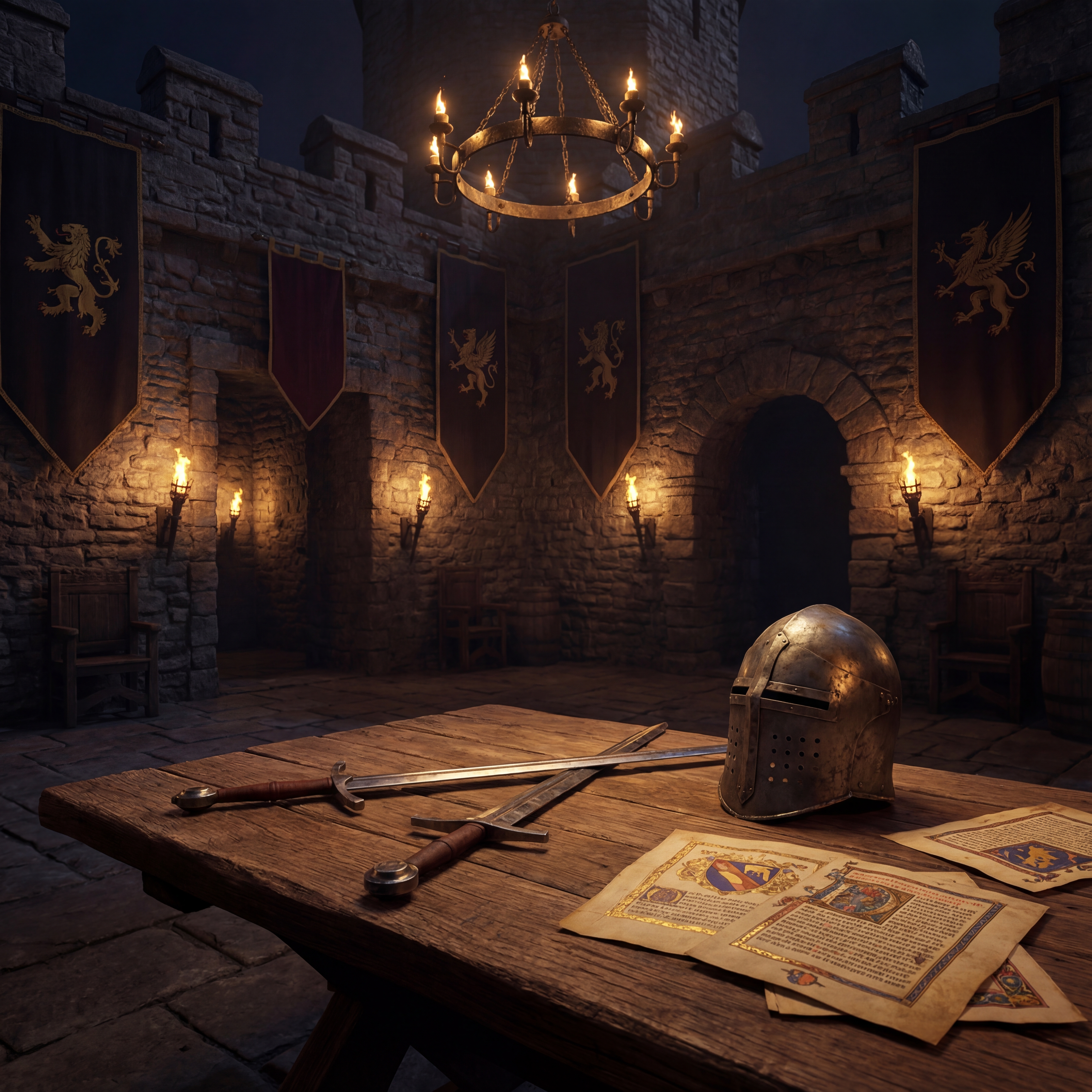 A stone castle courtyard with crossed broadswords and a knight's helmet resting on rough-hewn oak table, flickering torch light, heraldic banners with lions and griffins, illuminated manuscript pages scattered nearby, iron chandelier overhead in a medieval, dramatic, mysterious, regal style, viewed from a eye level shot, medium shot, torchlight lighting, at night, with a dark and moody, gothic, historical vibe, accented by lantern light, low light, warm glow from fire, dramatic shadows, fire light, flickering lights, featuring dark colors, darkened with golden highlights, warm tones, charcoal gray, crimson, gold, saddle brown, dark, gold, warm antique colors, with metallic, stone architecture, weathered stone effects --v 7 --ar 1:1 --c 10 --w 0 --s 750 --sref https://mpm-production-2025.s3.us-east-1.amazonaws.com/prompts/9ofg4y0ticeifi4/images/1764379504140-12-1-25-medieval.png --sw 400 keypromptninja