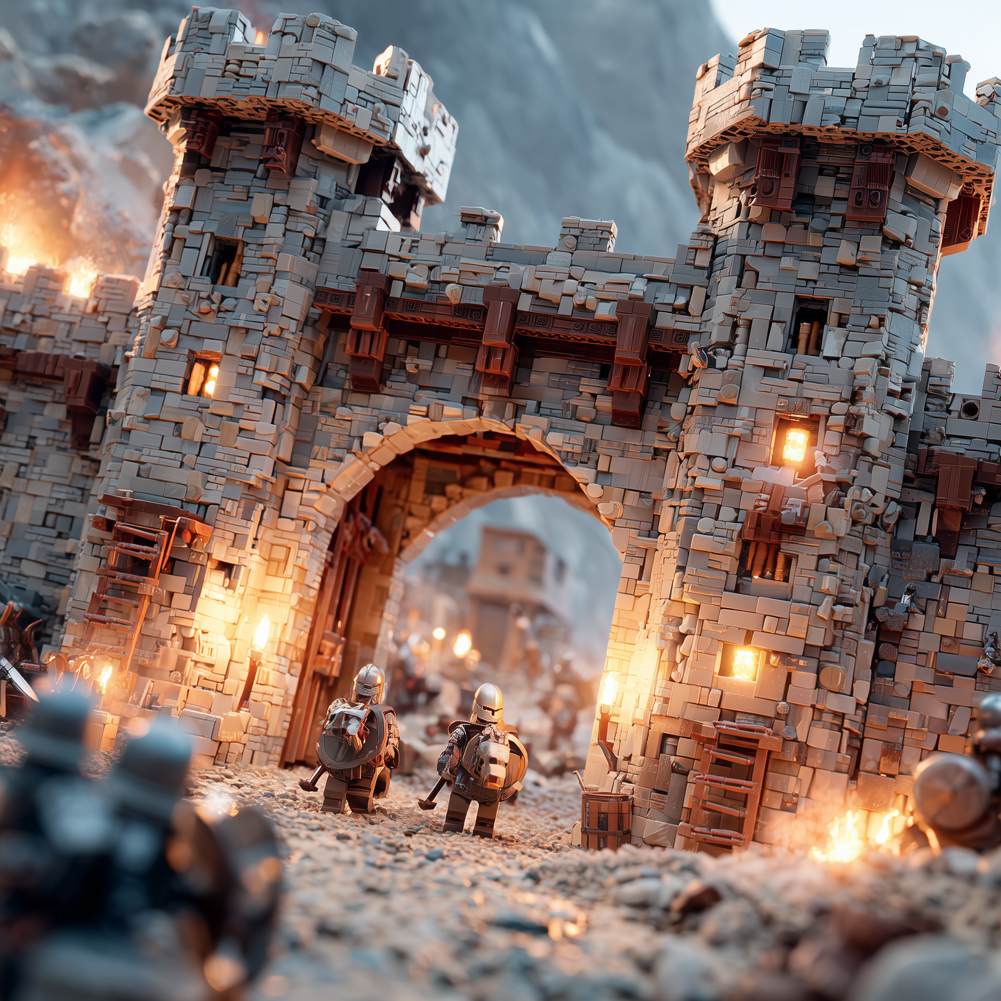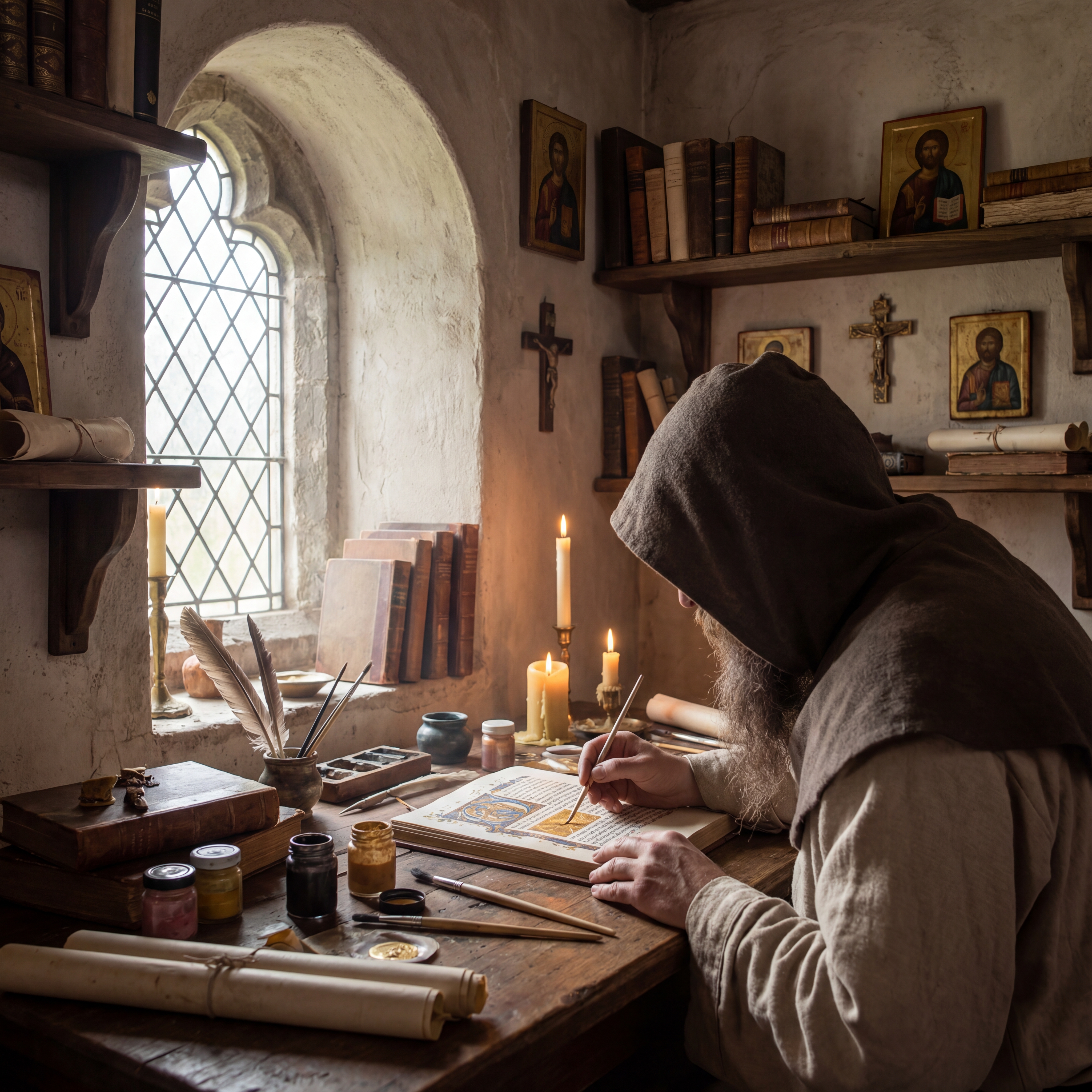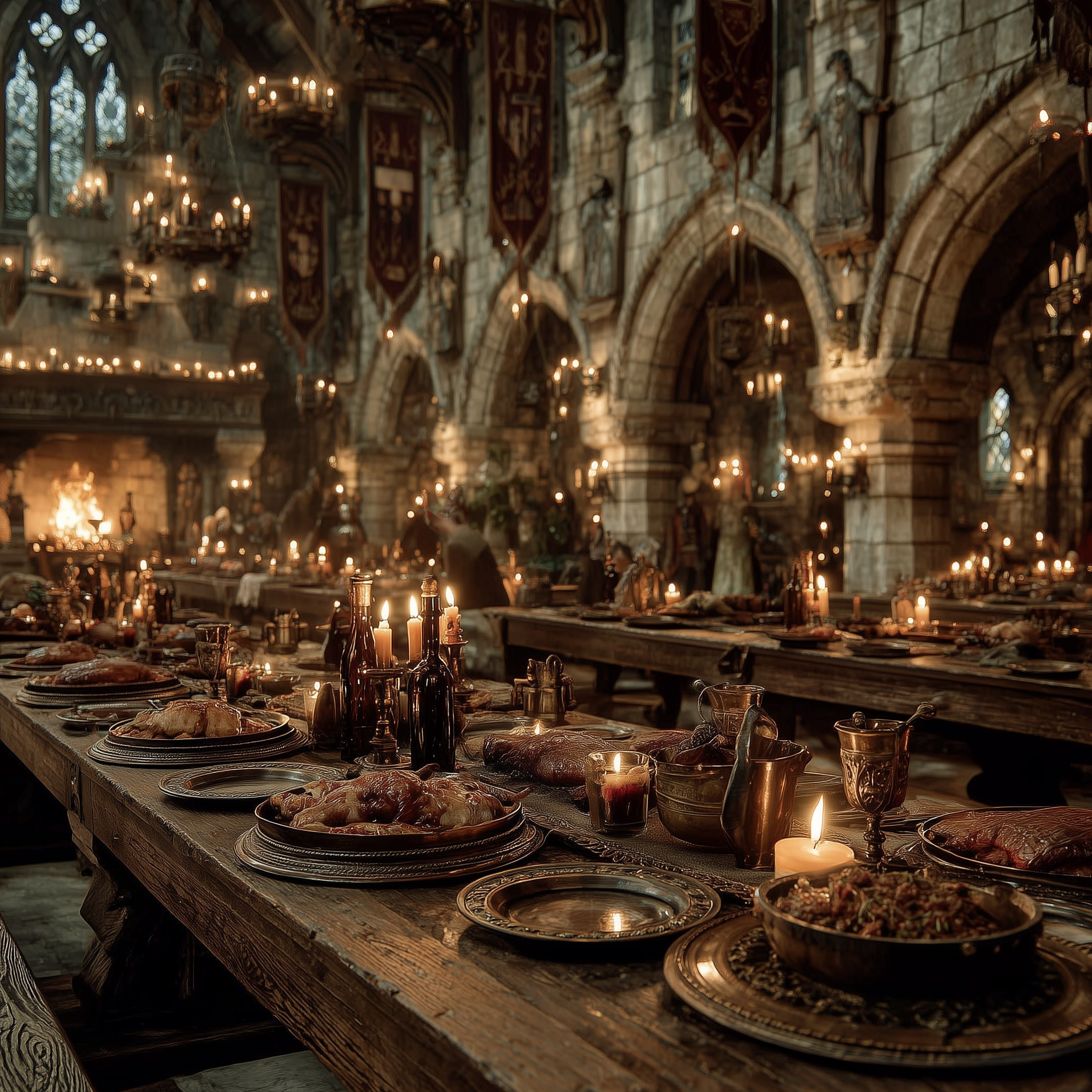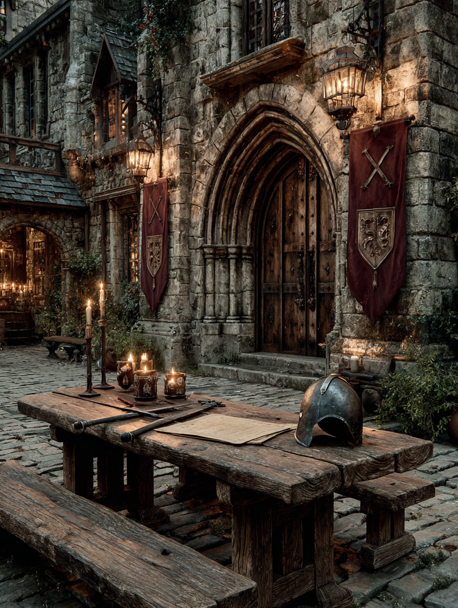 A stone castle courtyard with crossed broadswords and a knight's helmet resting on rough-hewn oak table, flickering torch light, heraldic banners with lions and griffins, illuminated manuscript pages scattered nearby, iron chandelier overhead in a medieval, dramatic, mysterious, regal style, viewed from a eye level shot, medium shot, torchlight lighting, at night, with a dark and moody, gothic, historical vibe, accented by lantern light, low light, warm glow from fire, dramatic shadows, fire light, flickering lights, featuring dark colors, darkened with golden highlights, warm tones, charcoal gray, crimson, gold, saddle brown, dark, gold, warm antique colors, with metallic, stone architecture, weathered stone effects --v 7 --ar 1:1 --c 10 --w 0 --s 750 --sref https://mpm-production-2025.s3.us-east-1.amazonaws.com/prompts/9ofg4y0ticeifi4/images/1764379504140-12-1-25-medieval.png --sw 400 keypromptninja