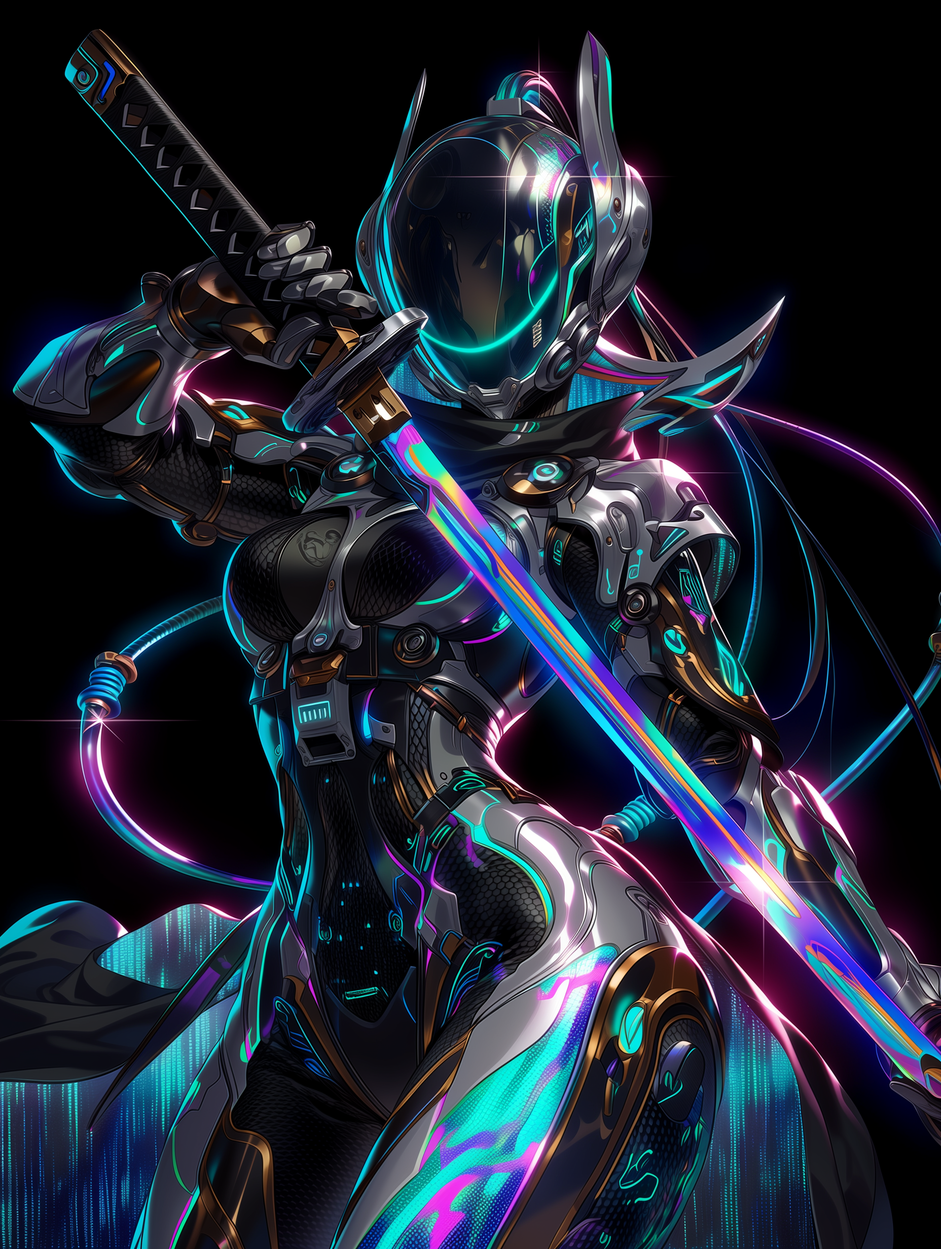 A deadly elegant female assassin ninja in ornate cyberpunk armor, intricate holographic patterns flowing across midnight black tactical suit, neon circuit designs etched into reinforced plating, sleek katana with glowing energy blade at her side, piercing eyes behind advanced HUD visor, graceful combat stance radiating lethal precision, chrome and obsidian details catching neon city lights, fiber-optic cables woven into flowing armored cape in a cyberpunk, elegant, intense, mysterious style, viewed from a medium-shot, low-angle-shot, shot on arri-alexa, backlit-natural lighting, at night, with a cyberpunk, futuristic, elegant vibe, accented by neon-glow, city-lights, rim-lighting, neon-light, glowing-highlights, featuring high-contrast-colors, teal-and-orange, tetrachromatic, cyan, magenta, black, silver, neon, bold, with metallic, glossy, carbon-fiber, glossy-reflection, polished, electroluminescence, glowing-neon --niji 7 --ar 3:4 --c 0 --w 0 --s 250 keypromptninja