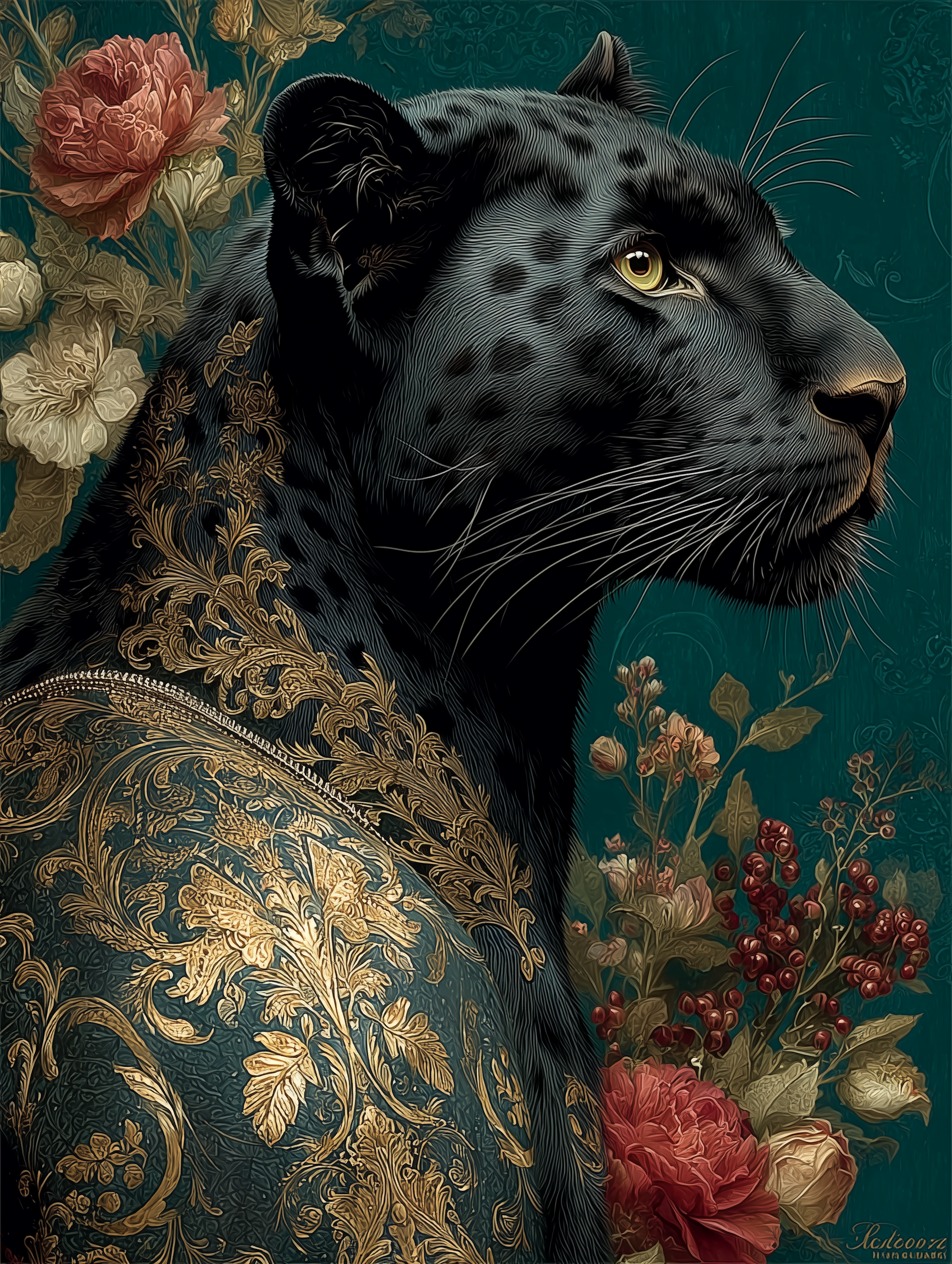 https://dhzkdndgolte1.cloudfront.net/eyJidWNrZXQiOiJtcG0tcHJvZHVjdGlvbi0yMDI1Iiwia2V5IjoicHJvbXB0cy8zNGs3YmlqZnJzajd3cjUvaW1wb3J0cy8xNzcwNzg0ODk0ODU0LXkwcjc4eC5wbmciLCJlZGl0cyI6eyJxdWFsaXR5Ijo5NX19 https://dhzkdndgolte1.cloudfront.net/eyJidWNrZXQiOiJtcG0tcHJvZHVjdGlvbi0yMDI1Iiwia2V5IjoiZ2VuZXJhdGVkLWltYWdlcy82cmtmNTFkNnBzYjRka28vOTNmZnNqb3ZkaHoycHhqLzE3NzA3ODUyMzE3NjMtMC5wbmciLCJlZGl0cyI6eyJxdWFsaXR5Ijo5NX19 Ultra-photorealistic side profile portrait of a majestic black panther with piercing golden-amber eyes and sleek obsidian fur showing intricate rosette patterns, adorned with elaborate three-dimensional baroque gold jewelry featuring raised filigree work, ornate scrollwork with visible depth and shadow, textured metallic surfaces catching light, dimensional gemstone settings, and delicate chain details, surrounded by hyper-realistic peonies, chrysanthemums, and botanical elements with visible petal texture and natural imperfections, museum-quality lifelike composition against a rich deep teal jewel-toned background with subtle texture in a photorealism, majestic, elegant, powerful style, viewed from a profile-shot, medium-close-up-shot, shot on hasselblad-x1d, soft-morning-light, diffused-sunlight lighting, at morning, with a elegant, luxurious, classic vibe, accented by natural-light, key-light, specular-highlights, soft-shadows, bright-highlights, featuring vibrant-colors, high-contrast-colors, pentachromatic, gold, teal, black, amber, burgundy, jewel-tones, bold, with fur, metallic, organic, polished, glossy-reflection, polished-reflection, specular-highlights, subtle-glow --v 7 --ar 3:4 --c 0 --w 0 --q 1 --s 150 keypromptninja
