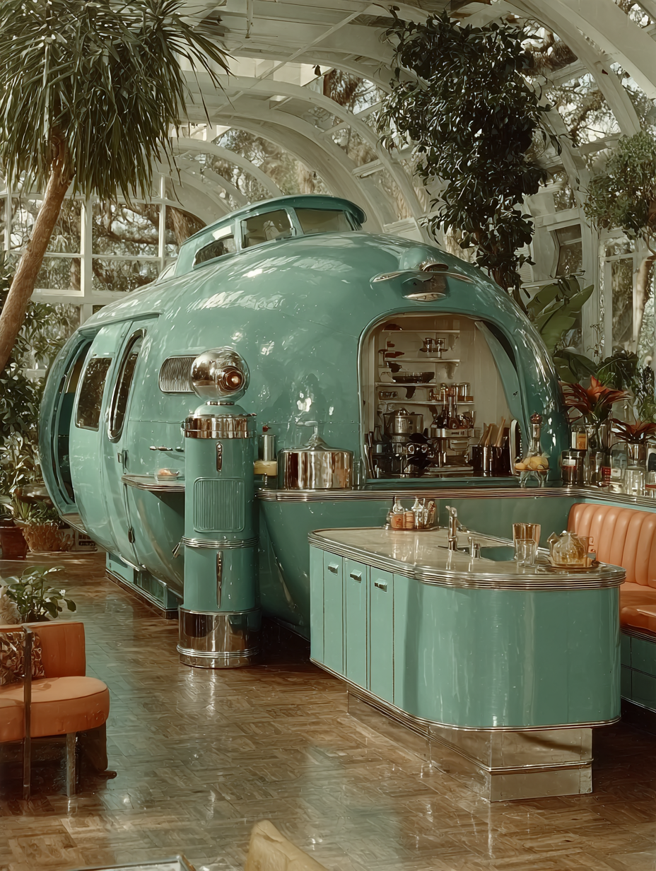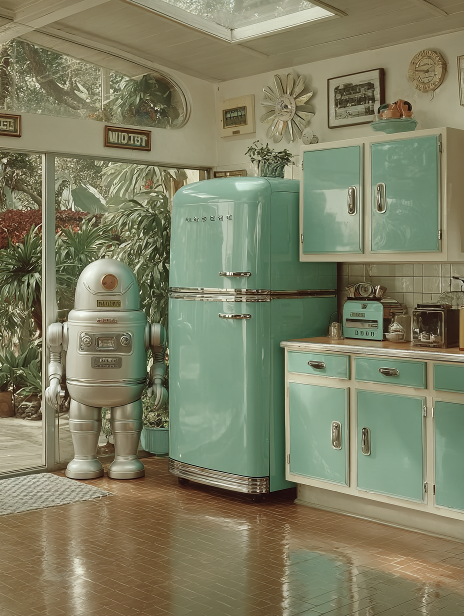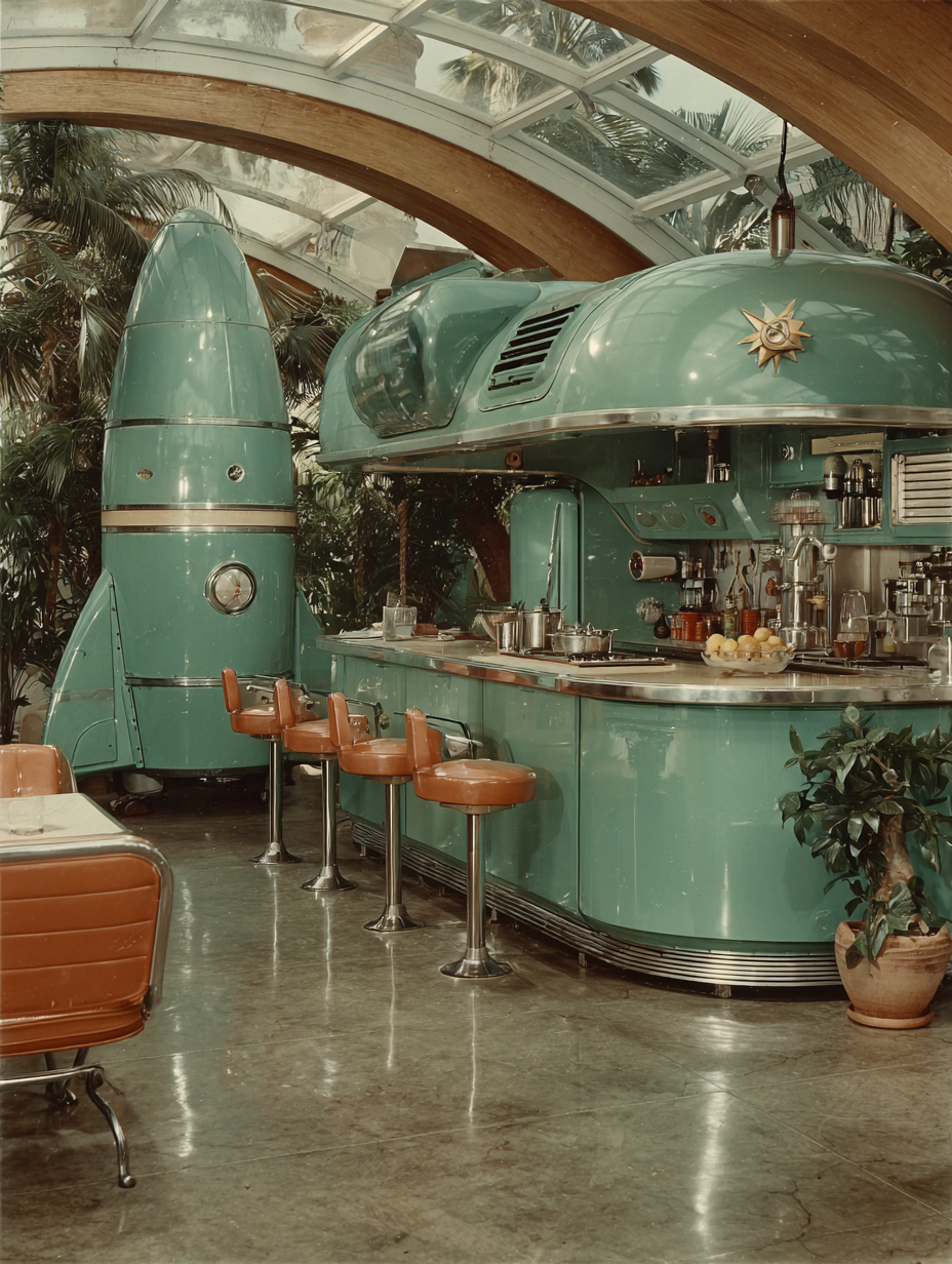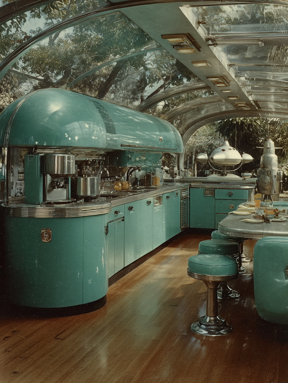 A chrome and turquoise kitchen of tomorrow with bubble-domed appliances, ray gun on Formica counter, atomic starburst clock, a robot servant in sleek metallic casing, rocket ship visible through curved picture window, optimistic 1950s future in a atompunk, hopeful, nostalgic, playful style, viewed from a interior view, wide shot, diffused sunlight, sunny lighting, at morning, with a futuristic, playful, retro vibe, accented by natural light, skylights, bright highlights, reflection, featuring bright colors, saturated colors, vibrant colors, coral, mint, turquoise, colorful, pastel, retro colors, with metallic, reflective, shimmering, glossy reflection, polished reflection, shiny effects --v 7 --ar 1:1 --c 10 --w 0 --s 750 --sref https://mpm-production-2025.s3.us-east-1.amazonaws.com/prompts/gd23afgz2bbqksb/images/1764381604482-12-6-25-atompunk.png --sw 400 keypromptninja