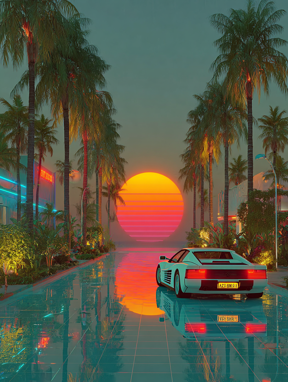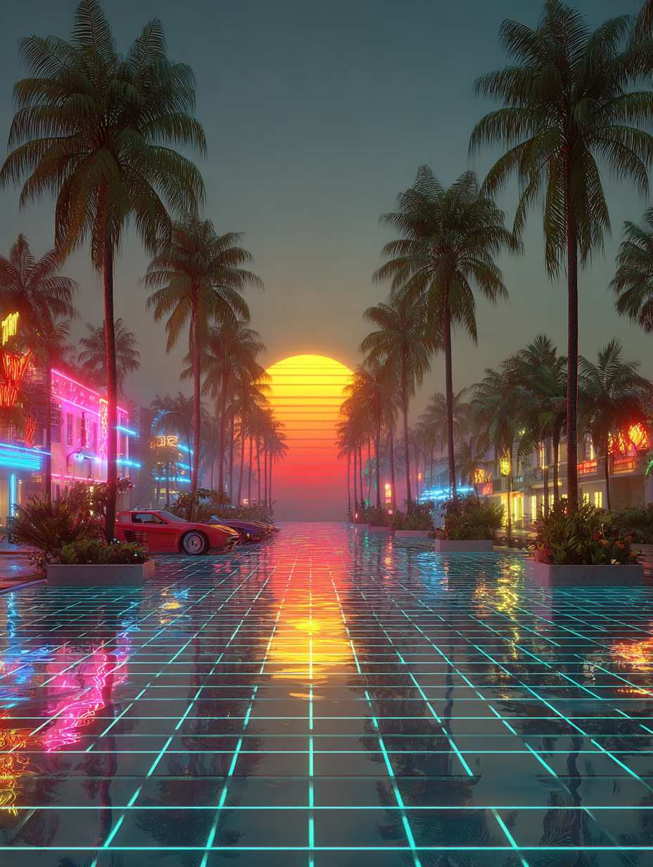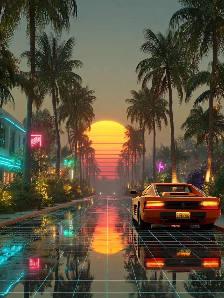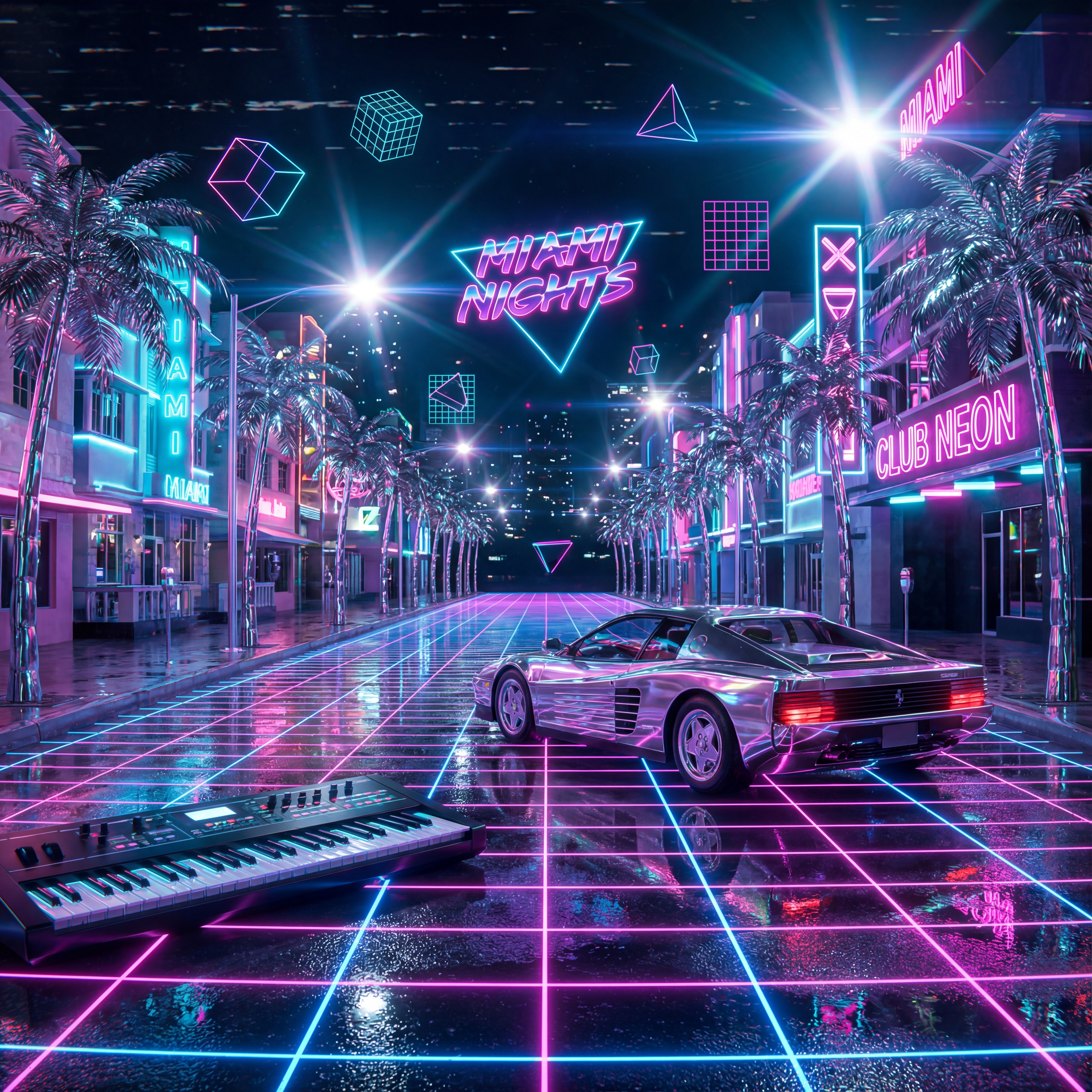 A neon-drenched Miami nightclub scene, hot pink and electric blue grid lines, chrome palm trees, Ferrari Testarossa reflection, geometric shapes floating in space, VHS tracking lines, synthesizer keyboard with glowing keys in a 1980s retro, energetic, nostalgic, vibrant style, viewed from a dramatic framing, wide shot, rainy night lighting, at night, with a energetic, retro, urban vibe, accented by city lights, neon glow, streetlights, lens flare, neon light, reflection, featuring high-contrast colors, saturated colors, vibrant colors, cyan, electric blue, magenta, neon pink, bold, colorful, neon colors, with metallic, reflective, shimmering, glossy reflection, reflection, specular highlights effects --v 7 --ar 1:1 --c 10 --w 0 --s 750 --sref https://mpm-production-2025.s3.us-east-1.amazonaws.com/prompts/5o7oivgazb8uzj9/images/1765139642953-mid-1.png --sw 400