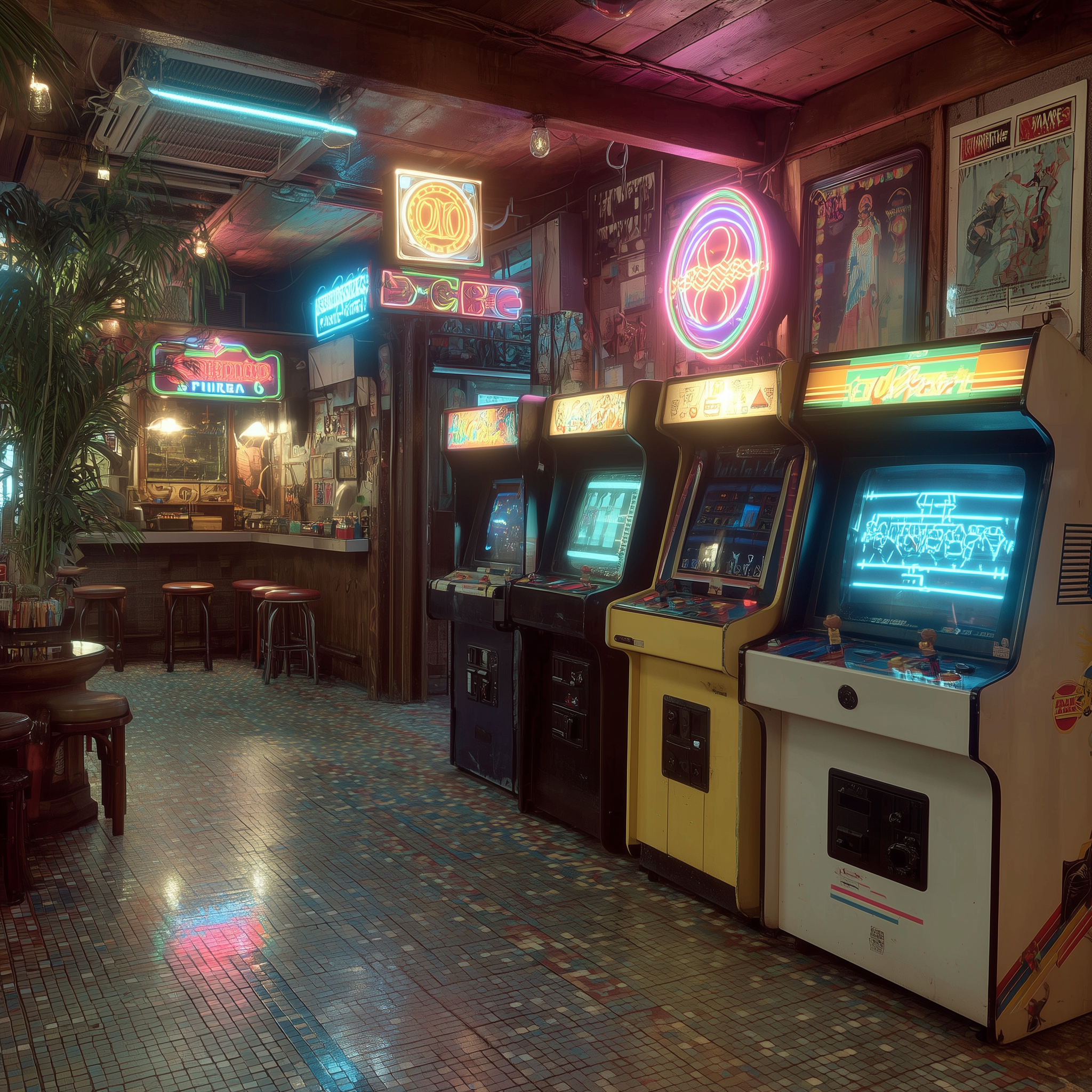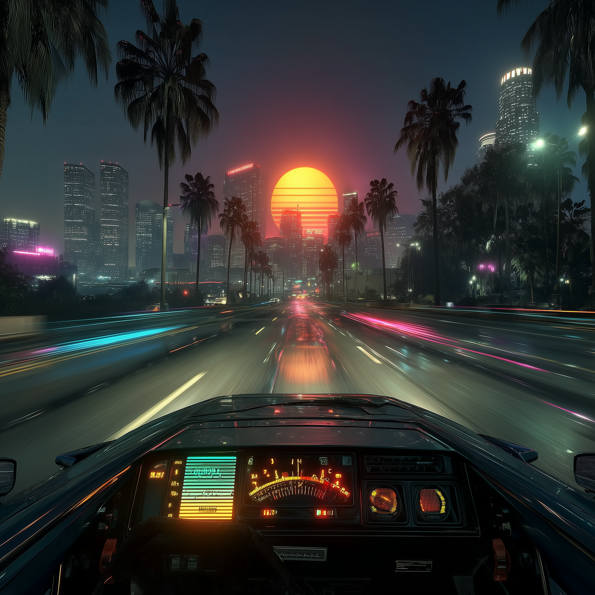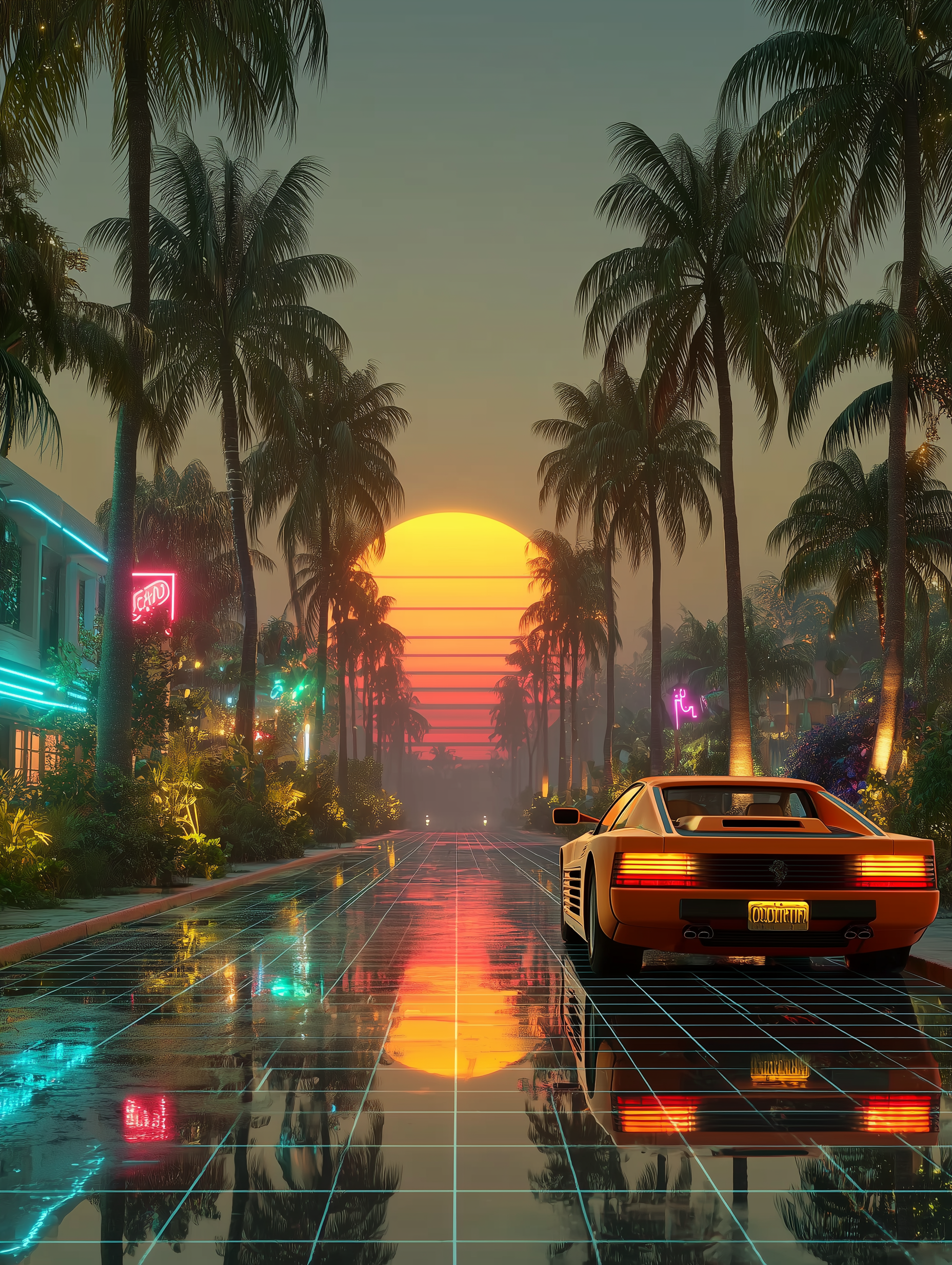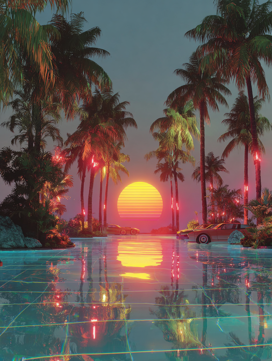 A neon-drenched Miami nightclub scene, hot pink and electric blue grid lines, chrome palm trees, Ferrari Testarossa reflection, geometric shapes floating in space, VHS tracking lines, synthesizer keyboard with glowing keys in a 1980s retro, energetic, nostalgic, vibrant style, viewed from a dramatic framing, wide shot, rainy night lighting, at night, with a energetic, retro, urban vibe, accented by city lights, neon glow, streetlights, lens flare, neon light, reflection, featuring high-contrast colors, saturated colors, vibrant colors, cyan, electric blue, magenta, neon pink, bold, colorful, neon colors, with metallic, reflective, shimmering, glossy reflection, reflection, specular highlights effects --v 7 --ar 1:1 --c 10 --w 0 --s 750 --sref https://mpm-production-2025.s3.us-east-1.amazonaws.com/prompts/5o7oivgazb8uzj9/images/1765139642953-mid-1.png --sw 400