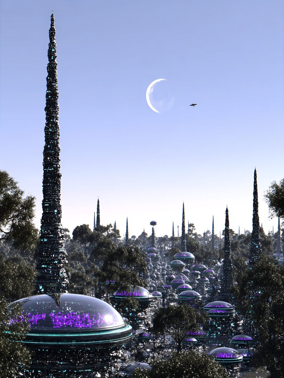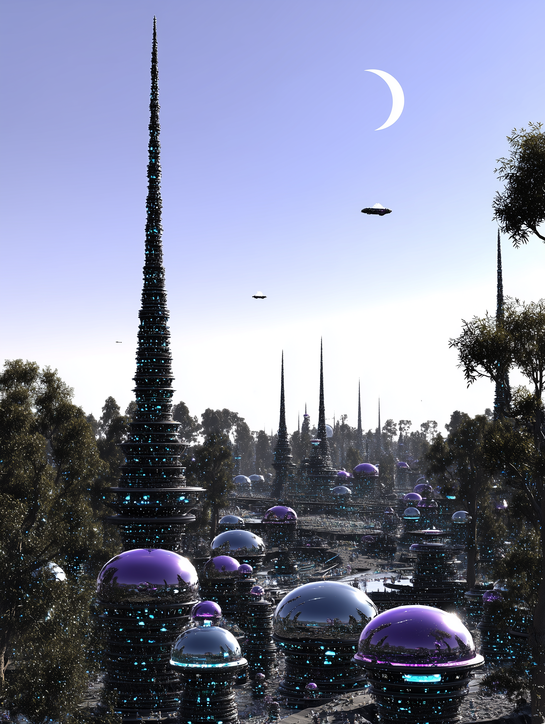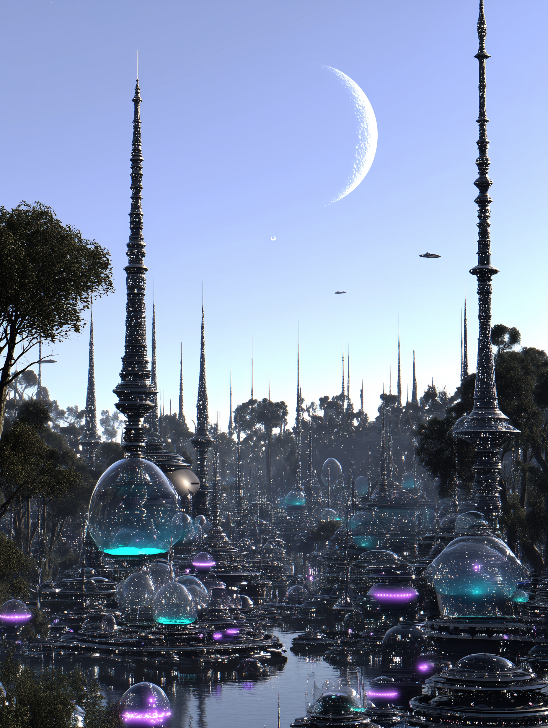 Alien biodomes on an exotic planet landscape, crescent moon in the sky, cinematic sci-fi environment with vibrant otherworldly atmosphere, advanced architecture rising from exotic terrain in a sci-fi, awe inspiring, majestic style, viewed from a aerial shot, low angle shot, wide shot, diffused sunlight, sunny lighting, at afternoon, with a cinematic, futuristic, minimalist, modern vibe, accented by atmospheric light, skylights, spacecraft glow, bright highlights, subtle glow, volumetric lighting, featuring cool tones, saturated colors, vibrant colors, blue, cyan, silver, violet, white, cool, space colors, with reflective, transparent, atmospheric scatter, glossy reflection, polished reflection, shimmering effects --v 7 --ar 3:4 --c 20 --s 600 --style raw --sref https://dhzkdndgolte1.cloudfront.net/eyJidWNrZXQiOiJtcG0tcHJvZHVjdGlvbi0yMDI1Iiwia2V5IjoicHJvbXB0cy81dmp4bzgwZnZrMTFhbHovaW1hZ2VzLzE3NjIxODk4Nzg1NjMtMTEtMy0yNS1iaW9kb21lcy5wbmciLCJlZGl0cyI6eyJyZXNpemUiOnsid2lkdGgiOjgwMCwiaGVpZ2h0Ijo2MDAsImZpdCI6Imluc2lkZSJ9LCJxdWFsaXR5Ijo4NX19 --sw 600 sparker888