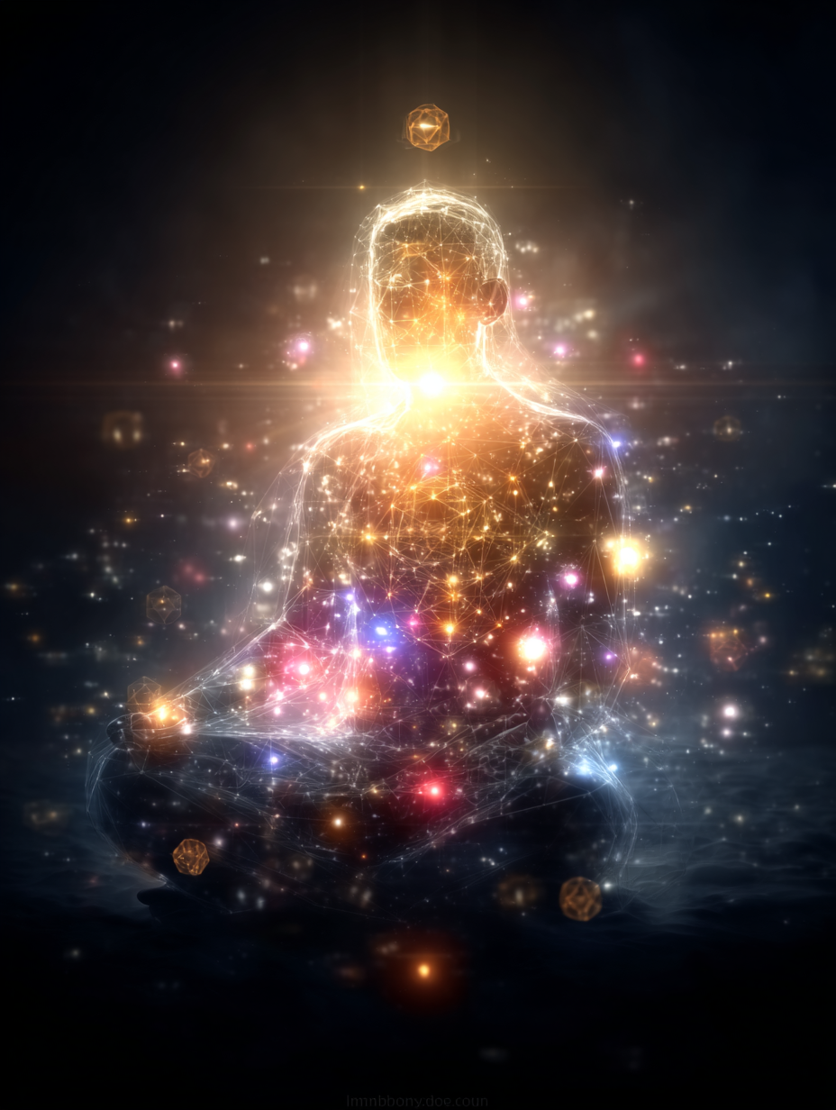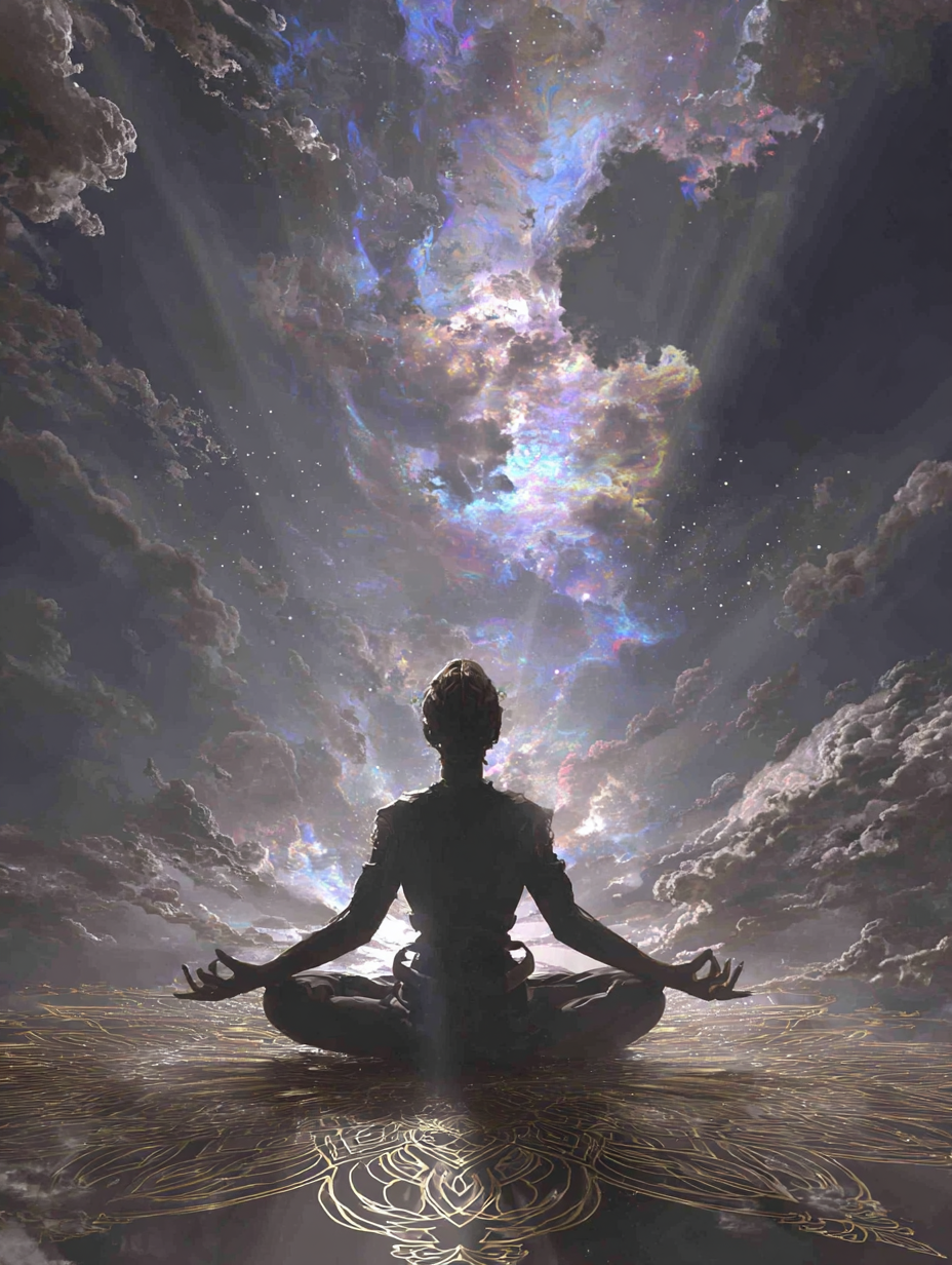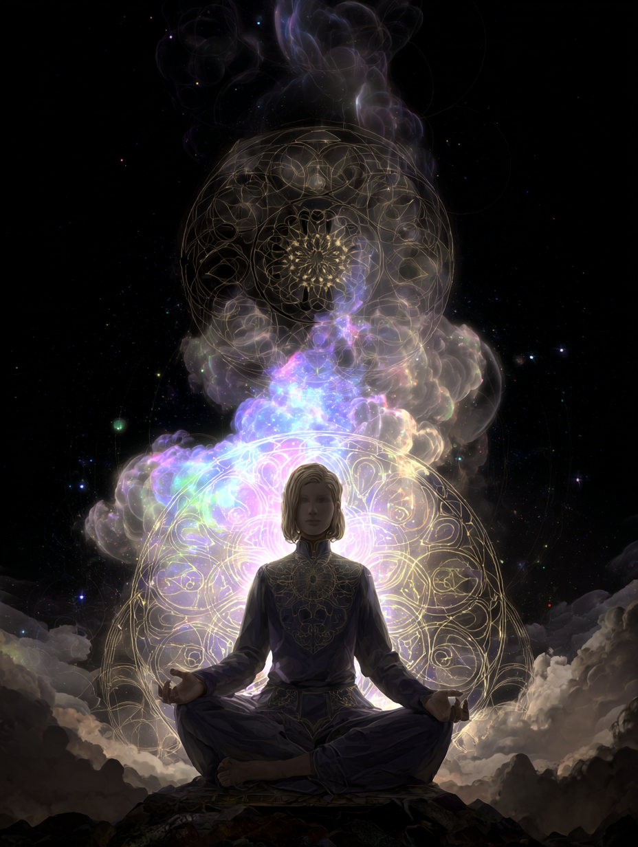 A figure meditating in lotus position floating in an infinite cosmic void, surrounded by sacred geometry patterns, ethereal light emanating from within, fragments of reality dissolving into geometric shapes, celestial bodies and nebulas in the background, interconnected energy streams flowing through space in a metaphysical art, contemplative, ethereal, mystical, transcendent style, viewed from a eye level shot, medium shot, with a cosmic grandeur, ethereal, mystical vibe, accented by atmospheric light, nebular glow, ethereal light, glowing highlights, god rays, subsurface-scattering, volumetric lighting, featuring gradient colors, vibrant colors, vibrant with gradiet transitions, polychromatic, cyan, gold, indigo, violet, white colors, with energy trails, luminance, translucent, dispersion, iridescent, rainbow, glowing, luminescence, phosphorescence, radiant effects --v 7 --ar 3:4 --c 15 --s 500 --sref https://dhzkdndgolte1.cloudfront.net/eyJidWNrZXQiOiJtcG0tcHJvZHVjdGlvbi0yMDI1Iiwia2V5IjoicHJvbXB0cy82a2U2cnk1cDBudmRya2YvaW1hZ2VzLzE3NjIzNzYzMTMyMzktMTEtNS0yNS1sb3R1cy5wbmciLCJlZGl0cyI6eyJyZXNpemUiOnsid2lkdGgiOjgwMCwiaGVpZ2h0Ijo2MDAsImZpdCI6Imluc2lkZSJ9LCJxdWFsaXR5Ijo4NX19 --sw 400 --w 0