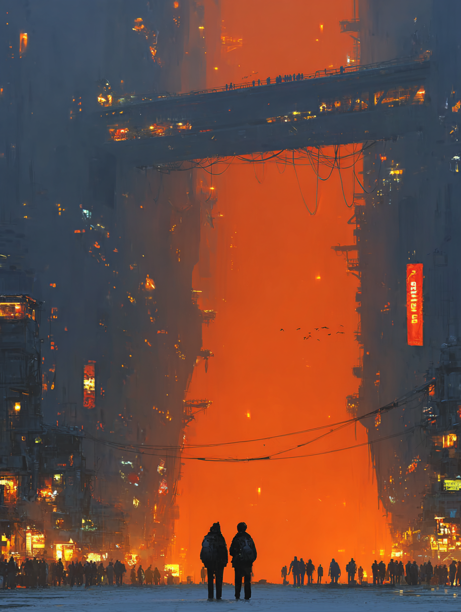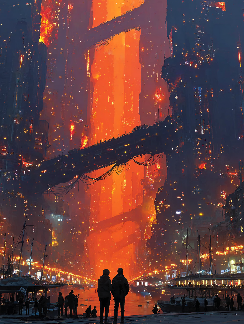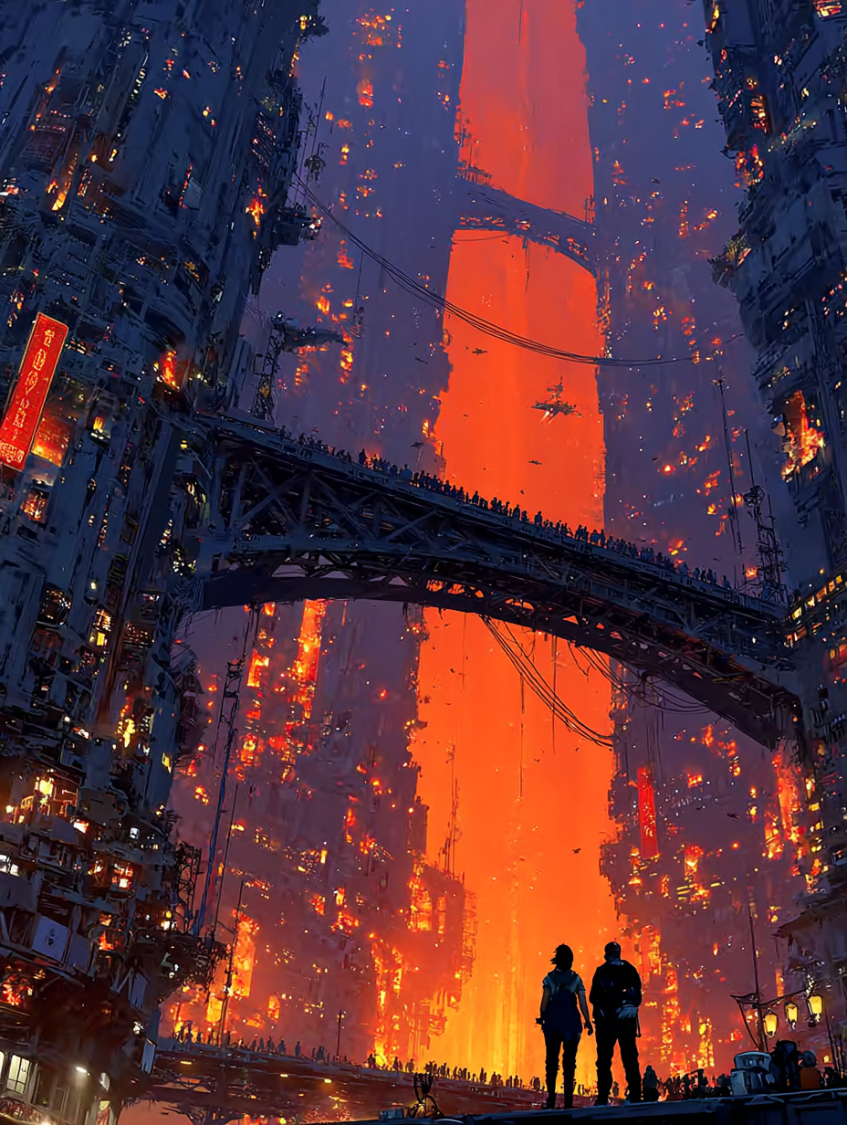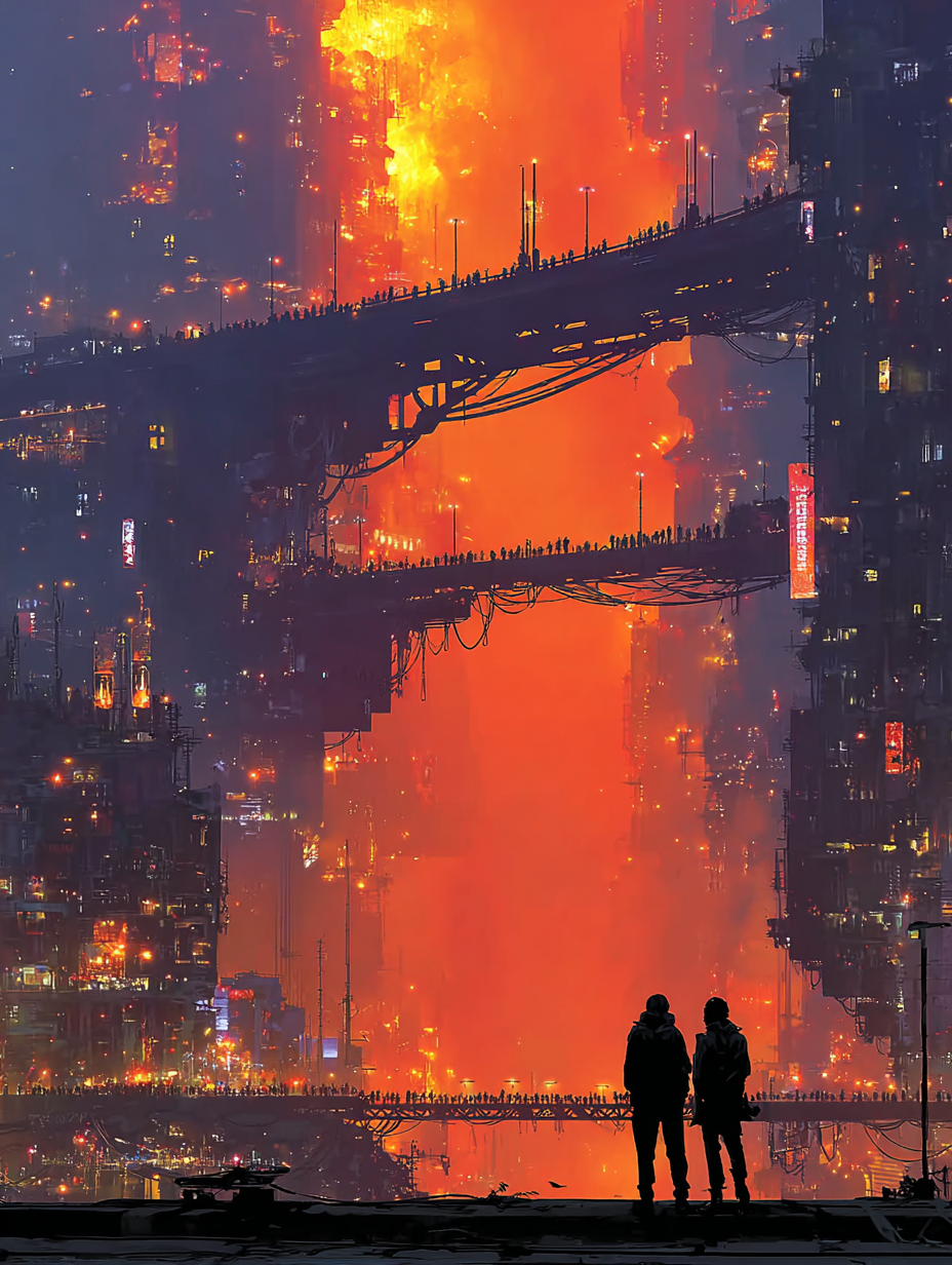 Massive futuristic industrial city with towering interconnected structures and platforms, dramatic vertical architecture reaching into the sky, intense orange and amber flames illuminating metallic buildings, two figures standing in foreground viewing the vast cityscape, intricate mechanical details and cables connecting buildings, dystopian sci-fi atmosphere, dark blue-grey structures contrasting with brilliant fire-orange lighting, multiple levels of platforms and walkways, crowds of silhouetted people in the distance, smoke and atmospheric haze, cinematic composition in a sci-fi, awe inspiring, dramatic, mysterious style, viewed from a establishing shot, low angle shot, wide shot, dusk, twilight lighting, at dusk, with a cinematic, futuristic, industrial, massive scale, sci-fi vibe, accented by atmospheric haze, city lights, neon glow, warm glow from fire, atmospheric particles, dramatic highlights, dramatic shadows, fire light, god rays, high contrast, volumetric lighting, featuring cool tones, darkened with golden highlights, high-contrast colors, vibrant highlights, warm tones, complementary colors, amber, charcoal gray, dark orange, fiery orange, navy, orange, sunset-rayleigh-scattering, warm colors, with corrugated, massive, metallic, smoke, steam, atmospheric haze, matte and weathered surfaces, bioluminescence, glowing, radiant, subtle glow effects --v 7 --ar 3:4 --s 800 --style raw --sref https://dhzkdndgolte1.cloudfront.net/eyJidWNrZXQiOiJtcG0tcHJvZHVjdGlvbi0yMDI1Iiwia2V5IjoicHJvbXB0cy82eGd2eHcyOWoydG9jcWQvaW1hZ2VzLzE3NjE2NjY4NDczMDUtMTAtMjgtMjUtY2l0eS5wbmciLCJlZGl0cyI6eyJyZXNpemUiOnsid2lkdGgiOjgwMCwiaGVpZ2h0Ijo2MDAsImZpdCI6Imluc2lkZSJ9LCJxdWFsaXR5Ijo4NX19 --sw 400 gogravital