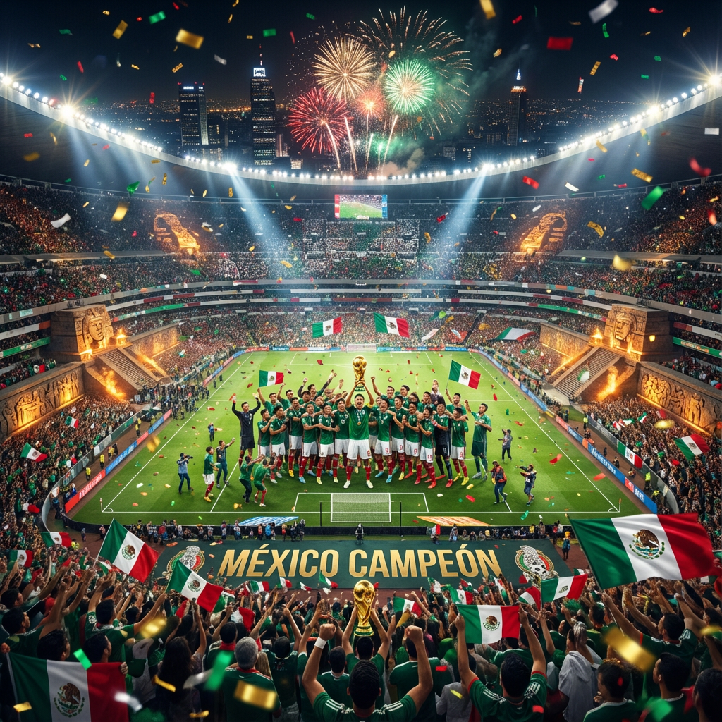 Estadio Azteca erupts in thunderous celebration as Mexico lifts the FIFA World Cup trophy, sea of green jerseys and Mexican flags waving throughout packed stadium, confetti raining down in gold and green, players embracing on pitch surrounded by euphoric fans, massive tricolor banners draped across stands, fireworks illuminating the Mexico City skyline, Aztec-inspired stadium architecture framing the historic moment, passionate crowd singing with tears of joy, cultural pride radiating through every corner of the sacred football temple, 5, text, contemporary-art, night, polychromatic, euphoric, joyful, passionate, triumphant, establishing-shot, high-angle-shot, wide-shot, cinematic, energetic, urban, city-lights, spotlight, bright-highlights, dramatic-highlights, lens-flare, high-contrast-colors, vibrant-colors, warm-tones, bold, warm, metallic, glare, glossy-reflection, glowing, radiant, gold, green, red, white --ar 16:9 --v 7 --q 1 --s 200 --c 15 --w 0 keypromptninja