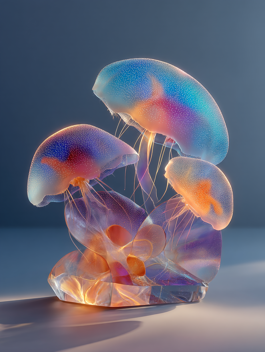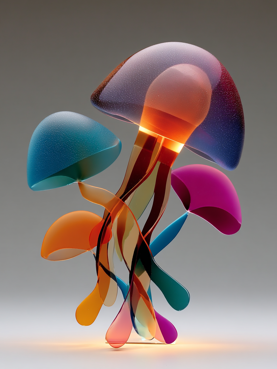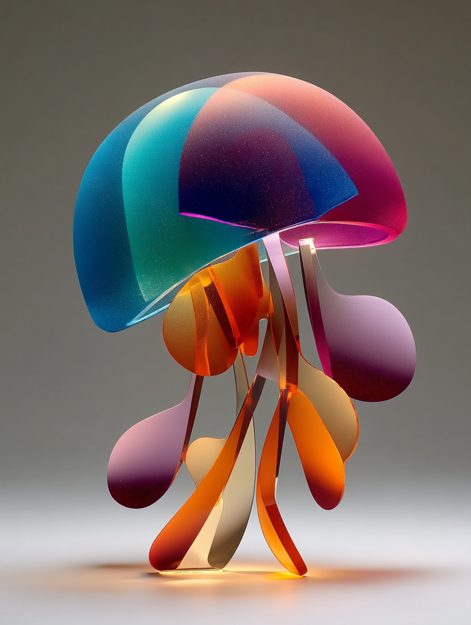 cosmic jellyfish, frosted glass and acrylic sculpture, rounded forms, minimal details, vibrant layered coloured gradient shapes, studio lighting in a minimalist/abstract, ethereal, whimsical style, diffused sunlight lighting, with a elegant, minimalist vibe, accented by spotlight, featuring vibrant colors, vibrant with gradiet transitions, cyan, magenta, orange, purple colors, with frosted glass, translucent, glossy, specular highlights effects --v 7 --ar 3:4 --c 0 --w 0 --s 300 --q 2 --sref 4095131043 sparker888