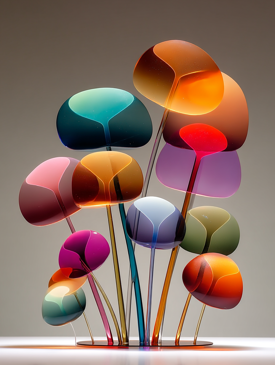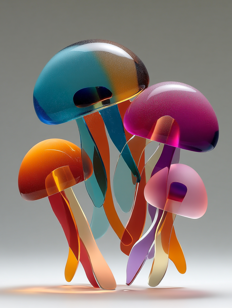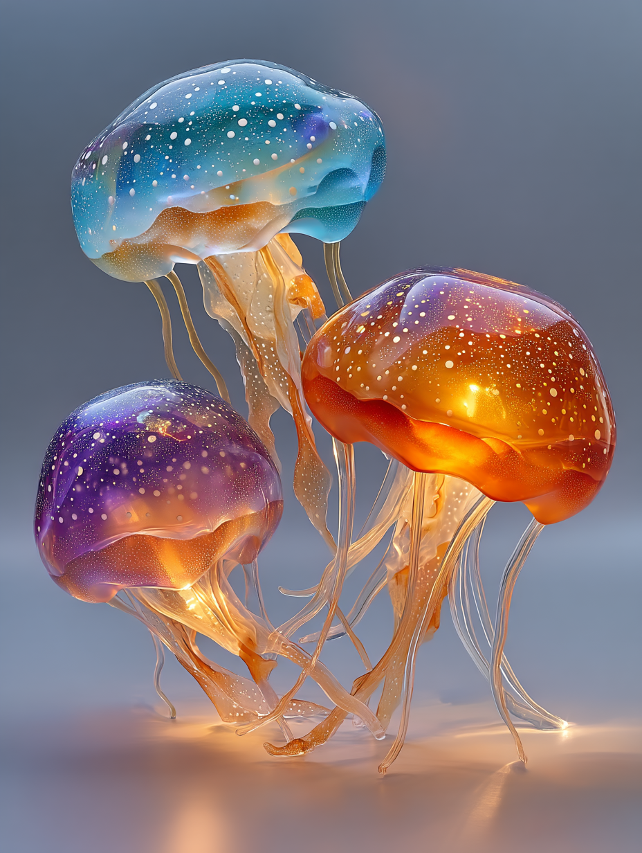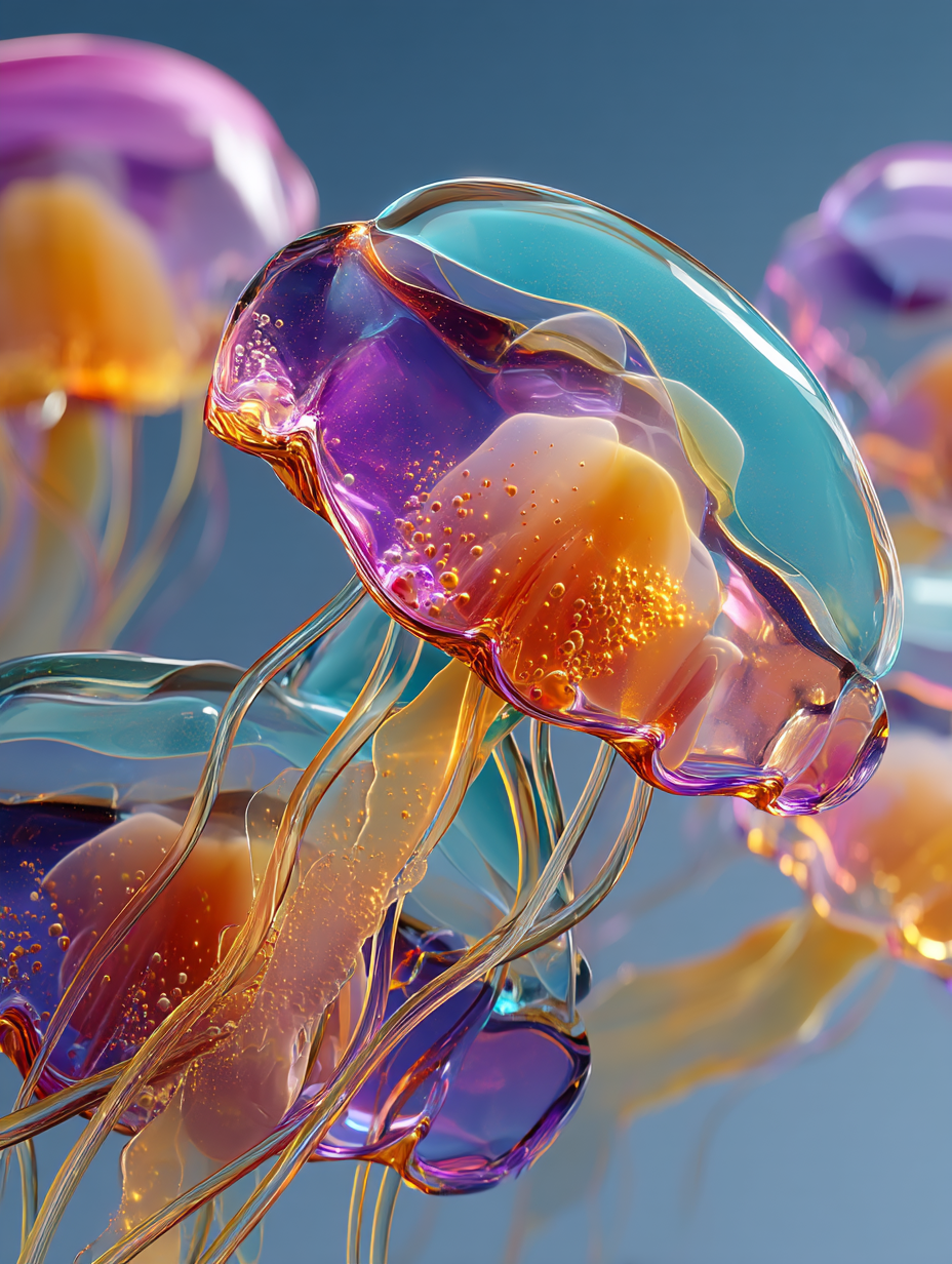 cosmic jellyfish, frosted glass and acrylic sculpture, rounded forms, minimal details, vibrant layered coloured gradient shapes, studio lighting in a minimalist/abstract, ethereal, whimsical style, diffused sunlight lighting, with a elegant, minimalist vibe, accented by spotlight, featuring vibrant colors, vibrant with gradiet transitions, cyan, magenta, orange, purple colors, with frosted glass, translucent, glossy, specular highlights effects --v 7 --ar 3:4 --c 0 --w 0 --s 300 --q 2 --sref 4095131043 sparker888