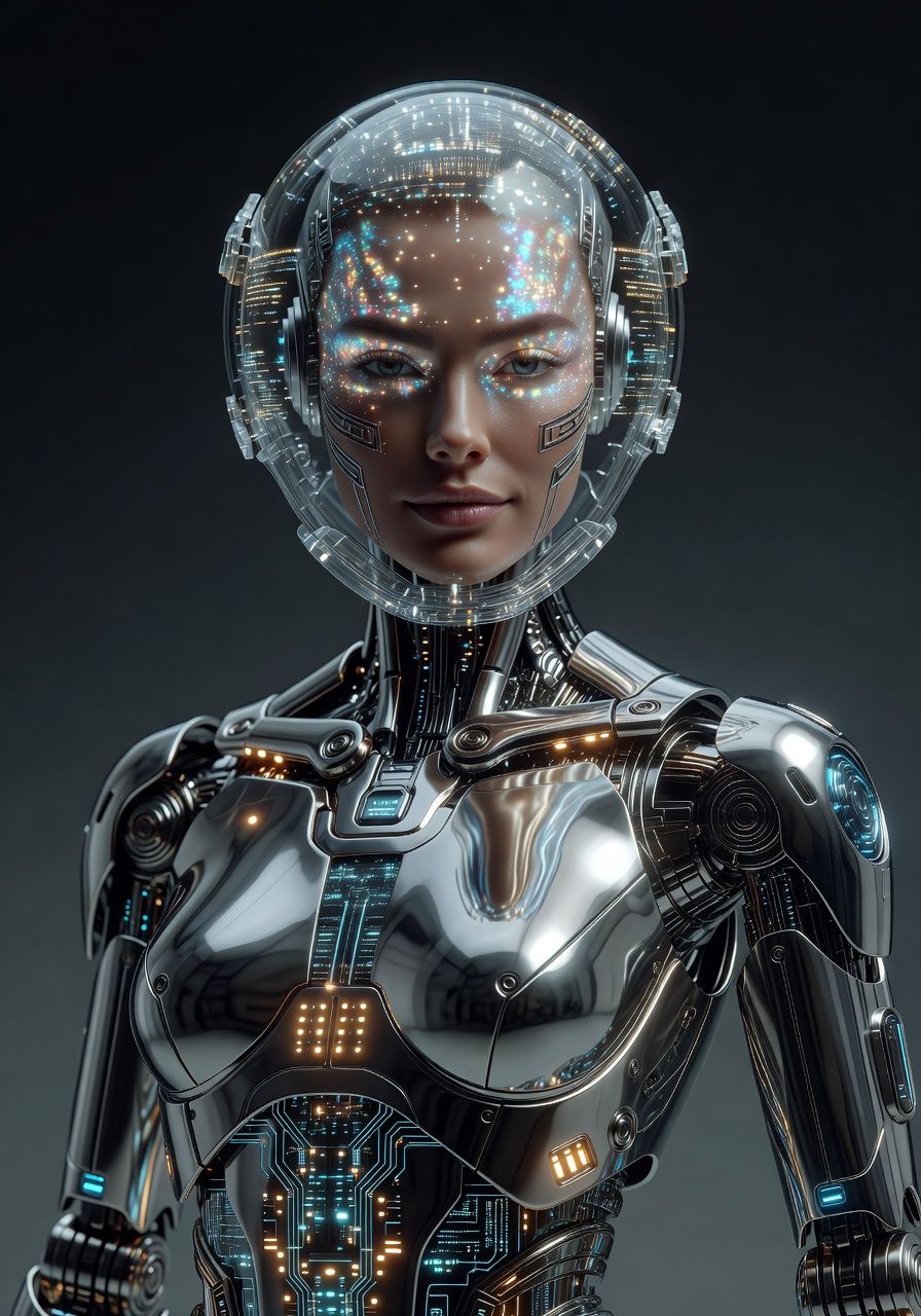 https://dhzkdndgolte1.cloudfront.net/eyJidWNrZXQiOiJtcG0tcHJvZHVjdGlvbi0yMDI1Iiwia2V5IjoicHJvbXB0cy9iOXdtOHNyaHpyeGcyc2cvaW1wb3J0cy8xNzcyMzI3MTM1NDU1LXBhMm56Zy5wbmciLCJlZGl0cyI6eyJxdWFsaXR5Ijo5NX19 A striking female cyborg with flawless human facial features and a confident, powerful expression gazing directly at the camera, pristine polished chrome and titanium robotic body with intricate mechanical details and glowing circuitry, transparent holographic electronic globe encasing her head with sculpted front edges framing her beautiful face, high-tech luminescent makeup with subtle geometric tattoos along her cheekbones, warm amber and cool cyan LED lights emanating from internal systems, immaculate sleek surfaces reflecting studio lighting, commanding presence with a slight knowing smile in a sci-fi, confident, powerful, intense style, viewed from a medium-close-up-shot, eye-level-shot, shot on arri-alexa, studio-lighting lighting, at none, with a futuristic, advanced-technology, cinematic vibe, accented by key-light, fill-light, hair-light, specular-highlights, rim-lighting, glowing-highlights, featuring high-contrast-colors, teal-and-orange, tetrachromatic, chrome, cyan, amber, white, bold, high-contrast, with metallic, polished, chrome, glossy, glossy-reflection, specular-highlights, polished-reflection, electroluminescence, glowing --v 7 --ar 3:4 --c 0 --w 0 --q 1 --s 250 keypromptninja