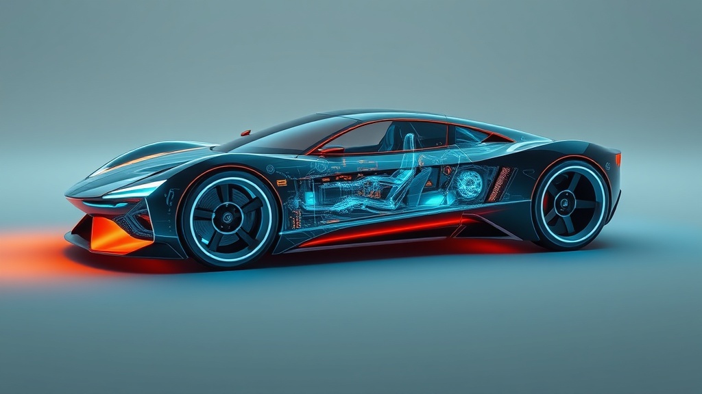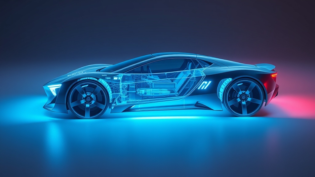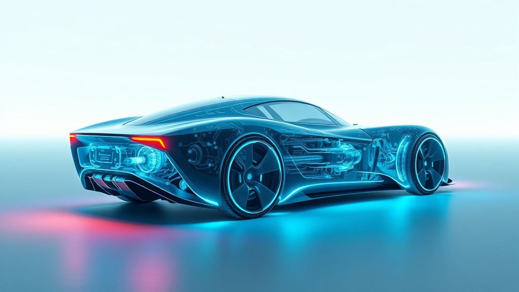 Sleek futuristic concept car in three-quarter view floating in minimalist void, abstract space with subtle gradient backdrop, transparent body panels revealing glowing neon blue circuitry and mechanical components beneath the surface, holographic interface elements illuminated in electric blue, aerodynamic curves and sharp angular details, X-ray vision effect showing internal systems pulsing with energy, advanced propulsion systems glowing, clean sci-fi aesthetic with technical precision, 5, text, sci-fi, arri-alexa, dichromatic, sophisticated, futuristic, minimalist, sci-fi, holographic-glow, glowing-highlights, neon-light, high-contrast-colors, teal-and-orange, bold, cool, metallic, transparent, glossy-reflection, polished, bioluminescence, electroluminescence, glowing-neon, black, blue, cyan --ar 16:9 --v 7 --q 1 --s 500 --w 0 --c 0 keypromptninja