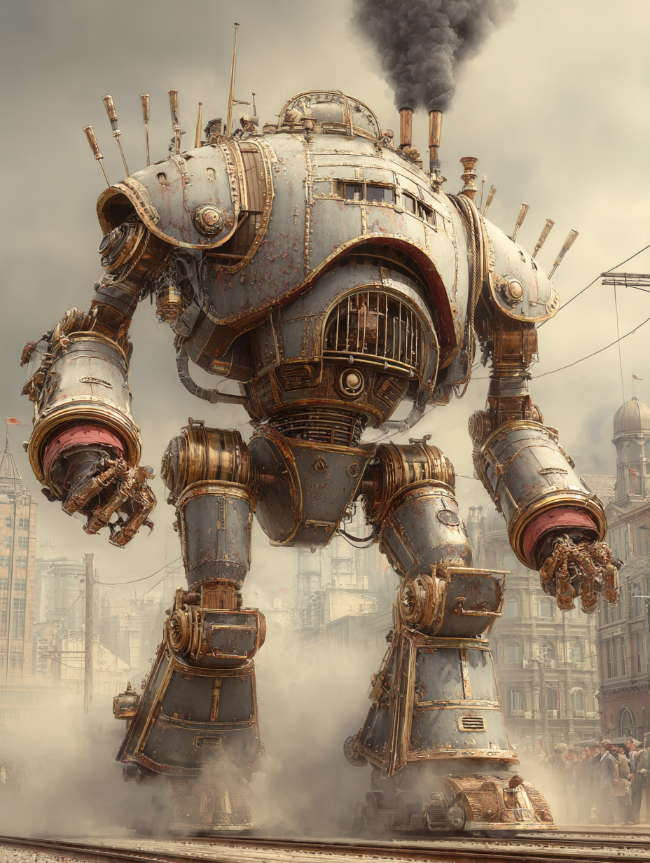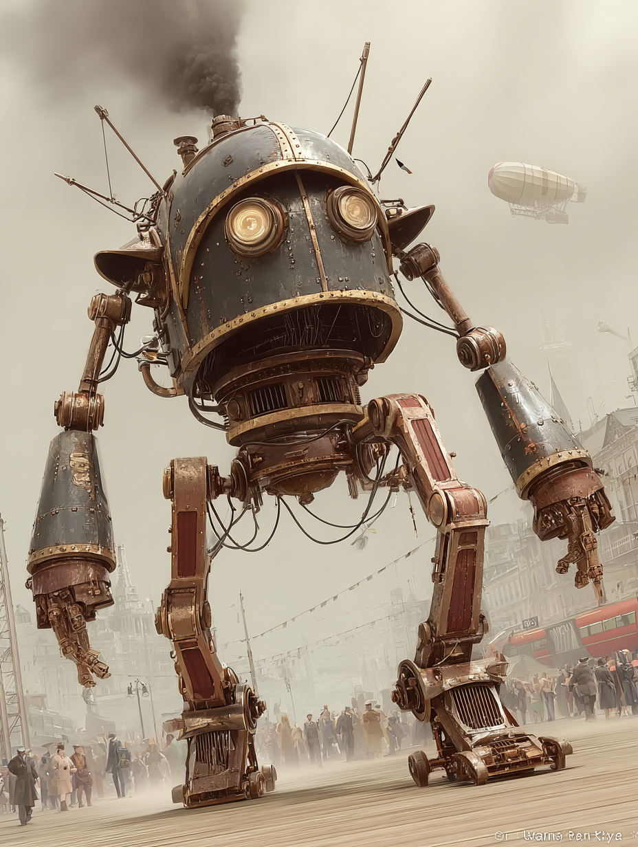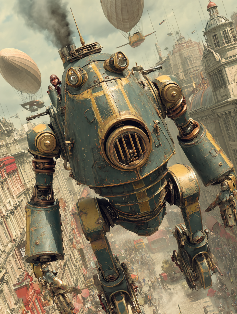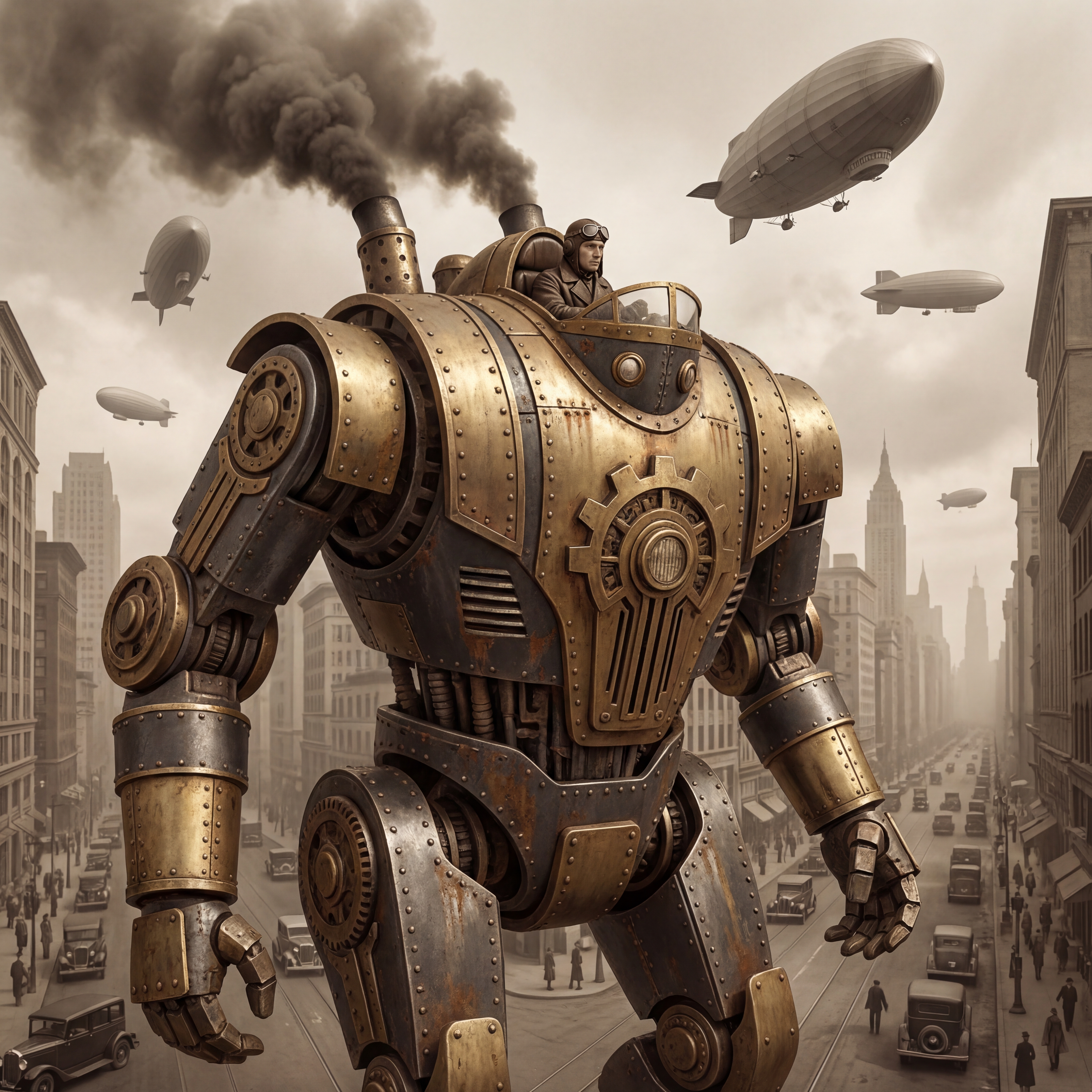 A massive brass and iron walking machine in Art Deco styling, riveted steel panels, exhaust pipes belching black smoke, leather-goggled pilot in cockpit, 1930s cityscape with zeppelins overhead, sepia-toned industrial atmosphere in a dieselpunk, adventurous, bold, dramatic style, viewed from a low angle shot, wide shot, hazy, overcast lighting, at afternoon, with a gritty, industrial, vintage vibe, accented by atmospheric haze, natural light, dramatic shadows, high contrast, featuring desaturated colors, muted colors, sepia toned, charcoal gray, gold, saddle brown, sepia, vintage, warm antique colors, with corroded, metallic, rust, smoky effects --v 7 --ar 1:1 --c 10 --w 0 --s 750 --sref https://mpm-production-2025.s3.us-east-1.amazonaws.com/prompts/bf7jj3w8wya98pl/images/1764774107076-mid-1.png --sw 400 keypromptninja