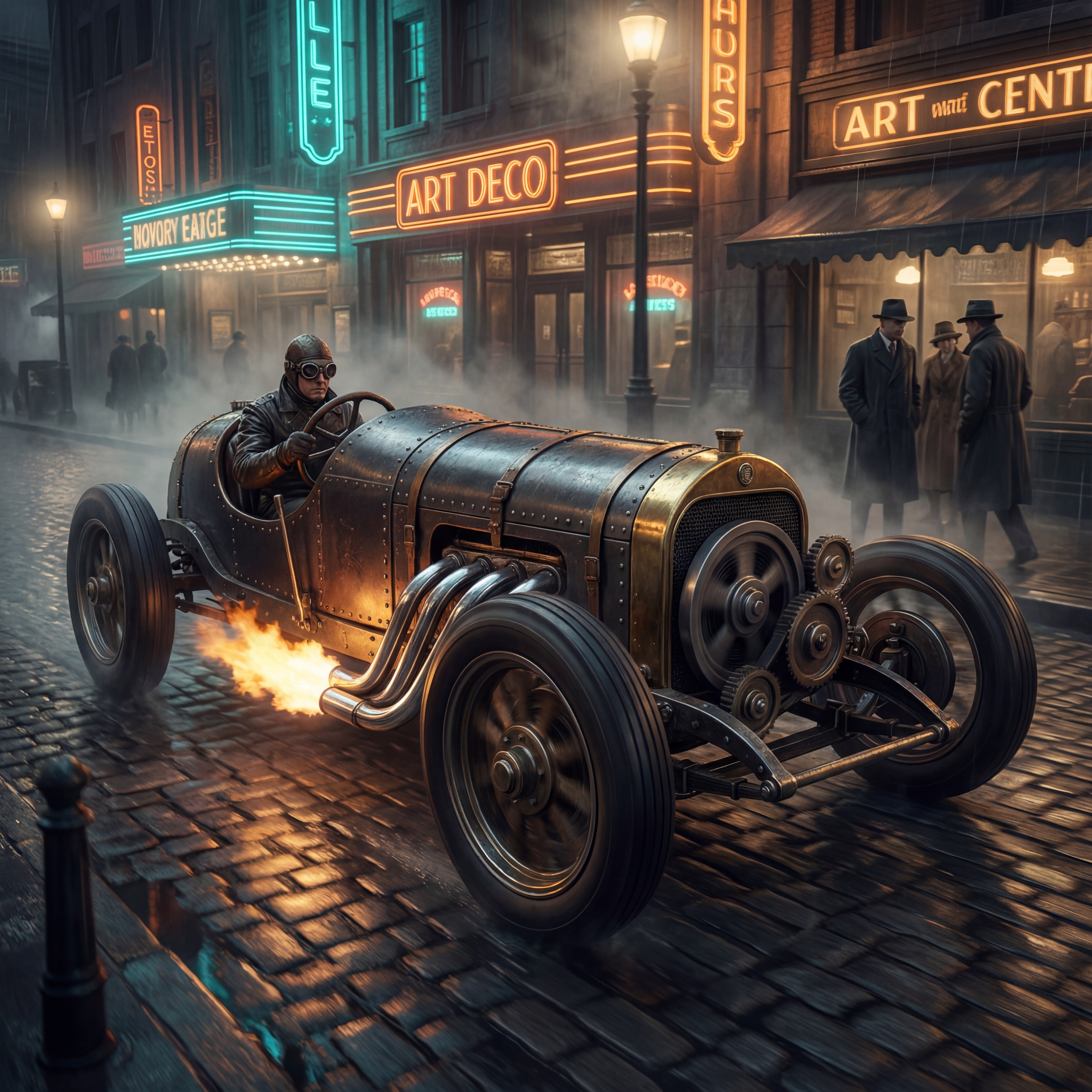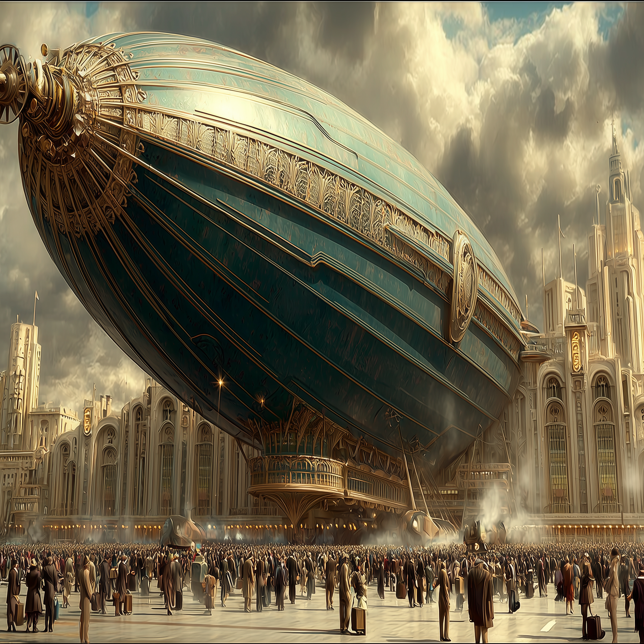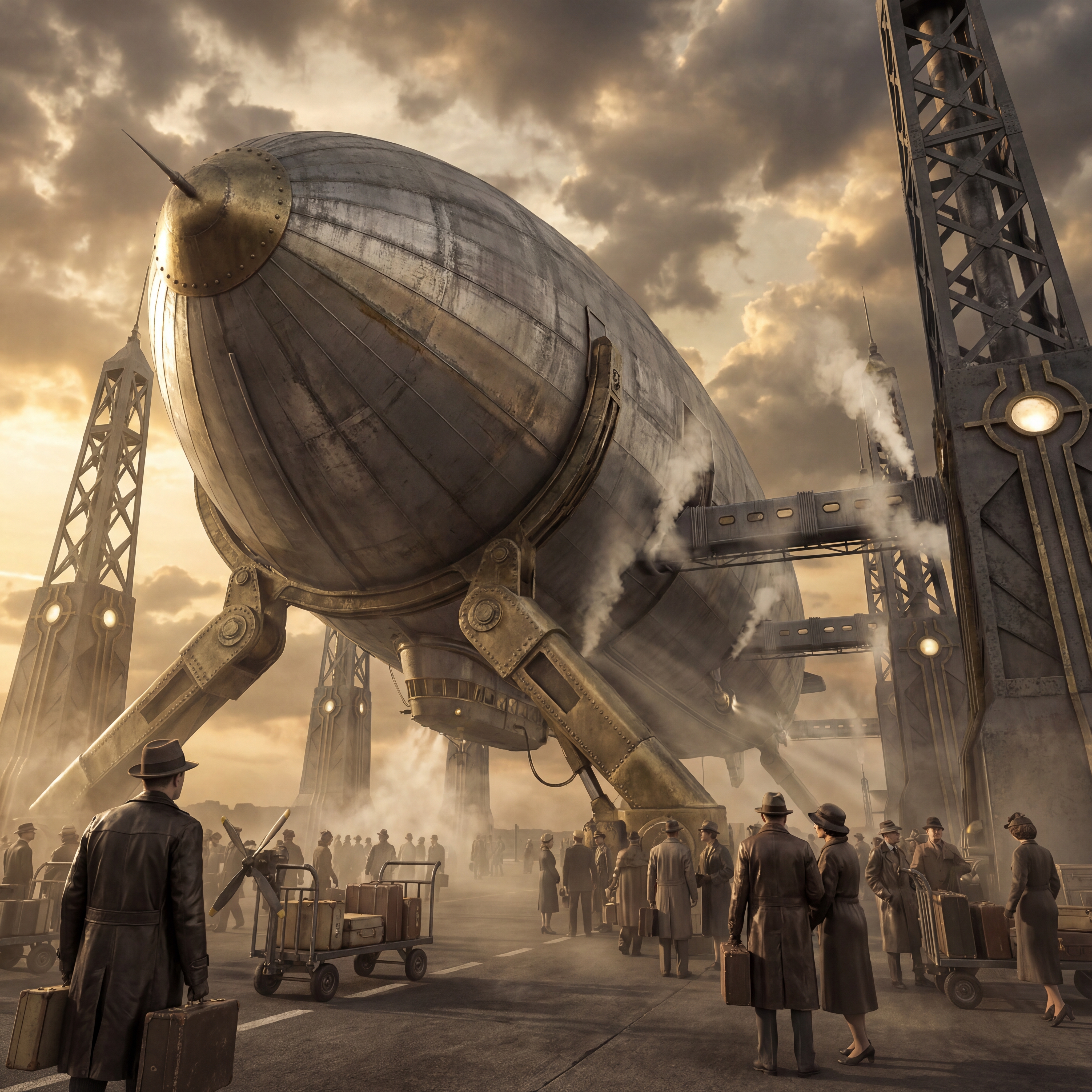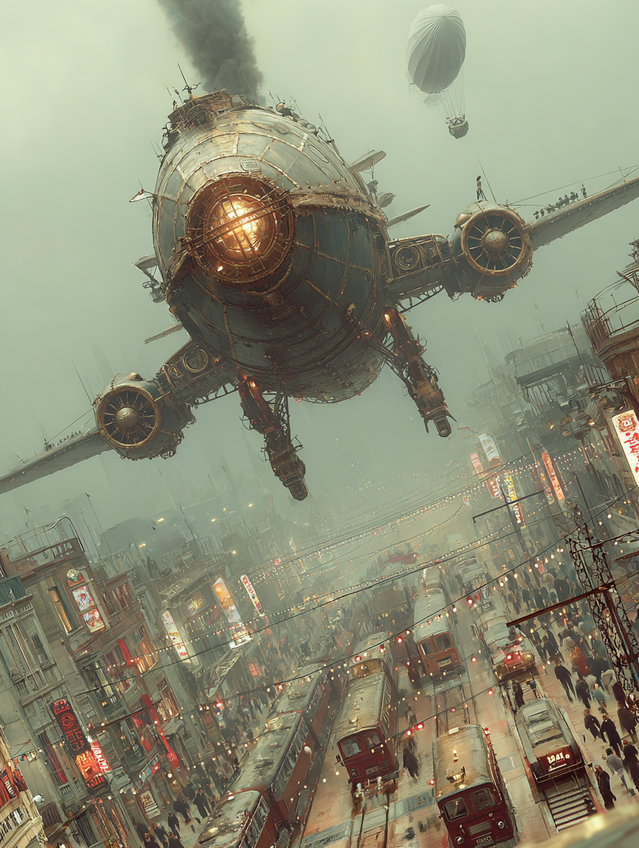 A massive brass and iron walking machine in Art Deco styling, riveted steel panels, exhaust pipes belching black smoke, leather-goggled pilot in cockpit, 1930s cityscape with zeppelins overhead, sepia-toned industrial atmosphere in a dieselpunk, adventurous, bold, dramatic style, viewed from a low angle shot, wide shot, hazy, overcast lighting, at afternoon, with a gritty, industrial, vintage vibe, accented by atmospheric haze, natural light, dramatic shadows, high contrast, featuring desaturated colors, muted colors, sepia toned, charcoal gray, gold, saddle brown, sepia, vintage, warm antique colors, with corroded, metallic, rust, smoky effects --v 7 --ar 1:1 --c 10 --w 0 --s 750 --sref https://mpm-production-2025.s3.us-east-1.amazonaws.com/prompts/bf7jj3w8wya98pl/images/1764774107076-mid-1.png --sw 400 keypromptninja