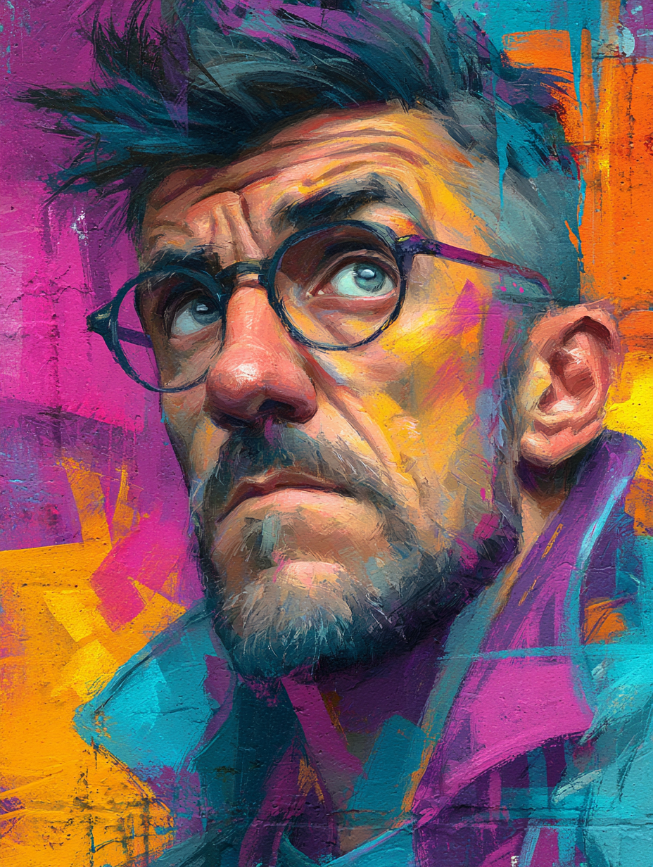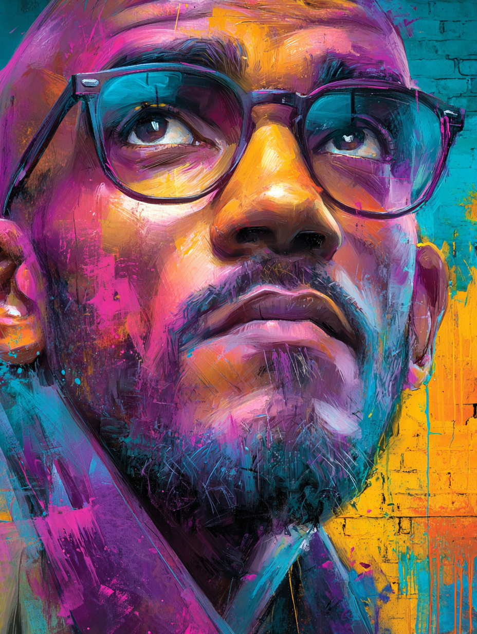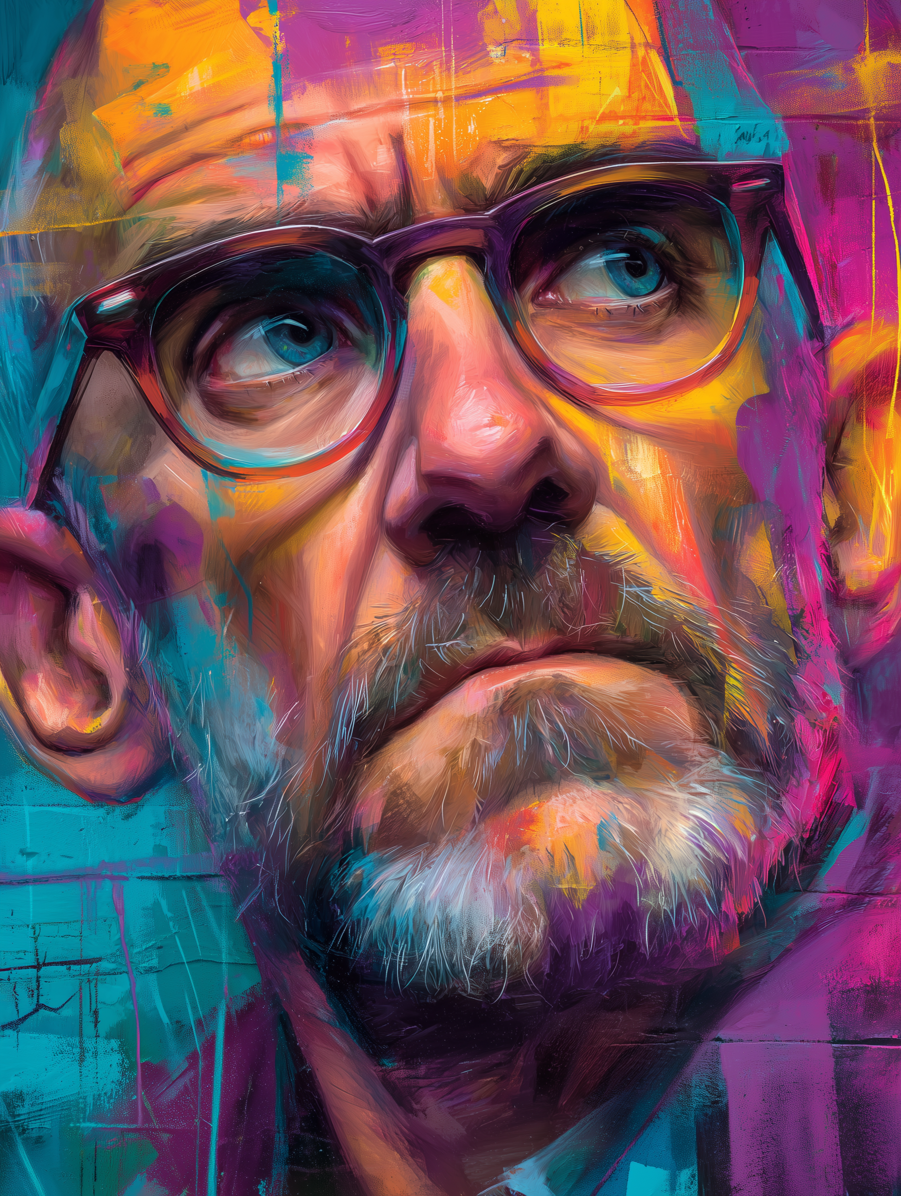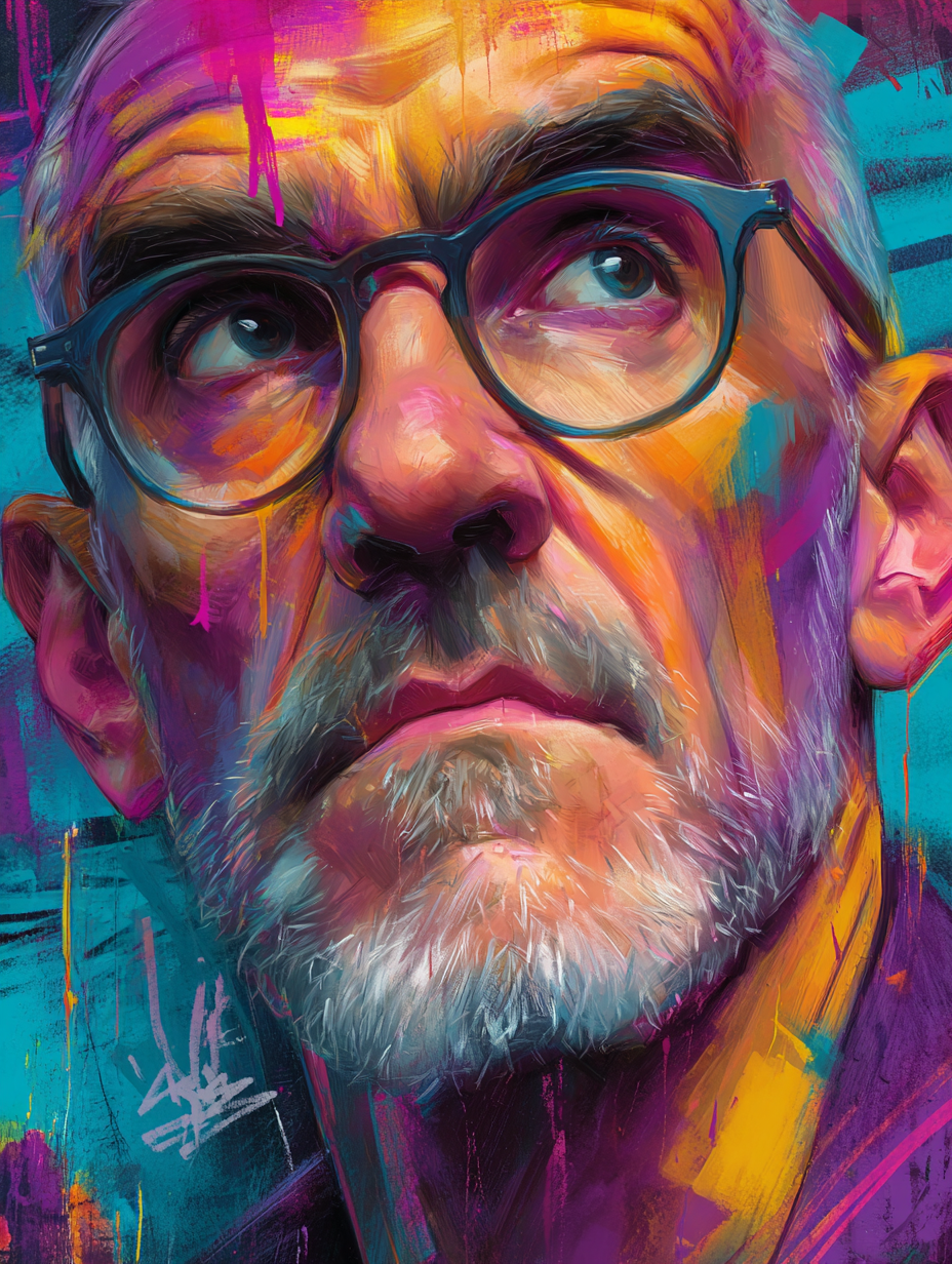 A powerful expressive portrait of an elderly man with glasses rendered in vibrant street art style, featuring bold gestural brushstrokes, dynamic color splashes, and urban artistic energy with layered paint drips and spray paint techniques in a graffiti, bold, dramatic, dynamic style, viewed from a close-up shot, diffused sunlight lighting, with a gritty, urban vibe, accented by neon glow, dramatic highlights, featuring high-contrast colors, saturated colors, vibrant colors, cyan, magenta, orange, purple, yellow colors, with layered, textured effects --v 7 --ar 3:4 --c 20 --s 900 --sref https://dhzkdndgolte1.cloudfront.net/eyJidWNrZXQiOiJtcG0tcHJvZHVjdGlvbi0yMDI1Iiwia2V5IjoicHJvbXB0cy9iajRyeWx1ZHlzaXcxaDYvaW1hZ2VzLzE3NTg5OTY1NDQ2MjctOS0yNy0yNS1ncmFmZml0aS5wbmciLCJlZGl0cyI6eyJyZXNpemUiOnsid2lkdGgiOjgwMCwiaGVpZ2h0Ijo2MDAsImZpdCI6Imluc2lkZSJ9LCJxdWFsaXR5Ijo4NX19 --sw 800