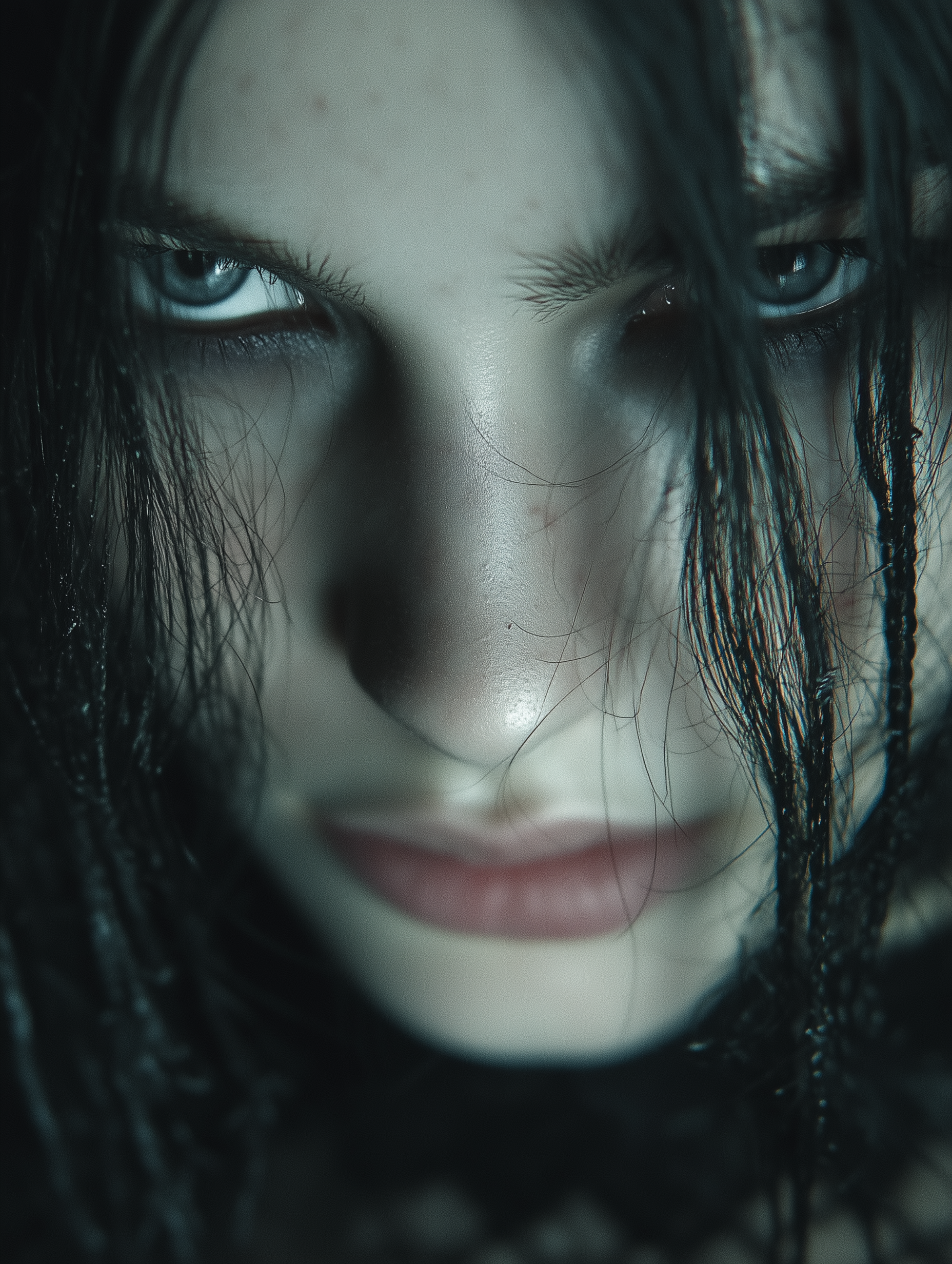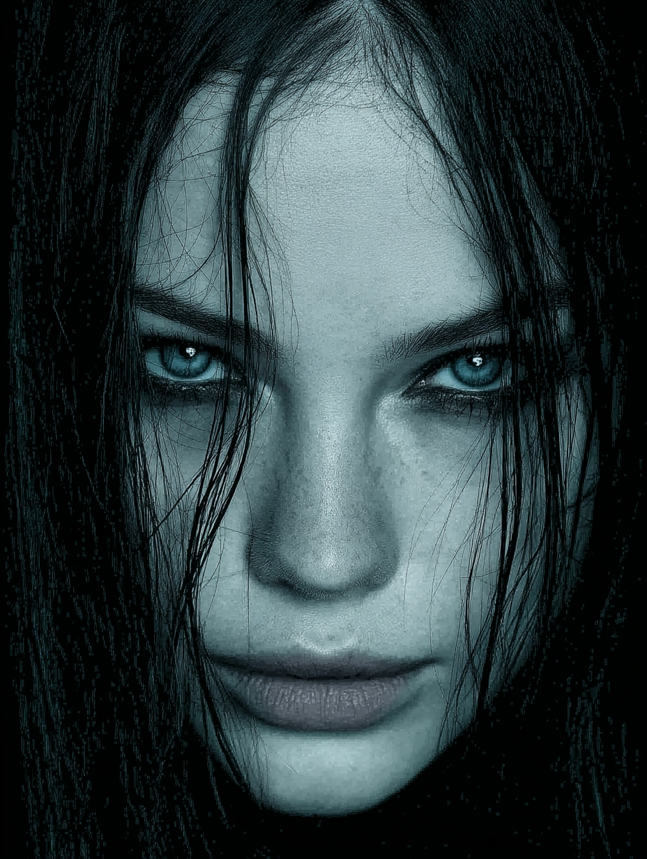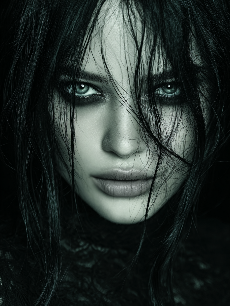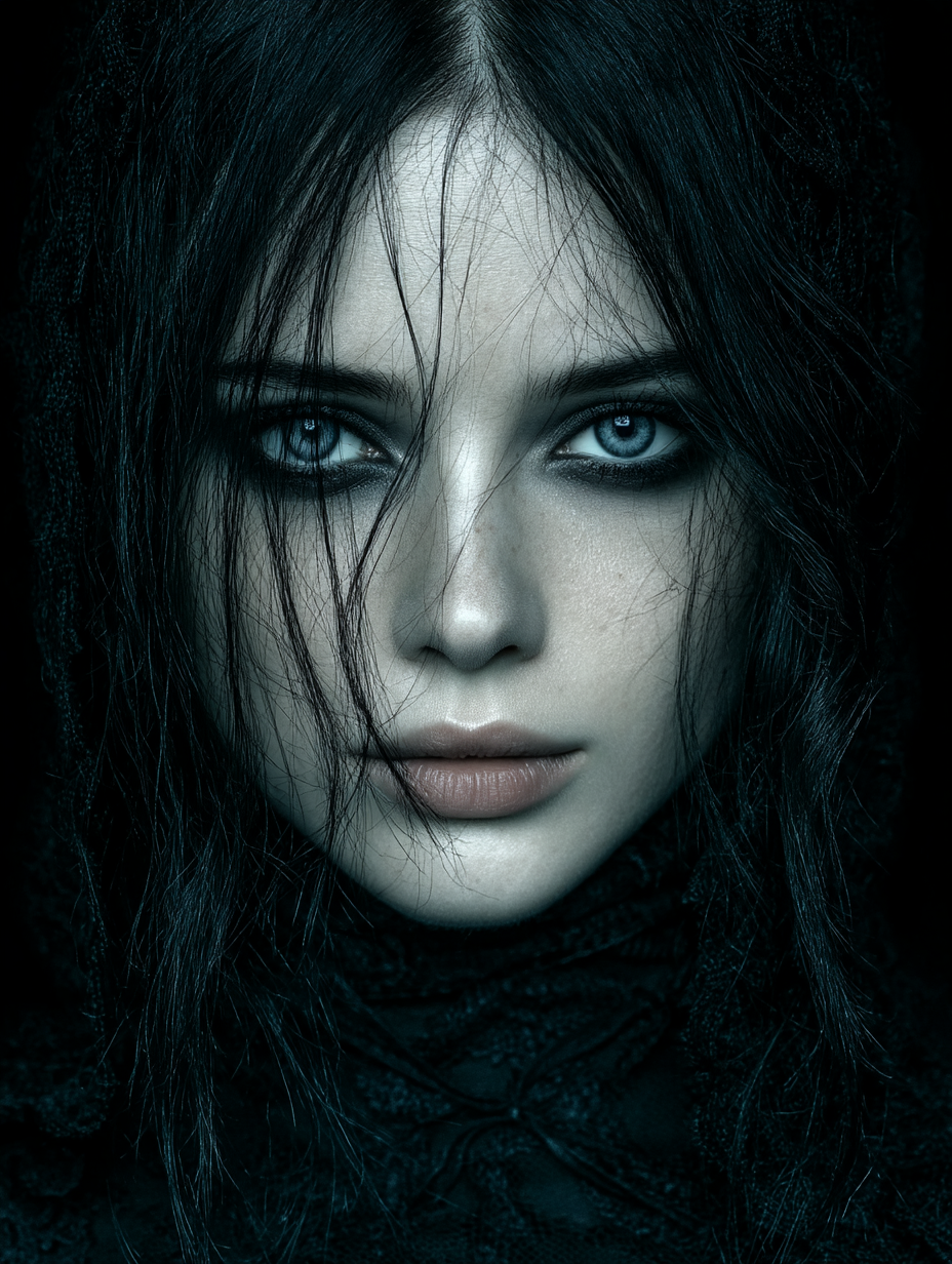 Mysterious gothic woman portrait, pale ethereal skin with dark smudged eye makeup creating haunting raccoon eyes effect, long dark disheveled hair framing her face, piercing intense gaze staring directly at viewer, ghostly pallor against pitch black background, dramatic chiaroscuro lighting emphasizing her otherworldly beauty, dark romantic aesthetic in a gothic art, ethereal, haunting, intense, mysterious, ominous style, viewed from a close-up shot, eye level shot, with a cinematic, dark and moody, gothic vibe, accented by ambient shadows, low light, dramatic shadows, high contrast, low key light, featuring dark colors, desaturated colors, high-contrast colors, monochromatic, black, gray, pale silver, white, dark, monochrome, noir colors --v 7 --ar 3:4 --c 15 --w 0 --s 750 --q 2 --sref https://mpm-production-2025.s3.us-east-1.amazonaws.com/prompts/bnq62pmf708ymer/images/1766015294302-12-17-25-goth-portrait.png --sw 400