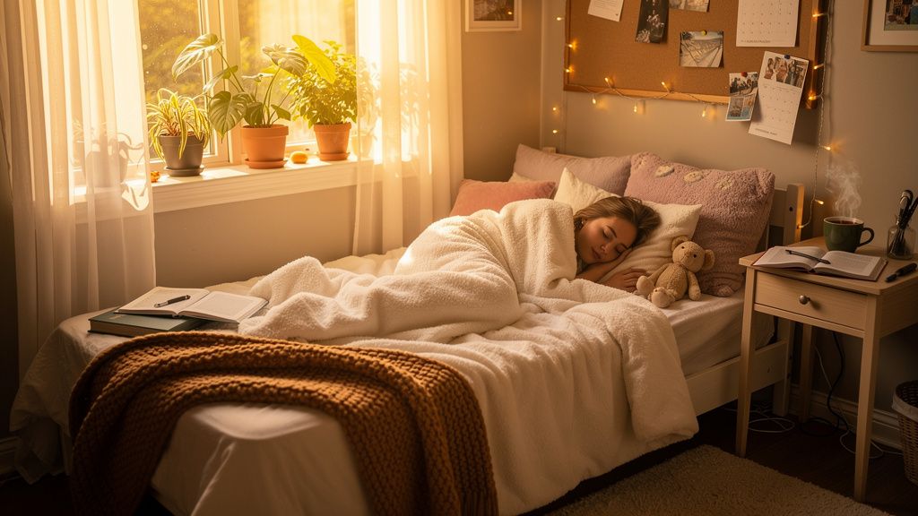 A warm and inviting college dorm bedroom bathed in soft morning sunlight streaming through sheer curtains, a young woman with gentle features curled up peacefully in bed under a fluffy comforter, surrounded by plush pillows and a well-loved stuffed animal, fairy lights twinkling softly along the walls, potted plants on the windowsill catching the golden light, scattered textbooks and a steaming mug of tea on the nightstand, cozy knit blanket draped over the foot of the bed, peaceful and serene atmosphere in a anime-manga, peaceful, serene, warm style, viewed from a eye-level-shot, wide-shot, diffused-sunlight, soft-morning-light lighting, at morning, accented by natural-light, god-rays, soft-shadows, featuring warm-tones, polychromatic, blush, gold, peach, pastel, warm, with soft, diffused-reflection, subtle-glow --niji -7 --ar 16:9 --c 100 --w 0 --q 1 --s 750 keypromptninja