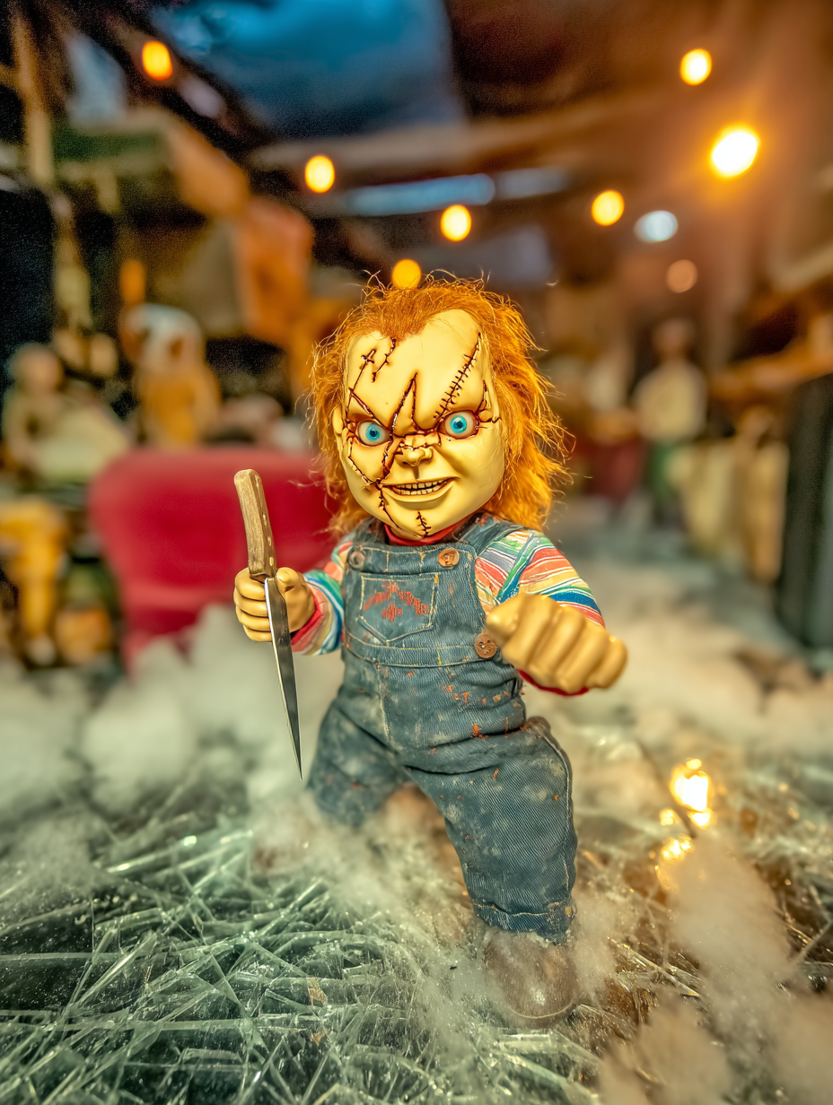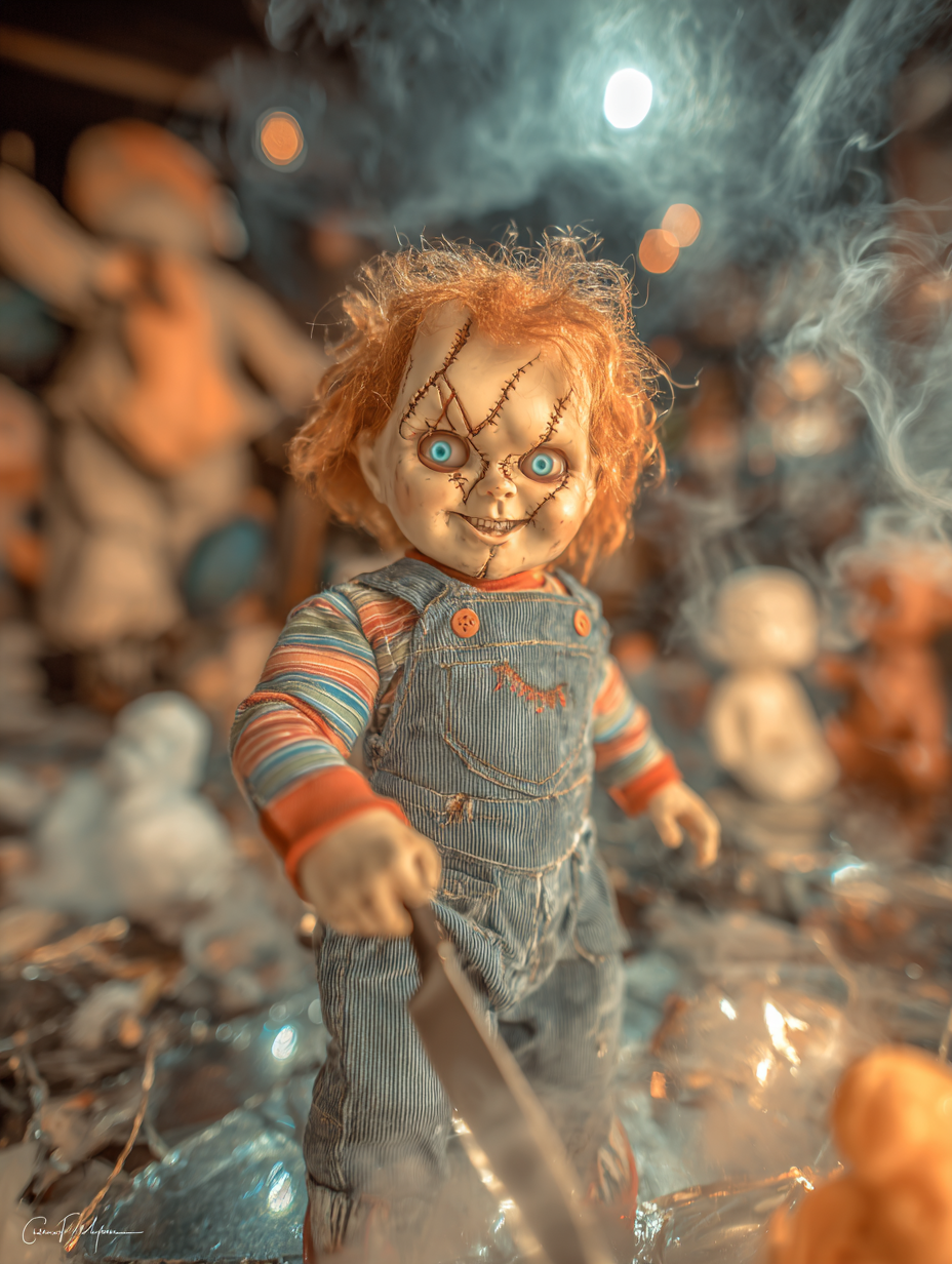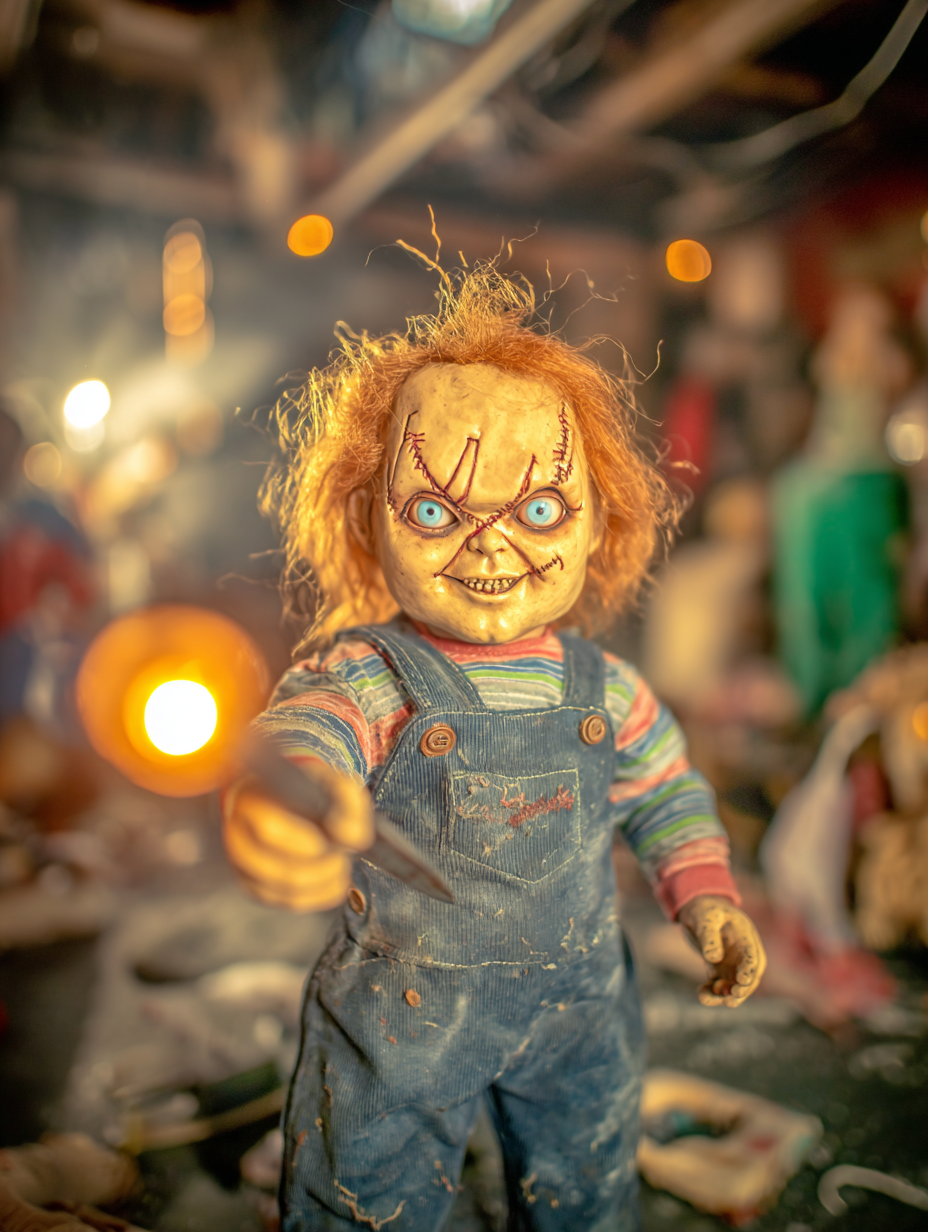Menacing evil doll with wild red orange hair, stitched scarred face showing malicious grin with sharp teeth, bright blue eyes filled with murderous intent, holding a bloody kitchen knife, wearing blue denim overalls and striped shirt, standing in abandoned toy store surrounded by broken dolls and shattered glass, dramatic horror movie lighting with strong rim lighting, shadows creating ominous atmosphere in a film noir, dramatic, intense, sinister style, viewed from a dramatic framing, full body shot, low angle shot, at night, with a cinematic, dark and moody, horror vibe, accented by ambient shadows, low light, cinematic light, dramatic highlights, dramatic shadows, sharp rim lighting, featuring high-contrast colors, saturated colors, vibrant colors, blue, crimson, dark red, orange, red, bold colors, with glossy, specular highlights effects --v 7 --ar 3:4 --c 20 --s 750 --style raw --sref https://dhzkdndgolte1.cloudfront.net/eyJidWNrZXQiOiJtcG0tcHJvZHVjdGlvbi0yMDI1Iiwia2V5IjoicHJvbXB0cy9jMDBheGliaGJsZm55bXgvaW1hZ2VzLzE3NjAwNDE0NDY0NzctMTAtOS0yNS1jaHVja2llLnBuZyIsImVkaXRzIjp7InJlc2l6ZSI6eyJ3aWR0aCI6ODAwLCJoZWlnaHQiOjYwMCwiZml0IjoiaW5zaWRlIn0sInF1YWxpdHkiOjg1fX0= --sw 400