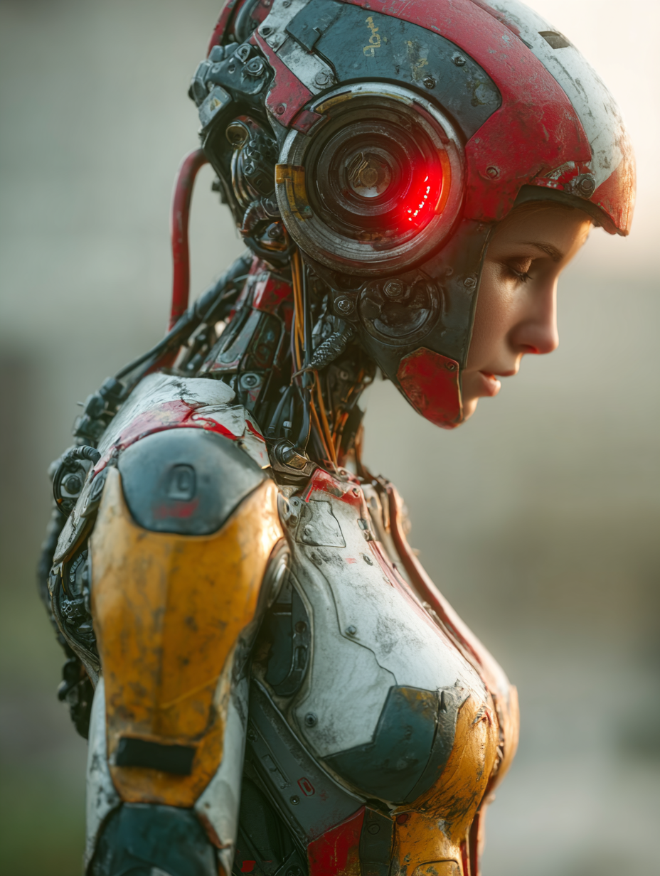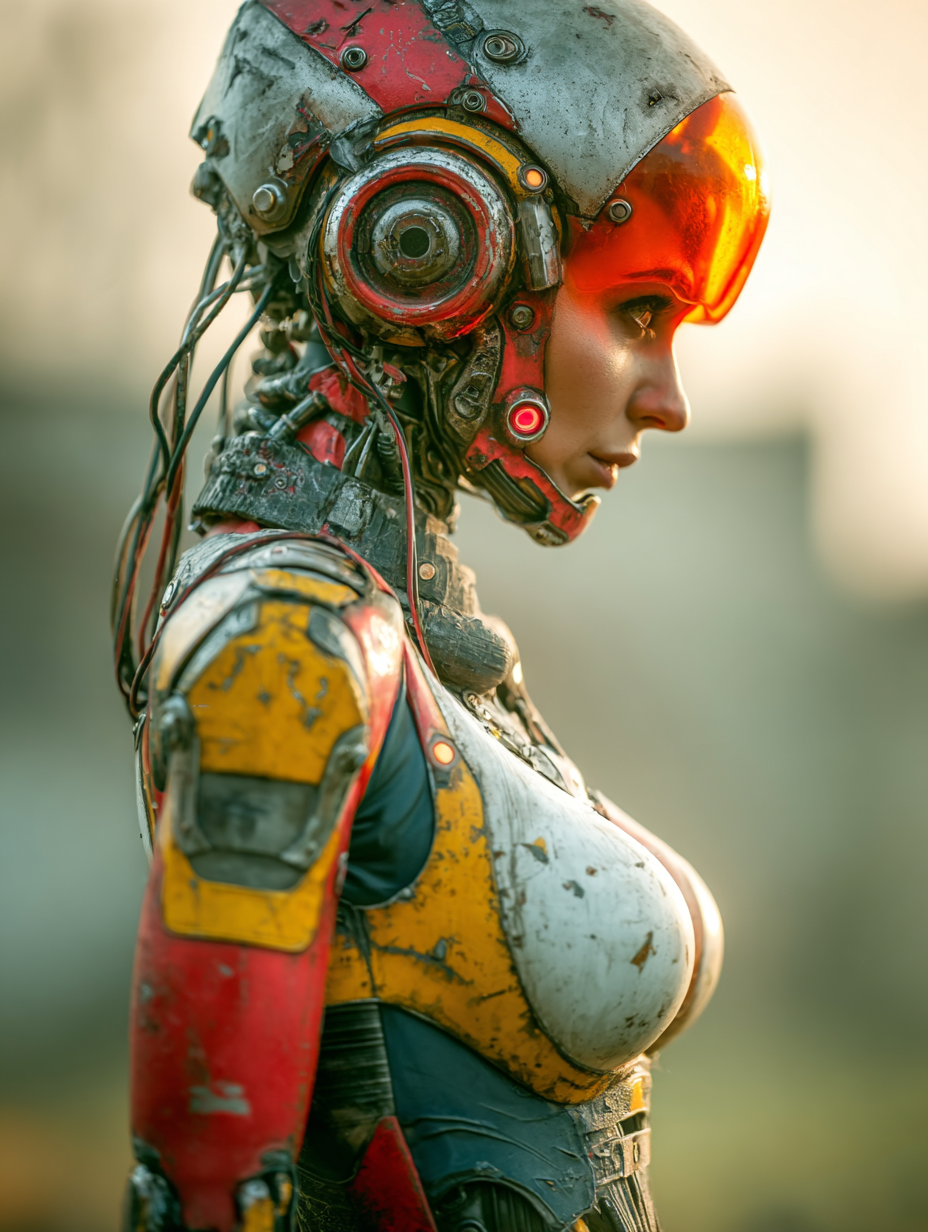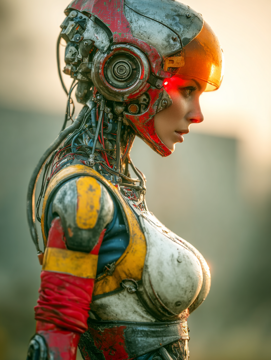 A cyborg woman in a retro-futuristic industrial facility, half-human half-machine, exposed mechanical parts and circuitry, glowing red cybernetic eye, chrome and steel plating, vintage analog technology mixed with advanced robotics, dramatic industrial lighting in a retro-futurism, bold, dramatic, intense, mysterious style, viewed from a low angle shot, medium close-up shot, with a cinematic, futuristic, gritty, industrial vibe, accented by overhead, spotlight, warm glow, back light, dramatic highlights, dramatic shadows, high contrast, neon glow, featuring cool tones, desaturated colors, high-contrast colors, crimson, red, silver, retro, urban grit colors, with corrugated, metallic, reflective, glossy, polished reflection, specular highlights, electroluminescence, glowing, subtle glow effects --v 7 --ar 3:4 --c 20 --w 100 --s 900 --sref https://mpm-production-2025.s3.us-east-1.amazonaws.com/prompts/fciecim6fudk3yc/images/1763643401297-11-20-25-red-cyborg.png --sw 400 sparker888