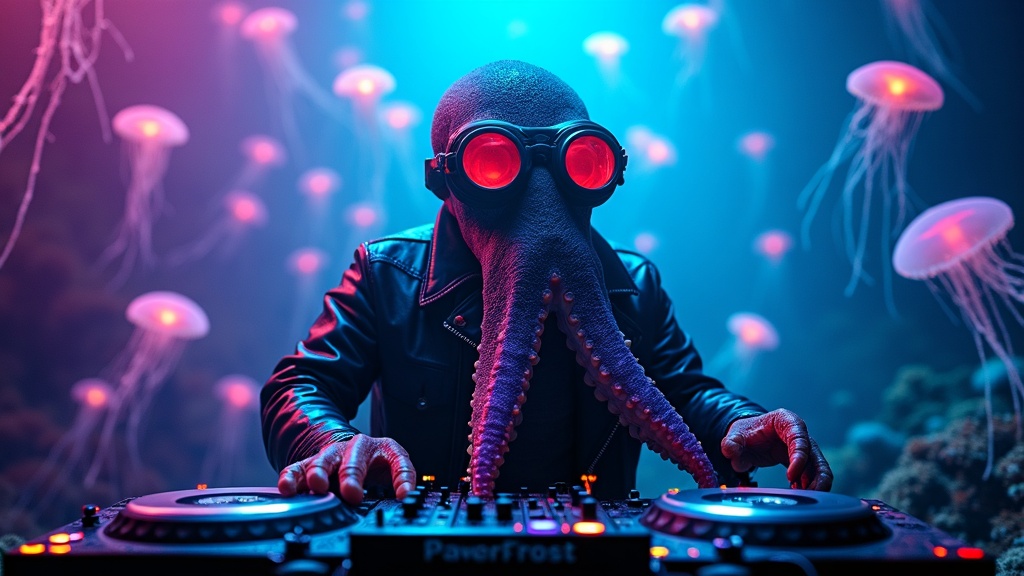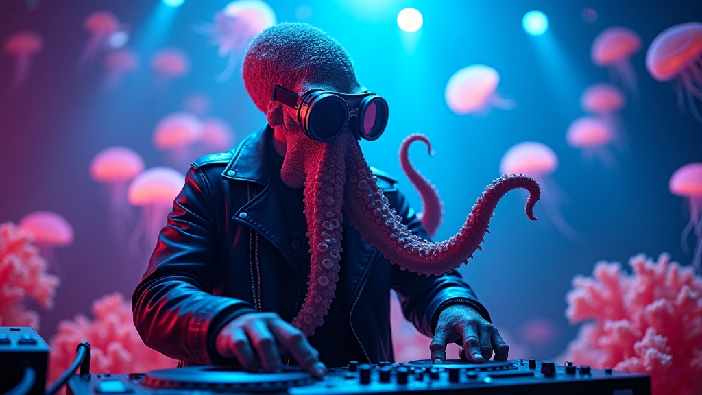 https://dhzkdndgolte1.cloudfront.net/eyJidWNrZXQiOiJtcG0tcHJvZHVjdGlvbi0yMDI1Iiwia2V5IjoiZ2VuZXJhdGVkLWltYWdlcy82cmtmNTFkNnBzYjRka28vYWdva3Job3RnZHR4cGZrLzE3NjgwMDc1NTU1MjAtMi5qcGciLCJlZGl0cyI6eyJxdWFsaXR5Ijo5NX19 A majestic octopus wearing vintage aviator goggles with glowing yellow lenses and a leather jacket, DJ-ing at an underwater rave with bioluminescent jellyfish dancing in the background, neon coral reef speakers pulsing with bass, retro cassette tapes floating through volumetric light beams, surreal and vibrant energy in a cyberpunk, energetic, playful, vibrant style, viewed from a eye-level-shot, medium-shot, shot on canon-eos-r5-50, moonlight lighting, at night, with a energetic, futuristic vibe, accented by neon-glow, glowing-highlights, god-rays, neon-light, featuring high-contrast-colors, vibrant-colors, polychromatic, cyan, magenta, purple, teal, yellow, neon, with blobby, translucent, glowing-lightsaber-accents, bioluminescence, electroluminescence, glowing-neon --v 7 --ar 16:9 --c 0 --w 0 --q 1 --s 1000 keypromptninja