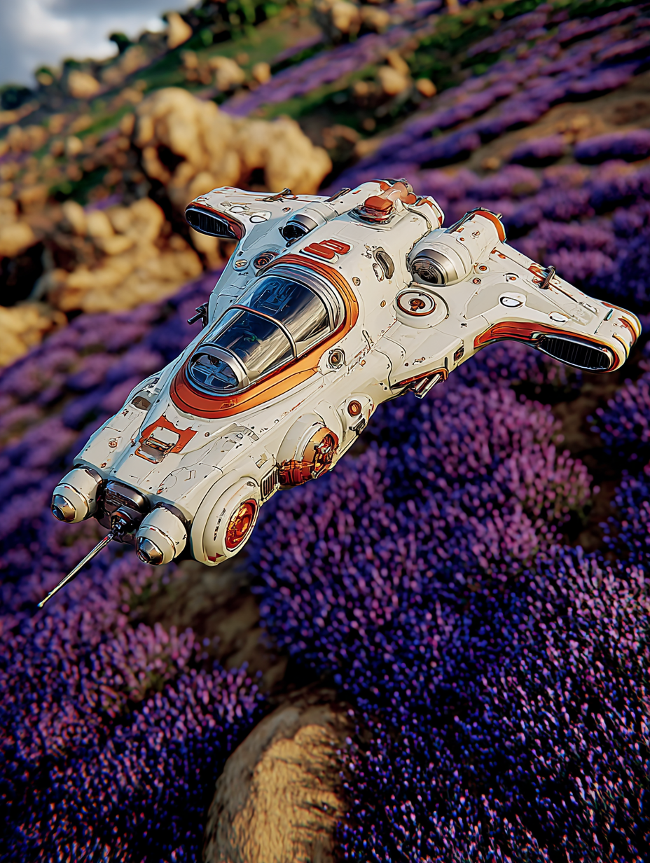 A science fiction small ship with sleek aerodynamic design, compact, futuristic, speeding above alien terrain that's generally violet in hue, white livery with detailed glowing orange and blue mechanical components in a sci-fi, playful style, viewed from a low angle shot, medium shot, shot on kodak portra 800 film, overcast lighting, at afternoon, with a cinematic vibe, accented by atmospheric light, featuring cool tones, azure, medium blue, orangered, violet, whitesmoke colors --v 7 --ar 3:4 --c 20 --s 850 --sref https://dhzkdndgolte1.cloudfront.net/eyJidWNrZXQiOiJtcG0tcHJvZHVjdGlvbi0yMDI1Iiwia2V5IjoicHJvbXB0cy9nb3luODc1YzB4czQwaHgvaW1hZ2VzLzE3NTkyNTkwMzk1NTMtOS0zMC0yNS1jcmFmdC1maW5hbC5wbmciLCJlZGl0cyI6eyJyZXNpemUiOnsid2lkdGgiOjgwMCwiaGVpZ2h0Ijo2MDAsImZpdCI6Imluc2lkZSJ9LCJxdWFsaXR5Ijo4NX19 --sw 600