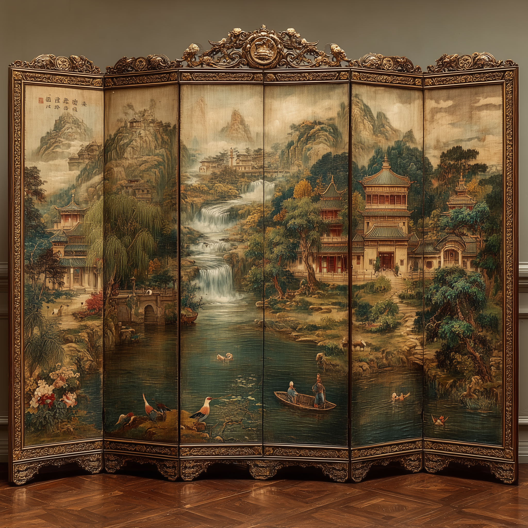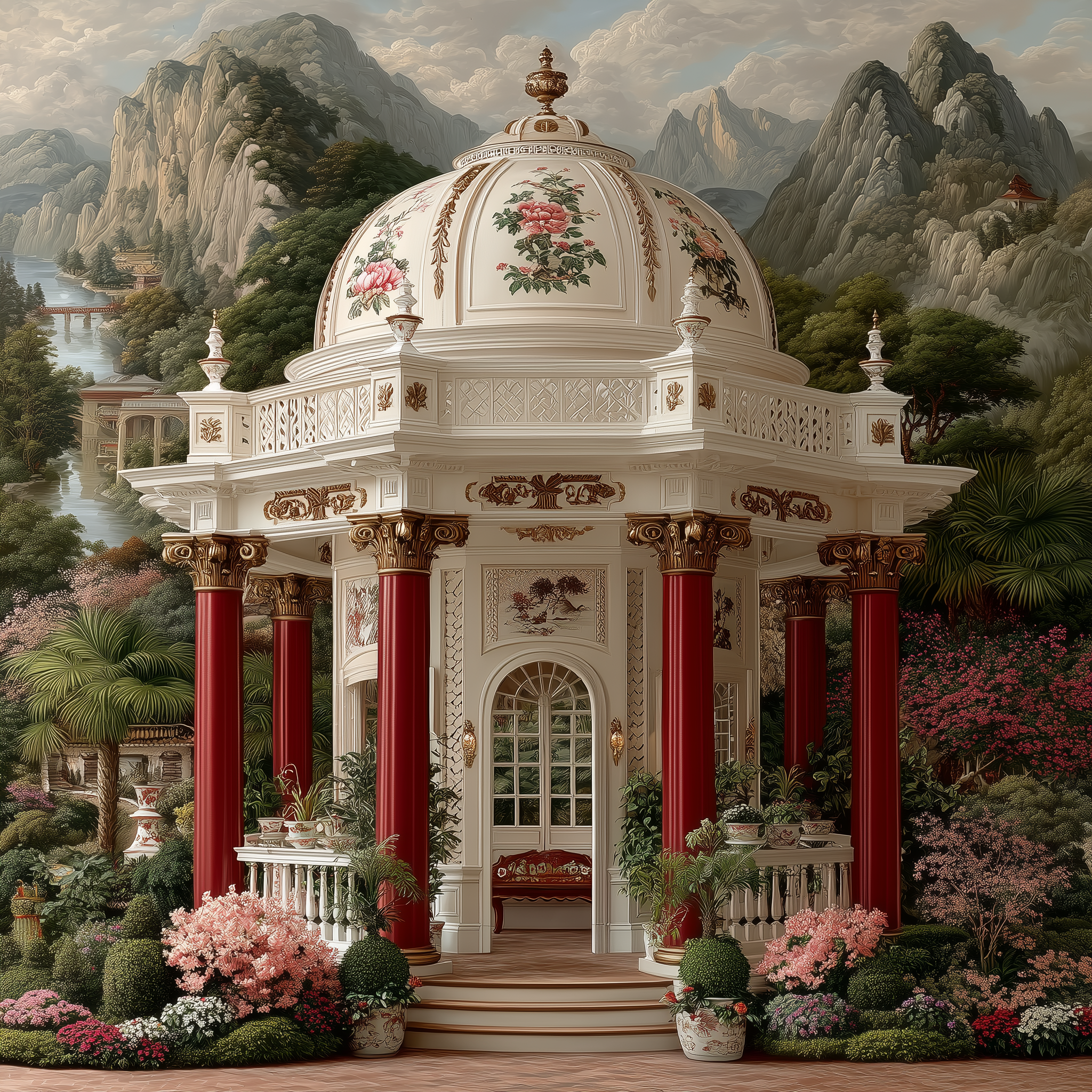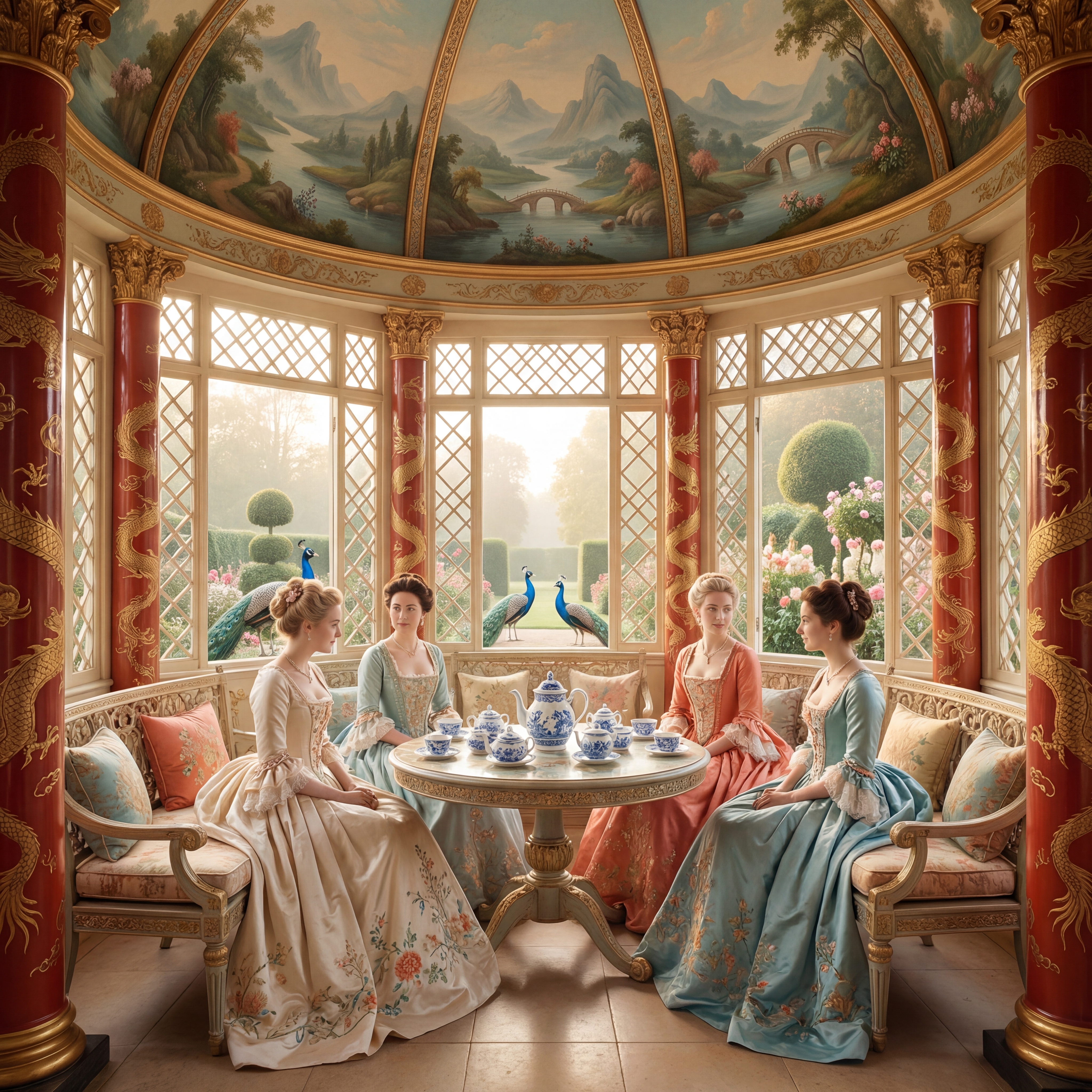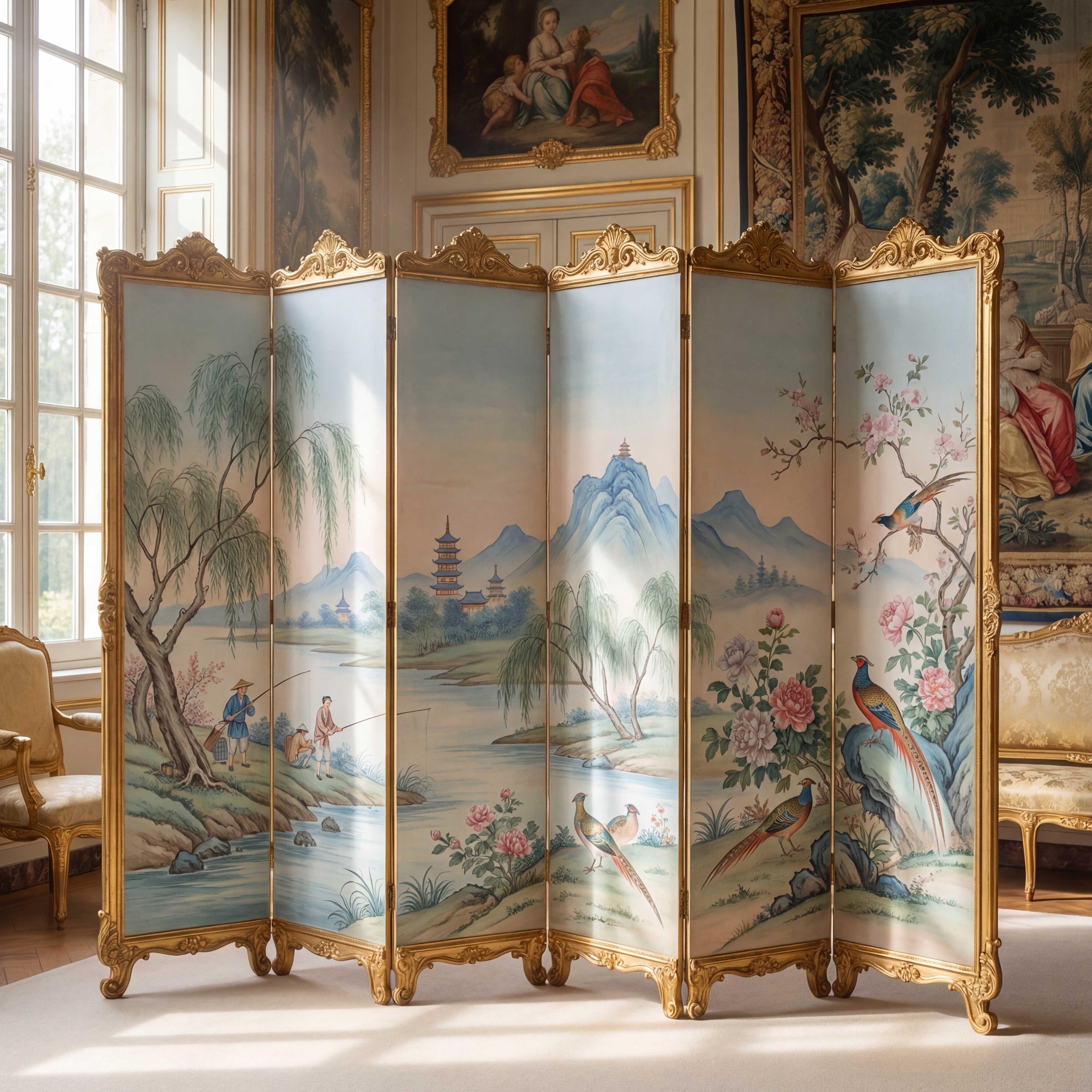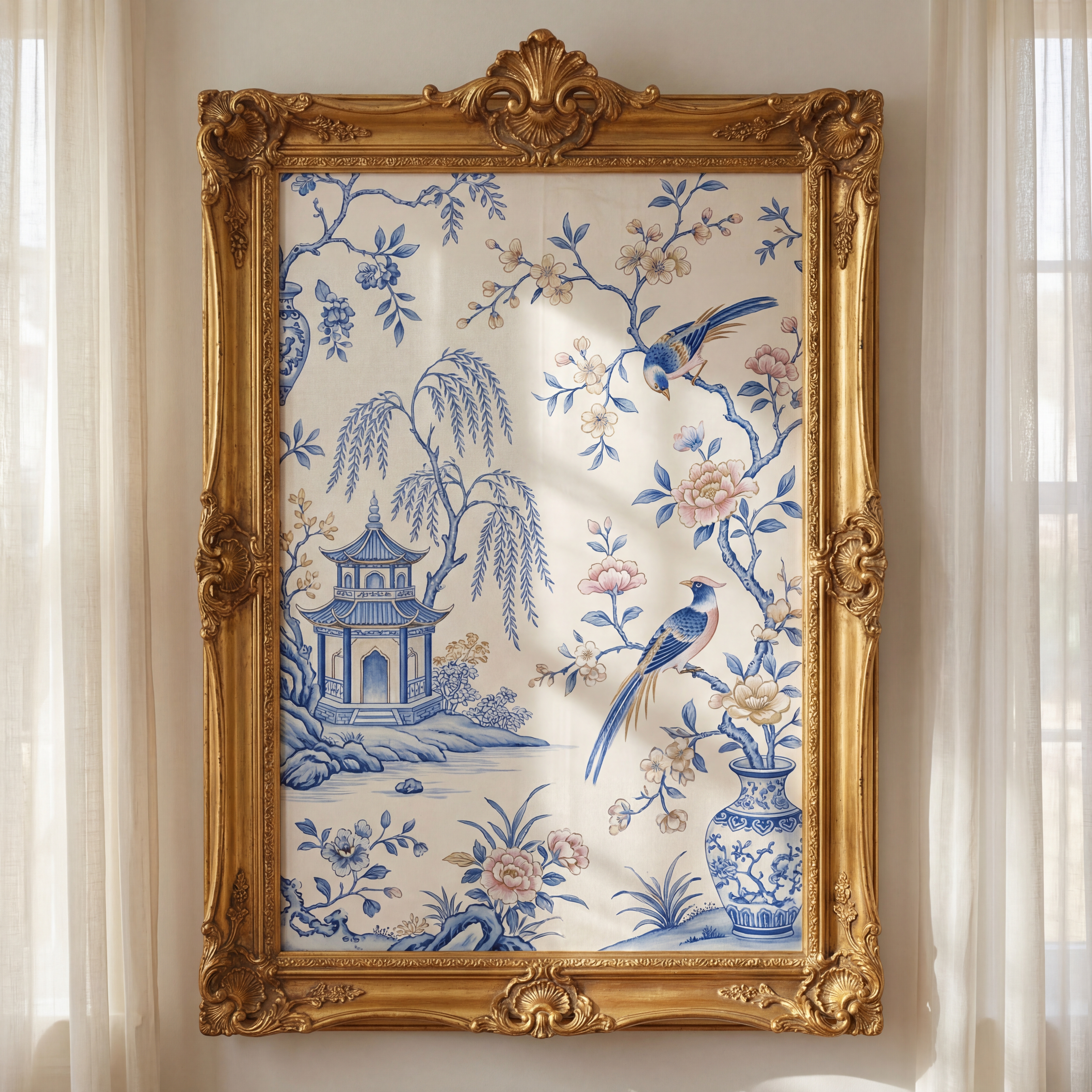 https://mpm-production-2025.s3.us-east-1.amazonaws.com/prompts/j9bmb5hrr6h4hlm/images/1766593974149-mid-1.png A decorative panel with blue and white porcelain patterns, pagoda in willow tree landscape, exotic birds on flowering branches, European Rococo gold frame, hand-painted silk wallpaper aesthetic, East-meets-West ornamental fantasy in a chinoiserie, dreamy, elegant, sophisticated style, viewed from a eye level shot, medium shot, diffused sunlight lighting, at afternoon, with a classic, elegant, romantic vibe, accented by natural light, diffused light, subtle highlights, featuring cool tones, saturated colors, blue, gold, pink, white, cool, light, serene sakura colors, with delicate lace, porcelain, silk effects --v 7 --ar 1:1 --c 10 --w 0 --s 750 --q 2 --iw 1.5