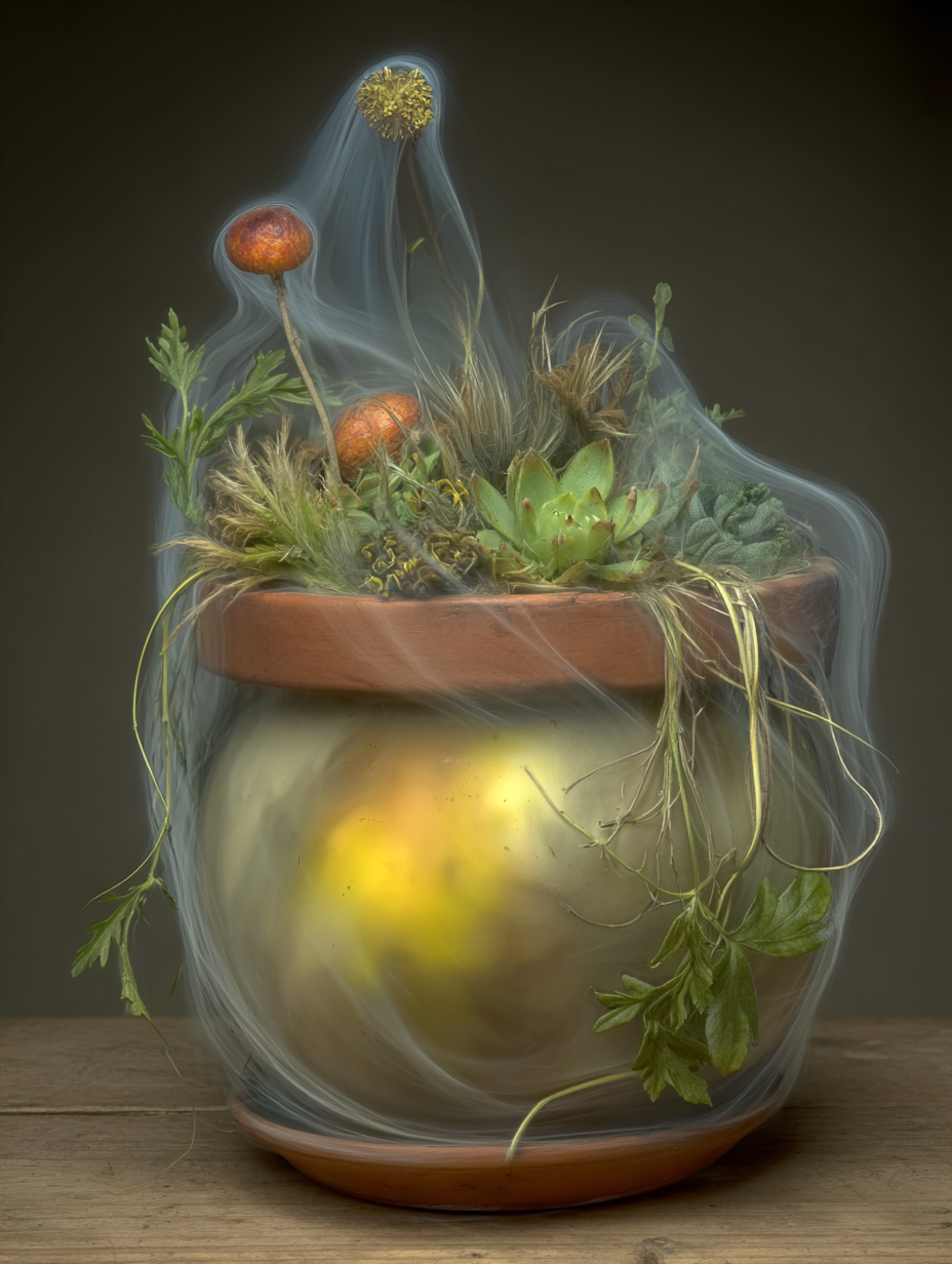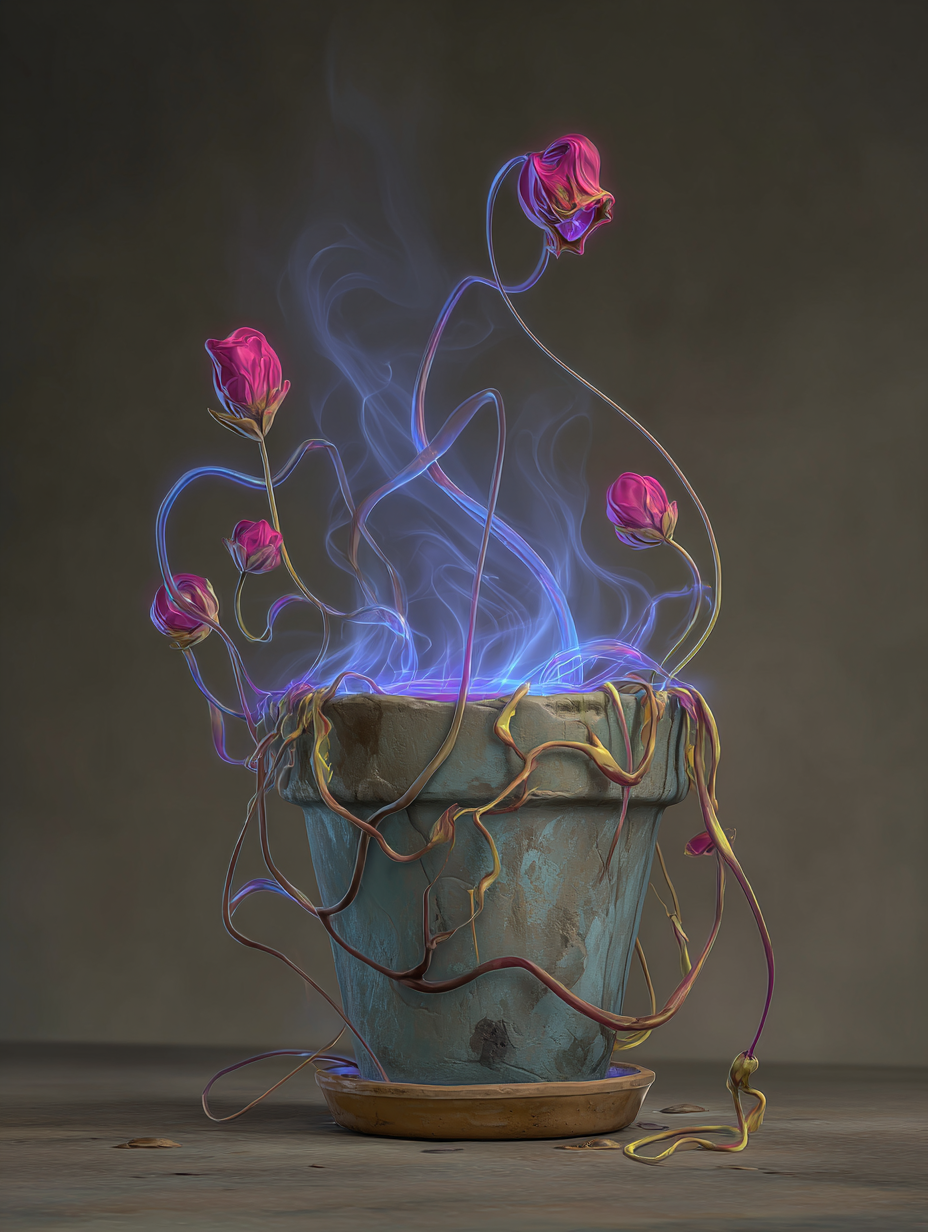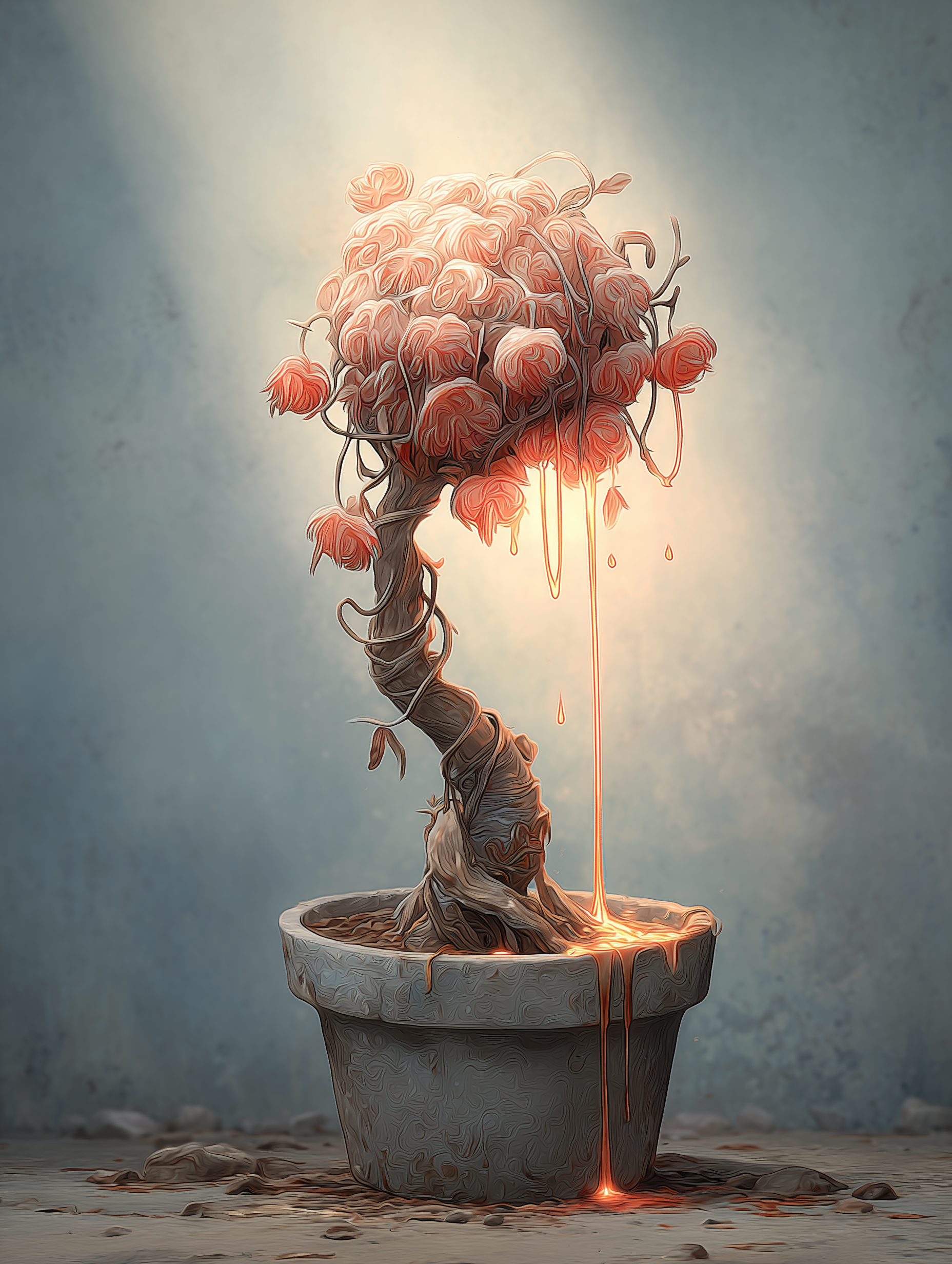 Gnarled bonsai with wrapped trunk and coral-colored flowering canopy, leaking streams of glowing golden light that pools beneath an ornate clay pot --v 7 --ar 3:4 --sref 1754998710 --sv 4 --w 0 --c 0 keypromptninja