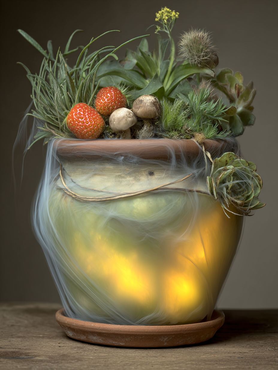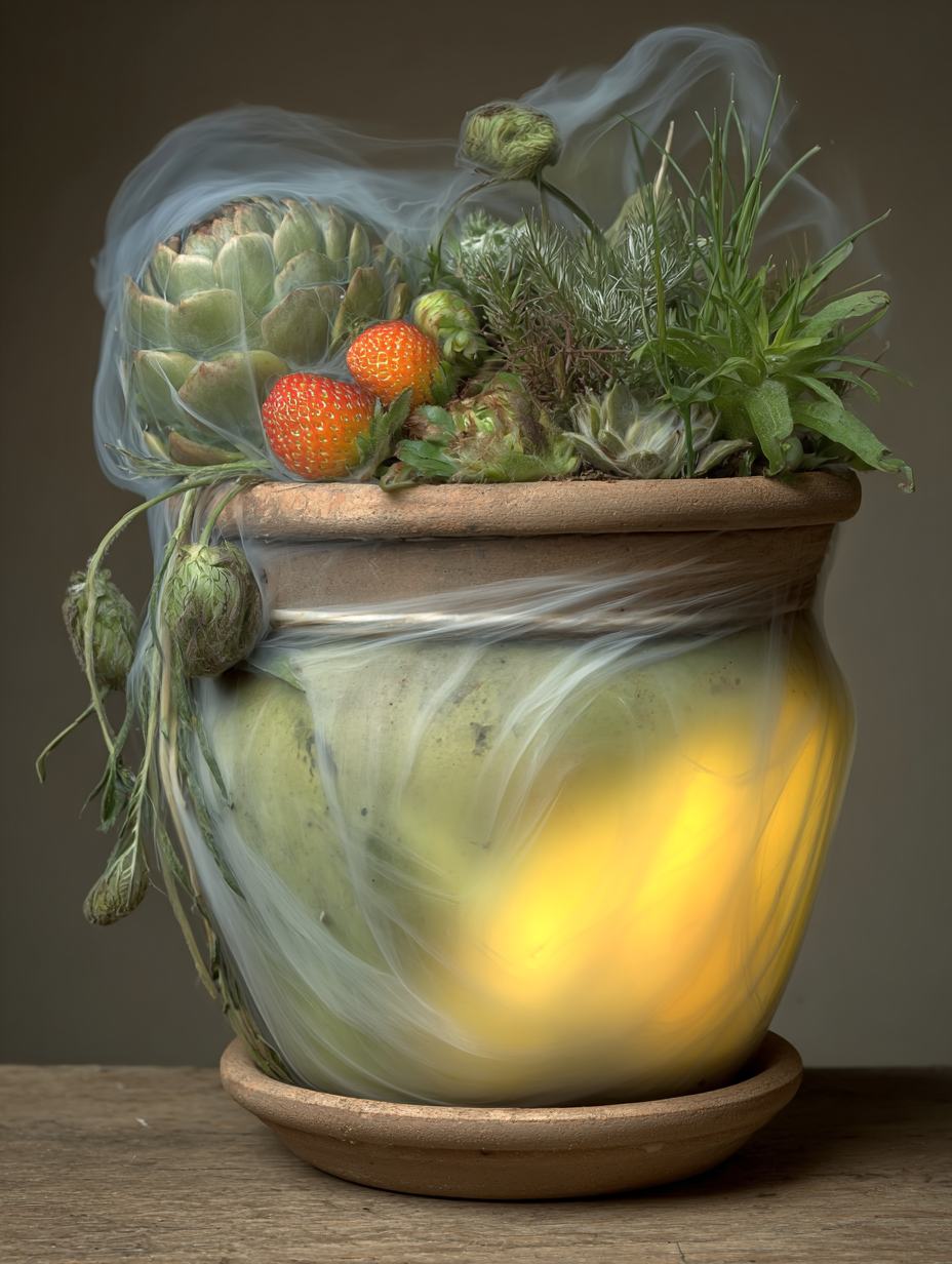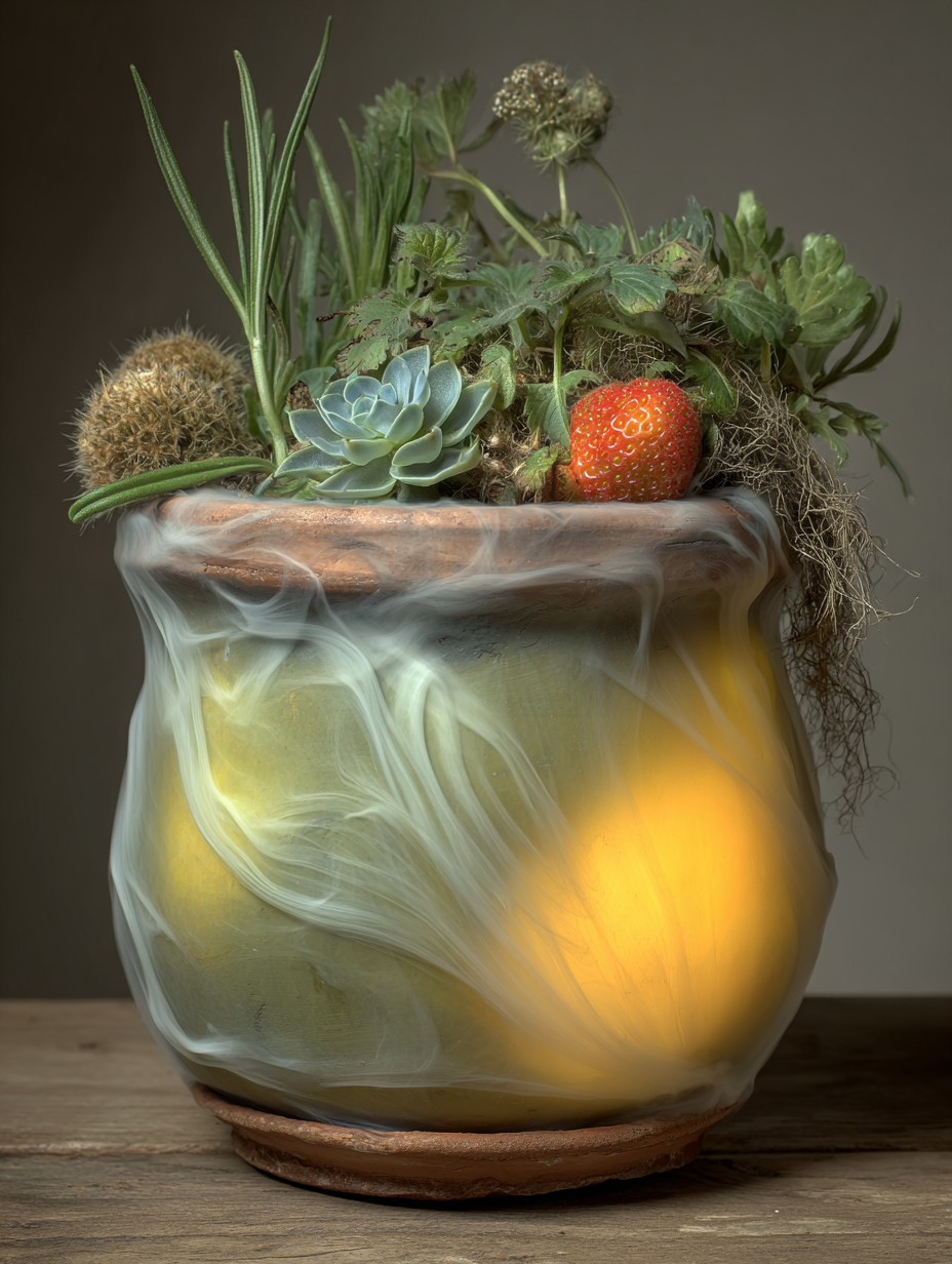 Gnarled bonsai with wrapped trunk and coral-colored flowering canopy, leaking streams of glowing golden light that pools beneath an ornate clay pot --v 7 --ar 3:4 --sref 1754998710 --sv 4 --w 0 --c 0 keypromptninja