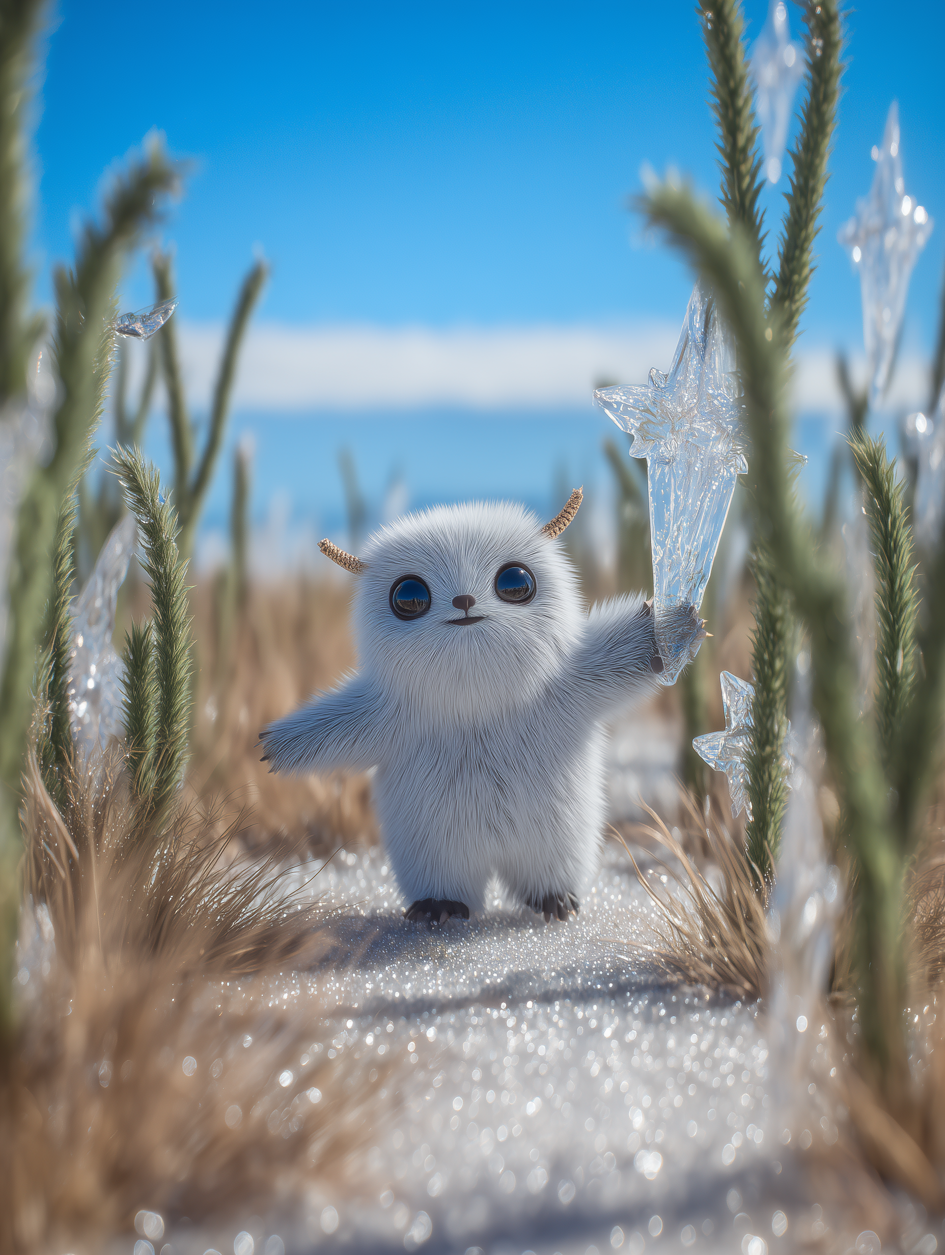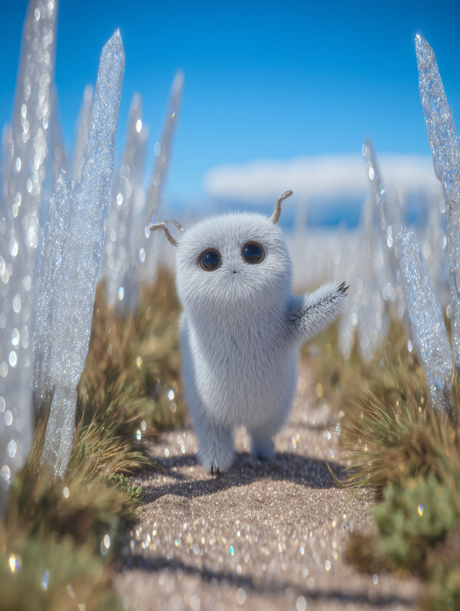 An adorable furry alien herbivore creature with large expressive eyes, soft fluffy fur coat in pastel colors, gentle rounded features, small horns or antennae, standing on crystalline ice formations in a bright frozen tundra landscape, playful and friendly demeanor, whimsical design, creature has four legs with padded paws, eating glowing ice plants in a whimsical, content, curious, playful, whimsical/playful style, viewed from a close-up shot, low angle shot, worm's-eye view, diffused sunlight, sunny lighting, at morning, with a bright and vibrant, fantasy, playful vibe, accented by natural light, overhead, warm glow, bright highlights, glowing highlights, soft shadows, subtle glow, featuring bright colors, cool tones, saturated colors, vibrant colors, polychromatic, cyan, lavender, pale turquoise, pink, sky blue, white, cold, pastel, winter colors, with crystalline, icy, soft body, glossy, shimmering, subtle reflection, bioluminescence, glowing, subtle glow effects --v 7 --ar 3:4 --c 15 --s 950 --sref https://dhzkdndgolte1.cloudfront.net/eyJidWNrZXQiOiJtcG0tcHJvZHVjdGlvbi0yMDI1Iiwia2V5IjoicHJvbXB0cy9tZHNkY3d1emRzam11NjYvaW1hZ2VzLzE3NjI1MzUxODcwMjItMTEtNy0yNS13aW50ZXItZmluYWwucG5nIiwiZWRpdHMiOnsicmVzaXplIjp7IndpZHRoIjo4MDAsImhlaWdodCI6NjAwLCJmaXQiOiJpbnNpZGUifSwicXVhbGl0eSI6ODV9fQ== --sw 600 keyshortcuts