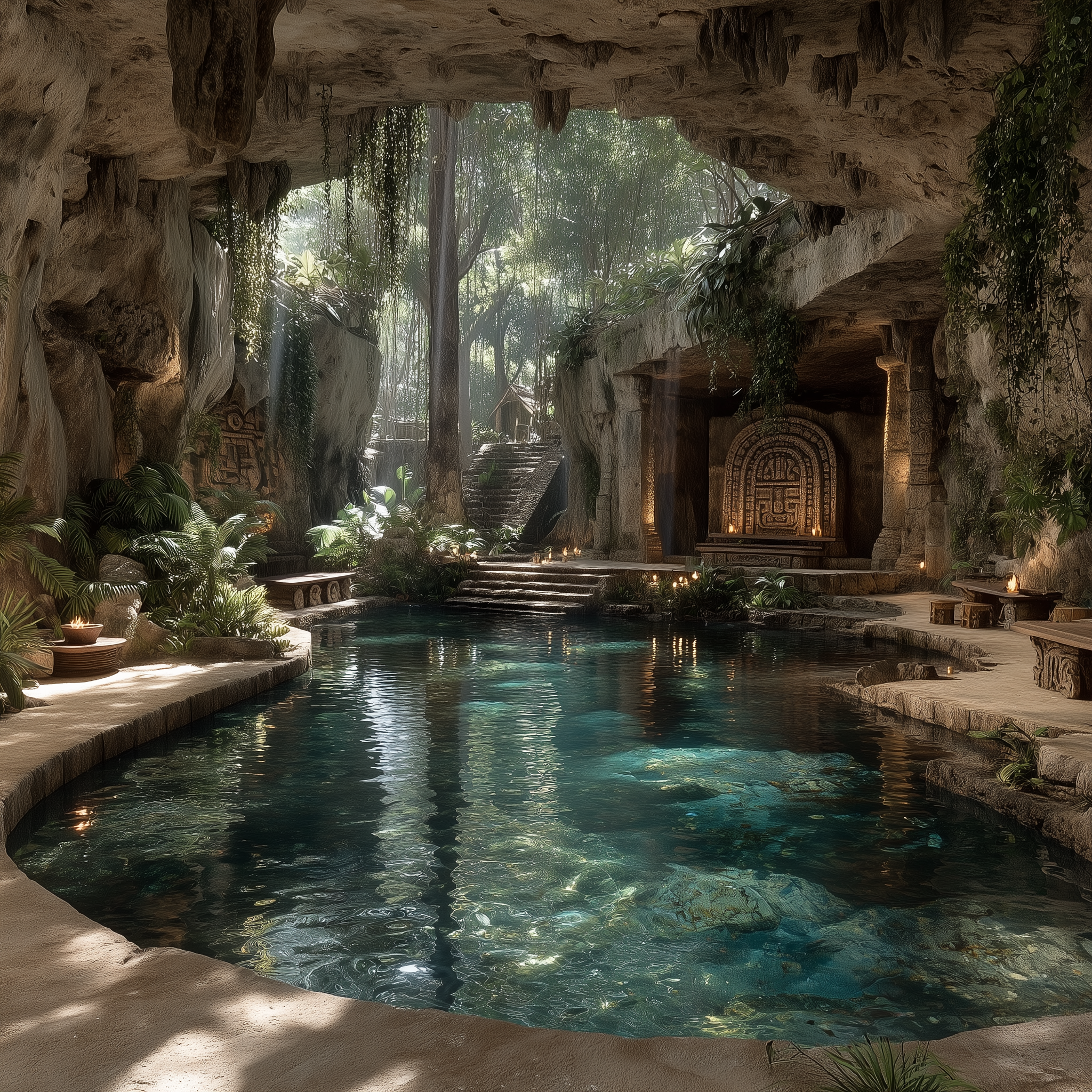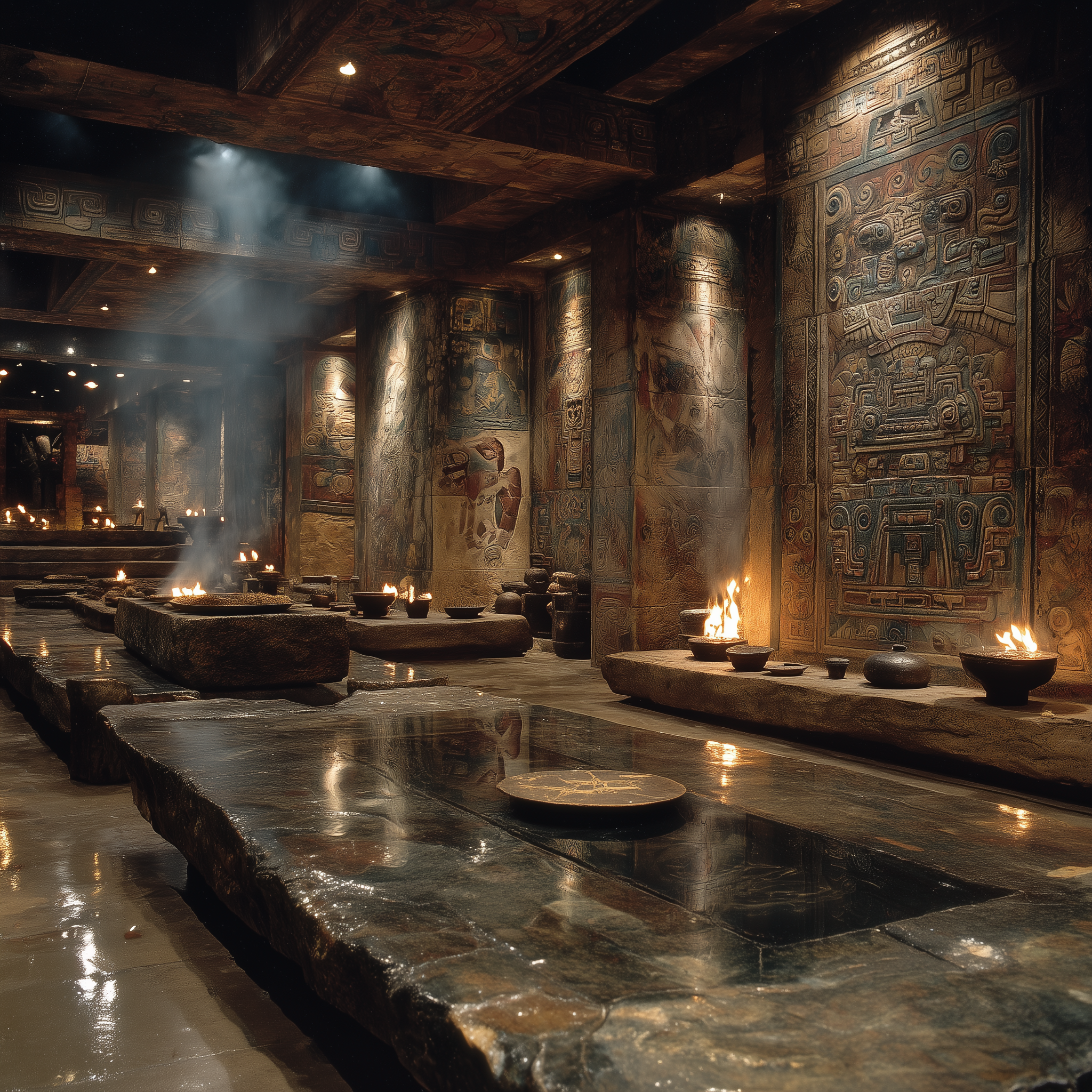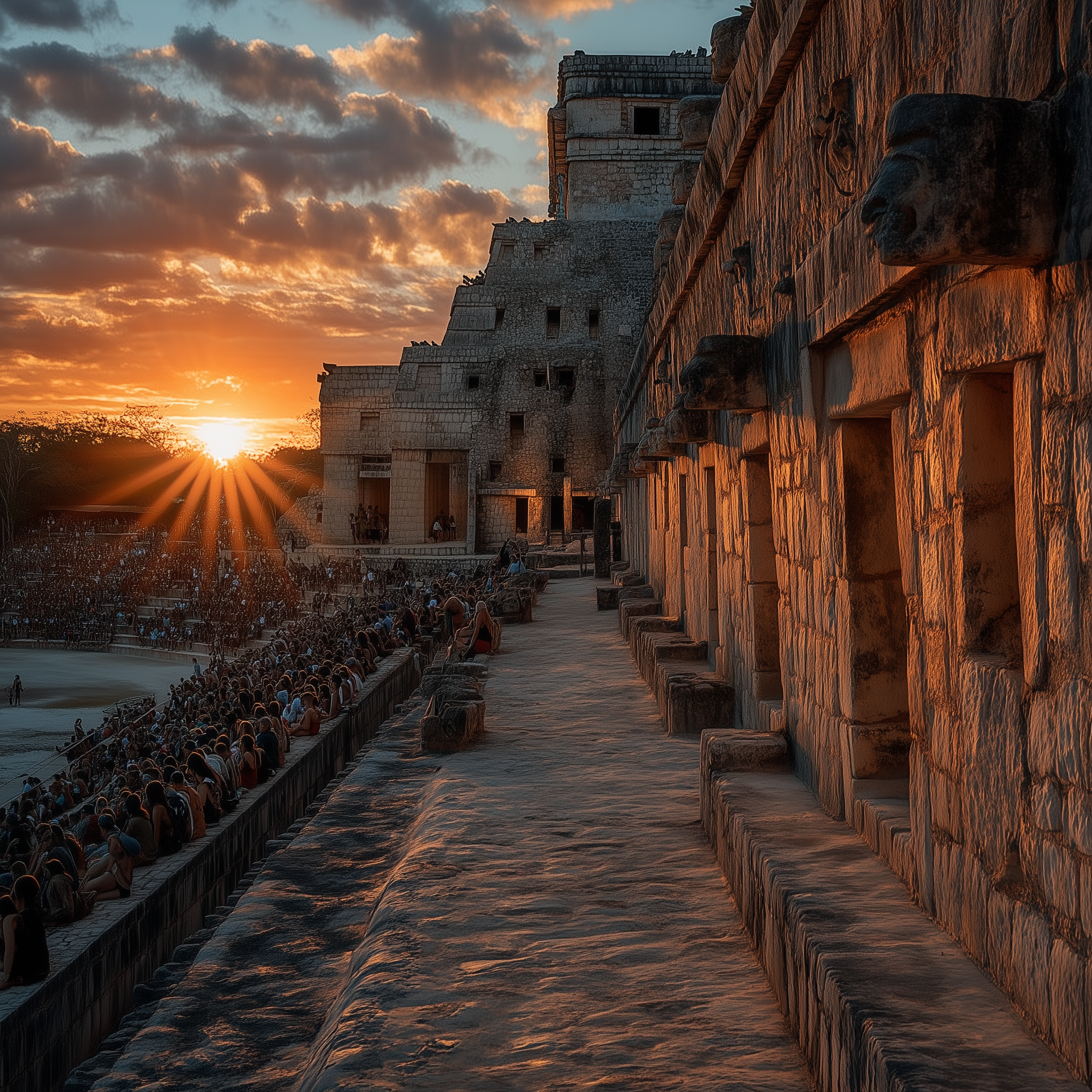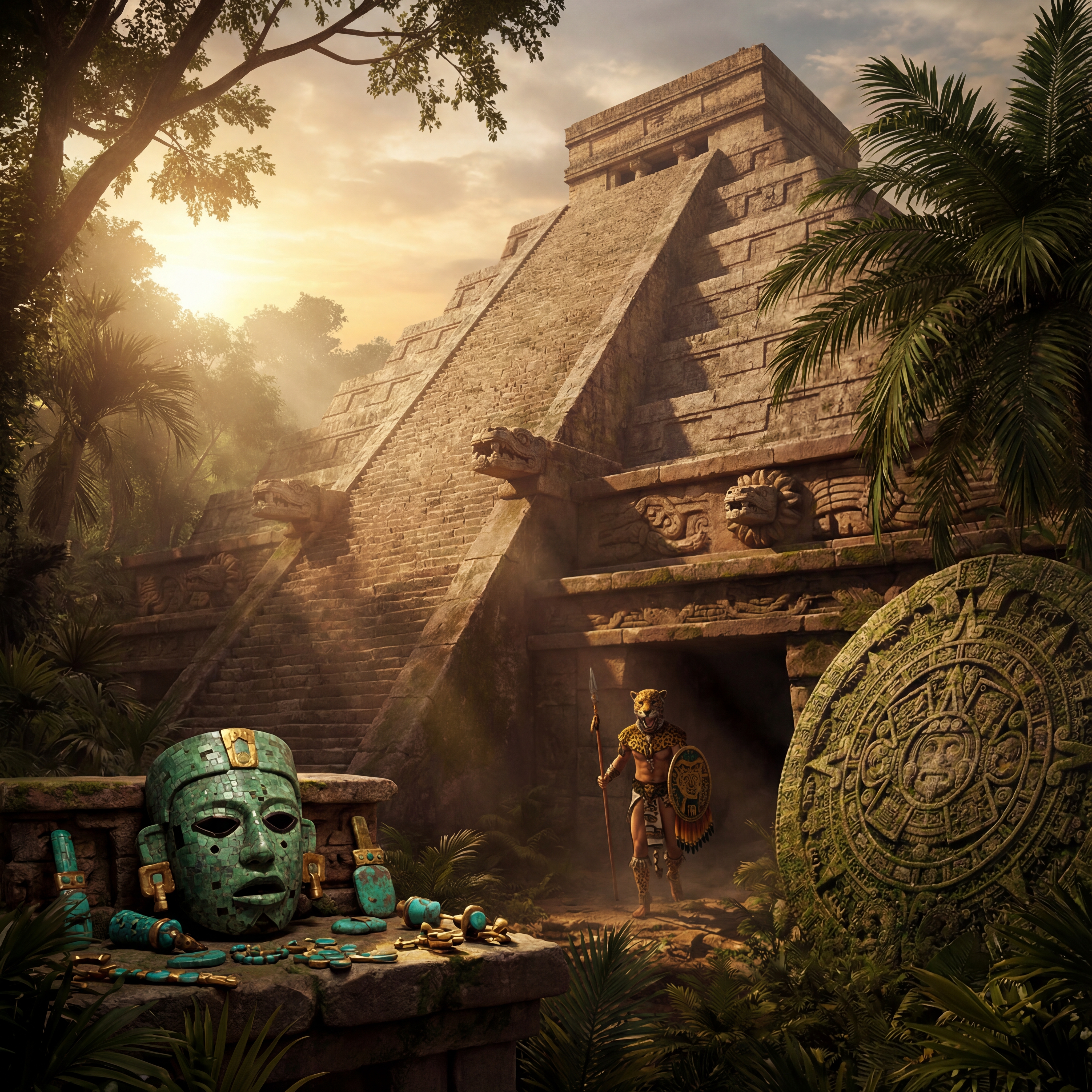 A massive stepped pyramid at sunset with carved serpent heads, jade mosaic mask with obsidian eyes, jaguar warrior emerging from shadows, turquoise and gold ceremonial objects, jungle canopy framing ancient stone calendar in a mesoamerican, majestic, mysterious, ominous style, viewed from a low angle shot, wide shot, dappled light lighting, at sunset, with a historical, massive scale, mystical vibe, accented by atmospheric haze, natural light, warm glow, dramatic highlights, dramatic shadows, god rays, featuring earth tones, saturated colors, warm tones, gold, turquoise, earth, gold, warm colors, with dense foliage, ornate, stone architecture, weathered stone effects --v 7 --ar 1:1 --c 10 --w 0 --s 750 --q 2