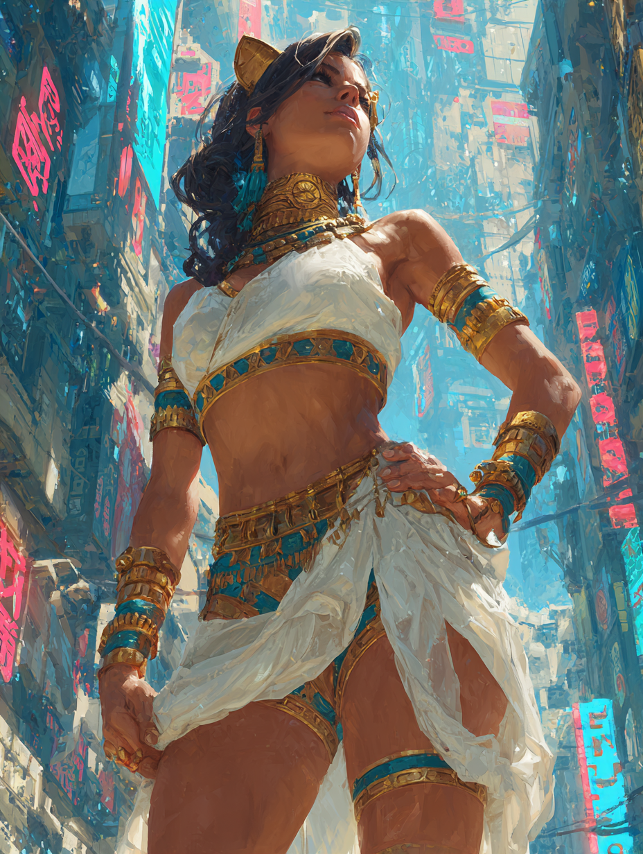 Stunning Egyptian goddess warrior with black cat ears and flowing dark hair, wearing ornate golden jewelry and collar, white flowing fabric wraps revealing toned physique, intricate golden arm bands and accessories, confident pose with hand on hip, set against a vibrant cyberpunk neon cityscape with electric blue and pink holographic displays, towering futuristic skyscrapers with glowing circuit patterns, and atmospheric neon fog swirling around ancient hieroglyphic projections in a cyberpunk, dramatic, mysterious style, viewed from a medium shot, shot on sony fx6 with sony fe c 16-35mm t3.1 g lens, dawn, twilight lighting, at night, with a cinematic, cyberpunk, futuristic vibe, accented by city lights, holographic glow, neon glow, back light, glowing highlights, neon light, featuring high-contrast colors, saturated colors, vibrant colors, blue, gold, pink, white, neon colors, with flowing fabric, metallic, glimmering, electroluminescence, fluorescence effects --v 7 --ar 3:4 --c 25 --s 950 --sref https://dhzkdndgolte1.cloudfront.net/eyJidWNrZXQiOiJtcG0tcHJvZHVjdGlvbi0yMDI1Iiwia2V5IjoicHJvbXB0cy9wOHFkOXdqZ2w0OHlrZTkvaW1hZ2VzLzE3NTg1NTU5MzUyNjEtOS0yMi0yNS1jYXQtZ29kZGVzcy5wbmciLCJlZGl0cyI6eyJyZXNpemUiOnsid2lkdGgiOjgwMCwiaGVpZ2h0Ijo2MDAsImZpdCI6Imluc2lkZSJ9LCJxdWFsaXR5Ijo4NX19 --sw 800 keypromptninja
