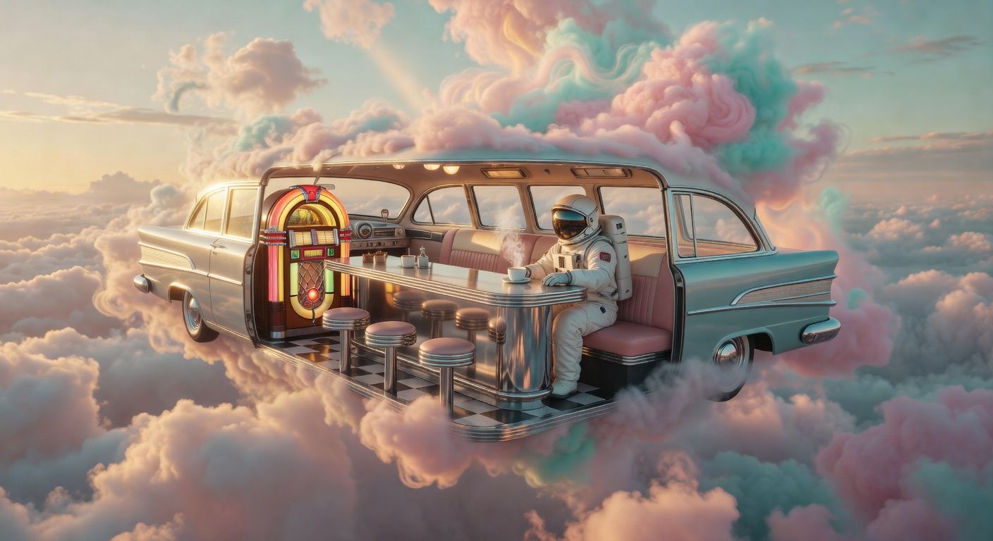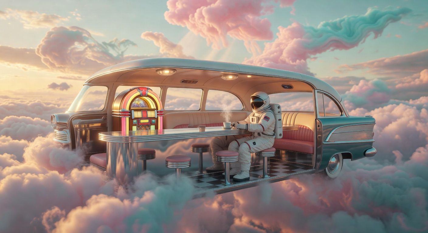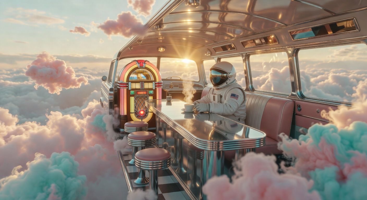 A retro 1950s diner-car floating in a surreal cloudscape at golden hour, pastel pink and turquoise clouds slowly drifting and evolving around the scene. An astronaut in a white spacesuit sits at the chrome counter, carefully setting down a steaming coffee cup as wisps of steam curl upward. The vintage jukebox glows with warm amber light that pulses gently like a heartbeat, casting soft reflections on the chrome surfaces. Golden sunlight filters through the ethereal clouds, creating a dreamlike, mysterious atmosphere of solitude and wonder. --v 7 --ar 16:9 --c 0 --w 0 --s 100 --q 1