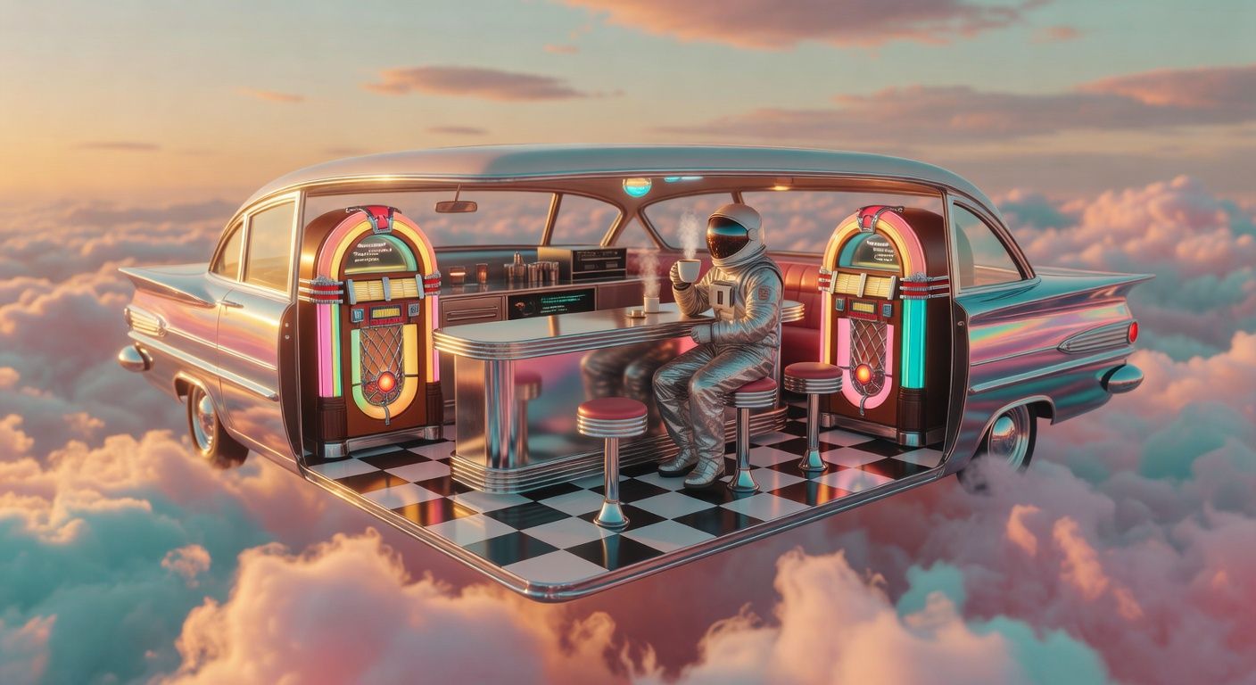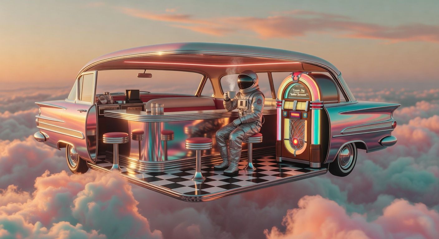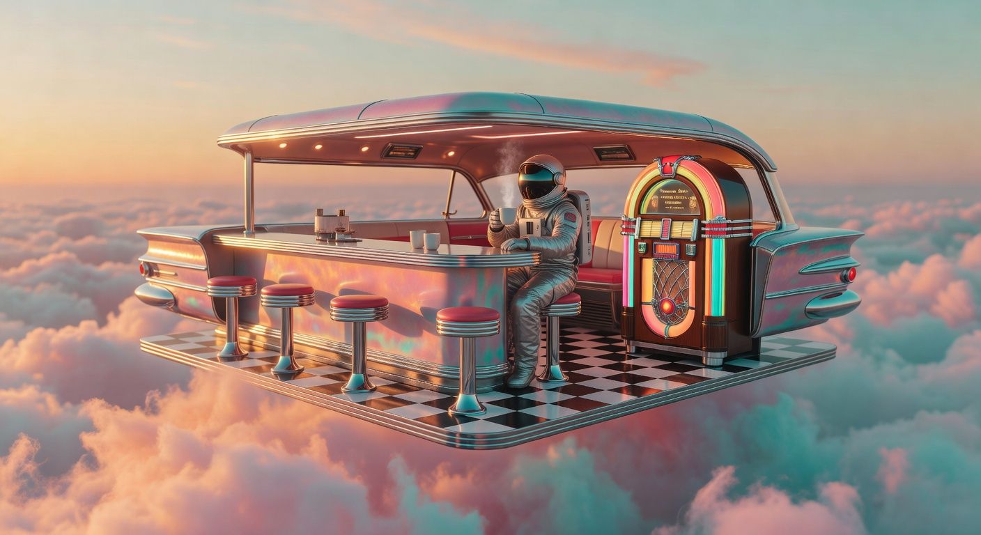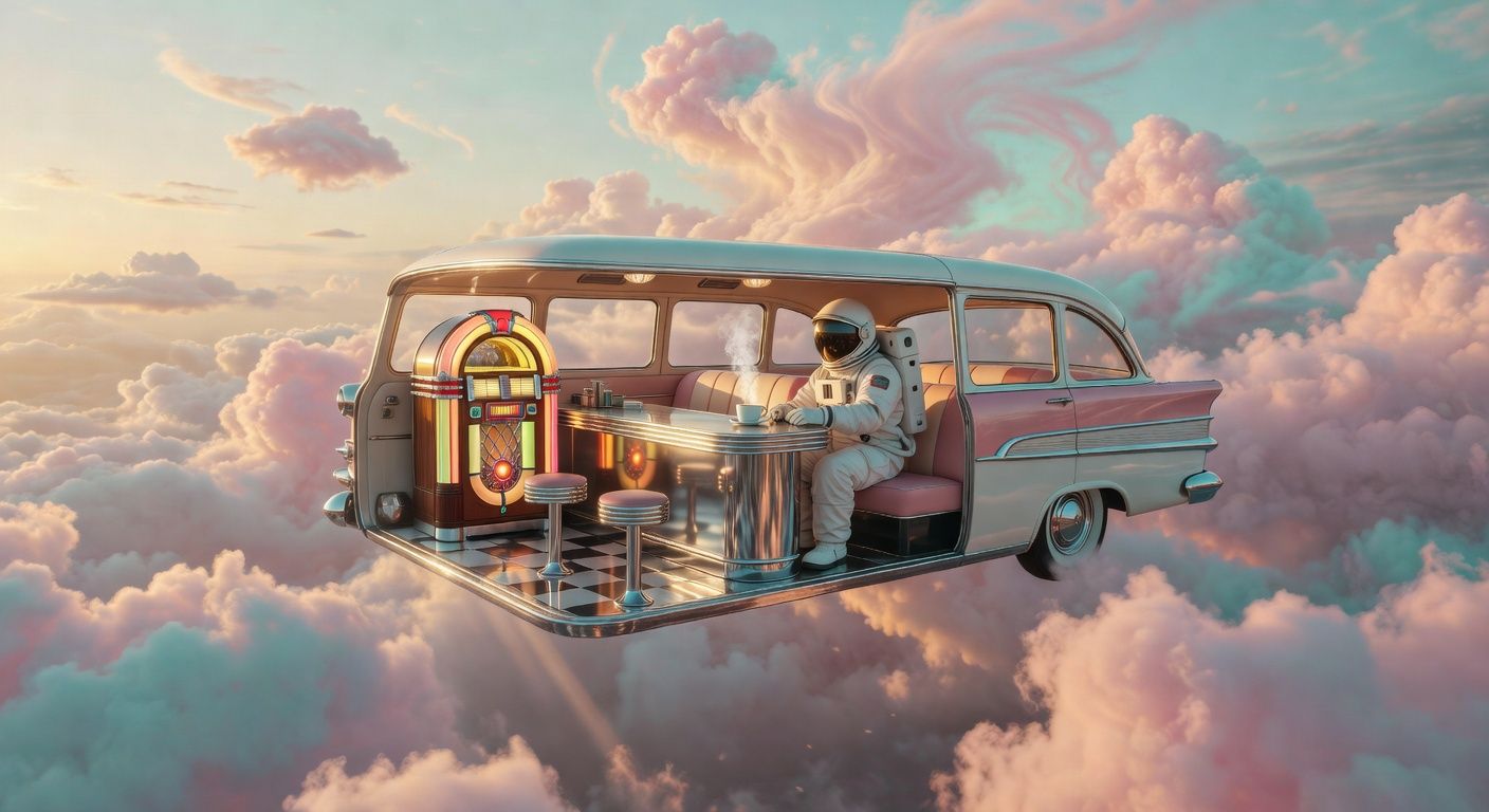 A retro 1950s diner-car floating in a surreal cloudscape at golden hour, pastel pink and turquoise clouds slowly drifting and evolving around the scene. An astronaut in a white spacesuit sits at the chrome counter, carefully setting down a steaming coffee cup as wisps of steam curl upward. The vintage jukebox glows with warm amber light that pulses gently like a heartbeat, casting soft reflections on the chrome surfaces. Golden sunlight filters through the ethereal clouds, creating a dreamlike, mysterious atmosphere of solitude and wonder. --v 7 --ar 16:9 --c 0 --w 0 --s 100 --q 1