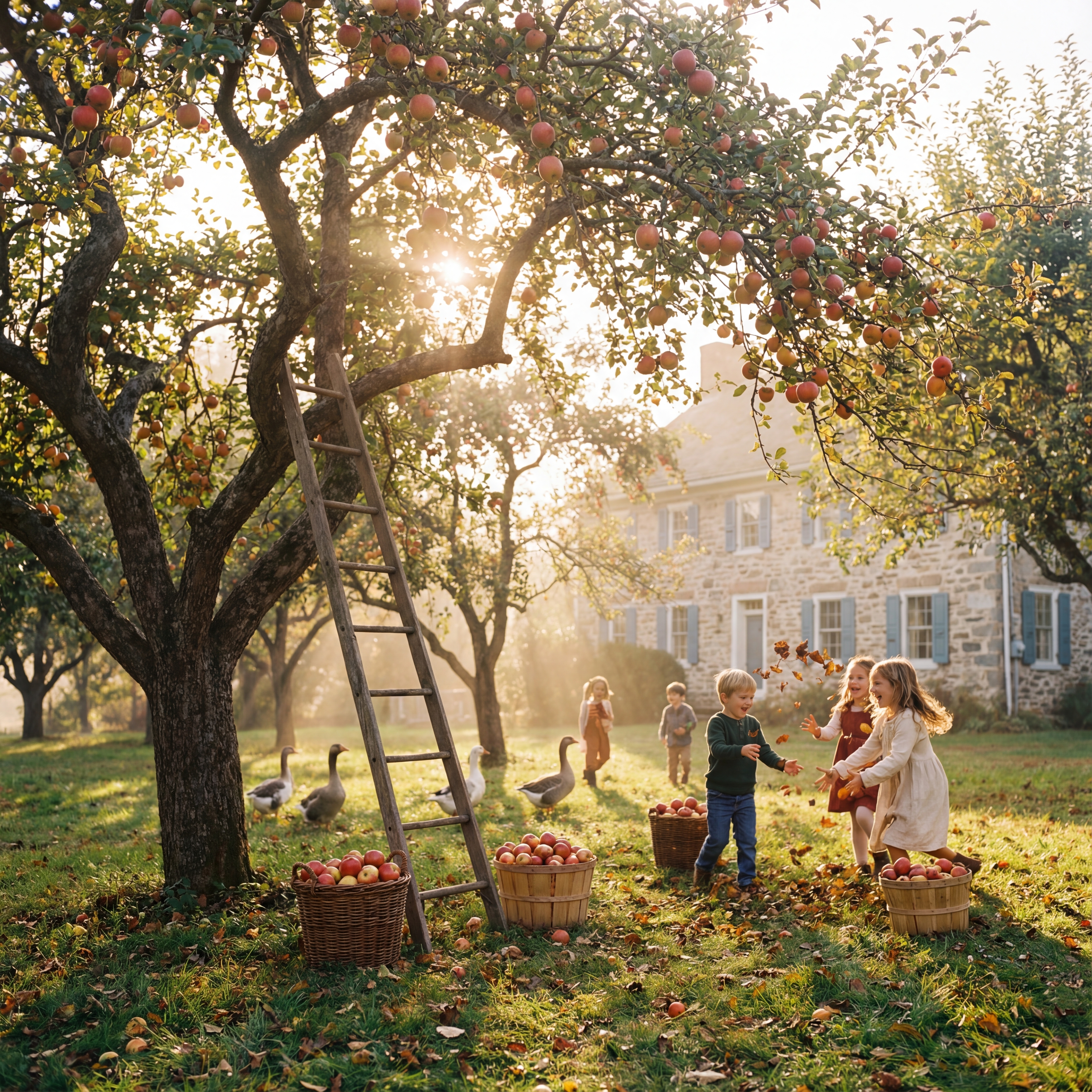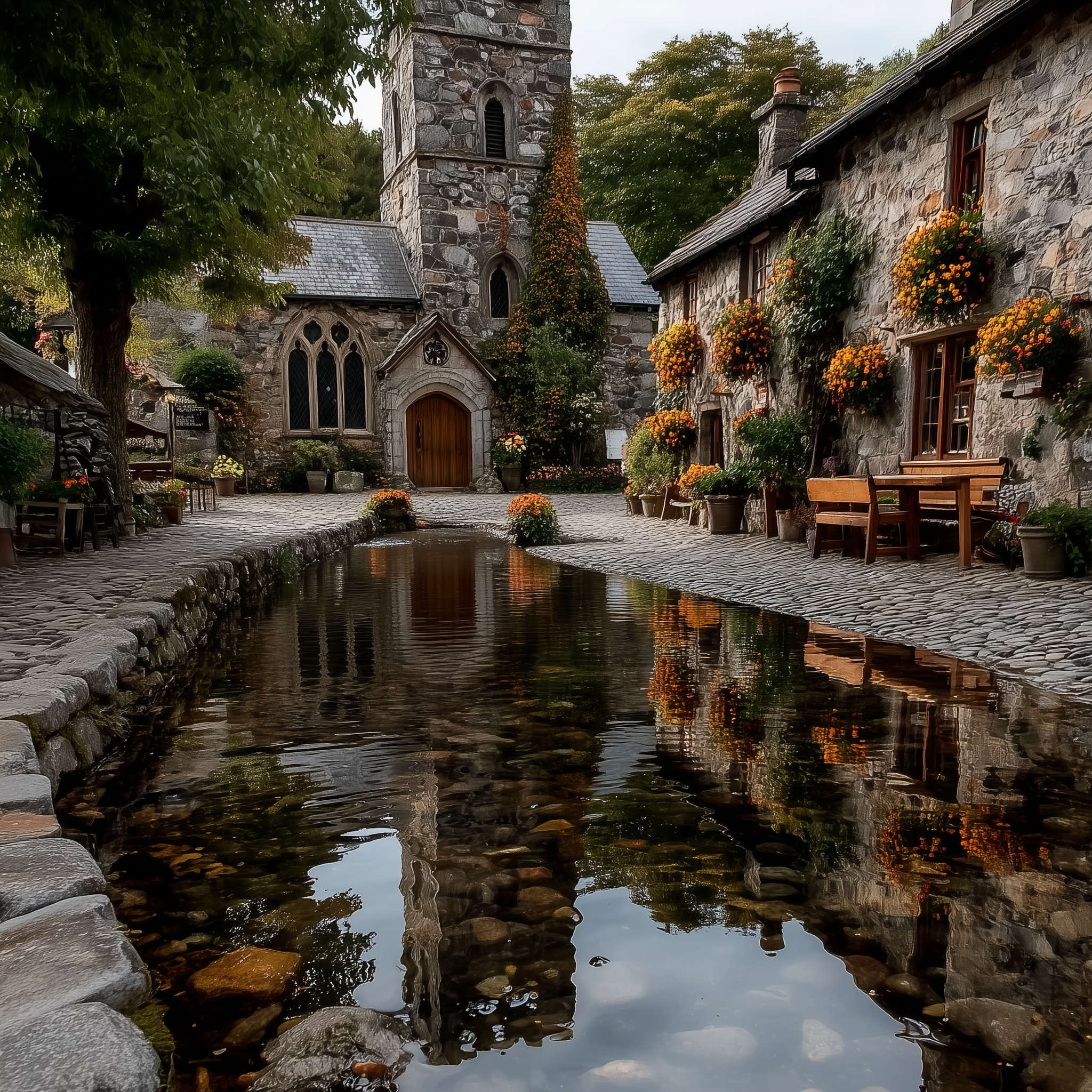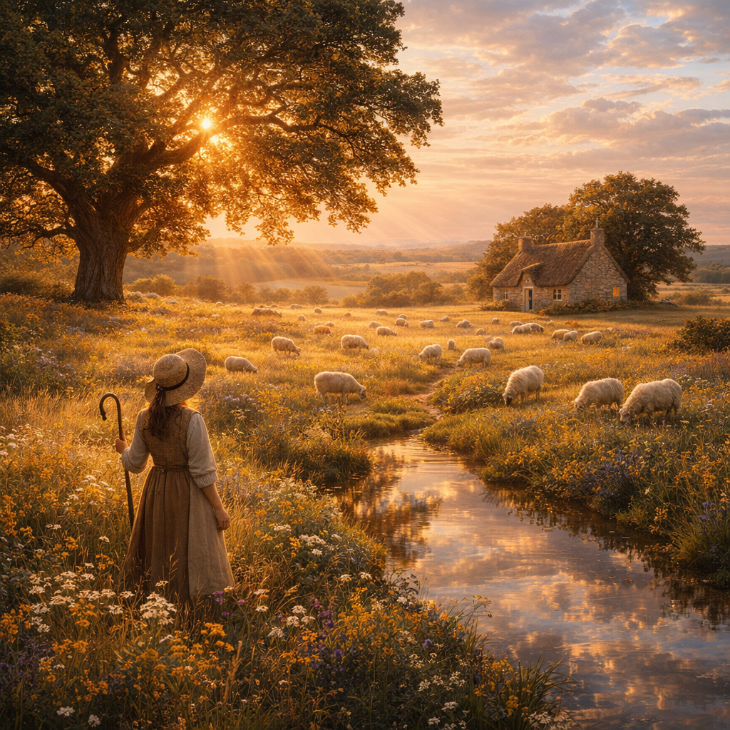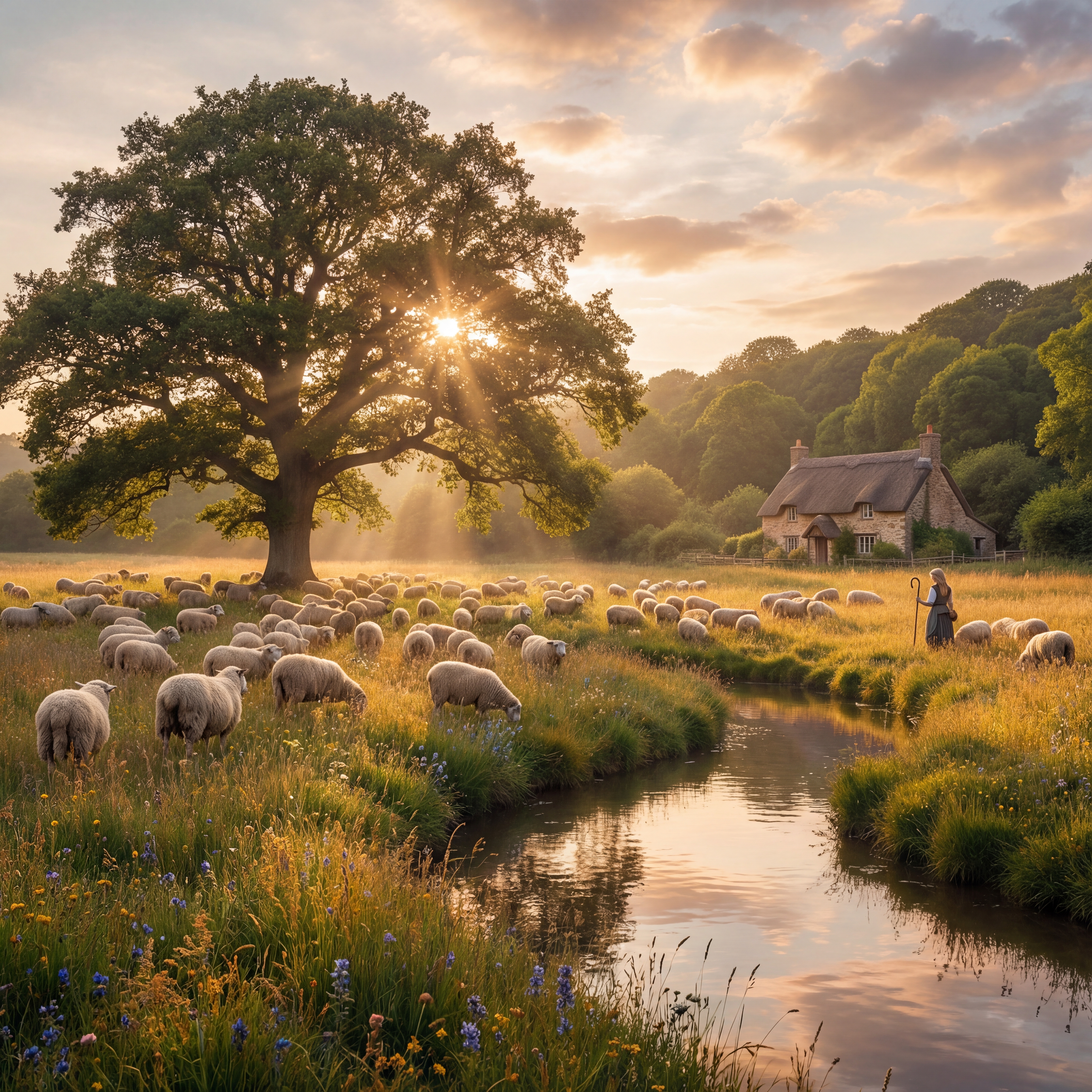 A golden meadow at sunset with grazing sheep, ancient oak tree providing shade, stone cottage with thatched roof in distance, wildflowers swaying, gentle stream reflecting clouds, shepherdess with crook, idyllic countryside tranquility in a pastoral, blissful, nostalgic, serene/tranquil style, viewed from a establishing shot, wide shot, soft morning light lighting, at golden hour, with a organic, romantic, rustic vibe, accented by natural light, warm glow, diffused light, god rays, subtle highlights, featuring earth tones, saturated colors, warm tones, forest green, gold, sky blue, wheat, nature, summer, warm colors, with dense foliage, soft effects --v 7 --ar 1:1 --c 10 --w 0 --s 750 --q 2 --sref https://mpm-production-2025.s3.us-east-1.amazonaws.com/prompts/qt6ll4tcutw9ue9/images/1766635433336-mid-1.png --sw 400 keypromptninja
