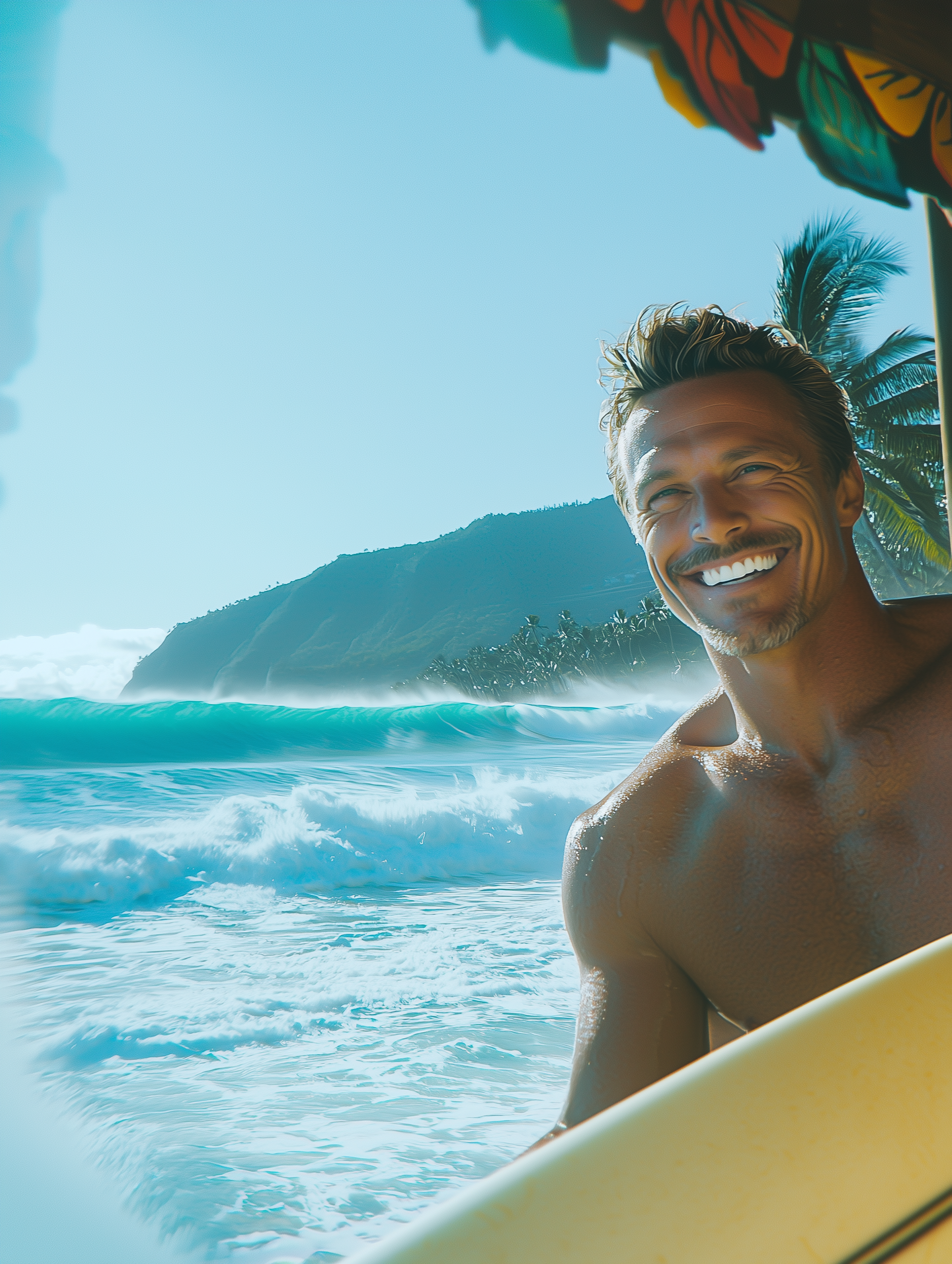 https://mpm-production-2025.s3.us-east-1.amazonaws.com/prompts/s9jba9k3mvmhfmh/images/1763172131779-pipeline-1.png A smiling surfer relaxing on a beach cabana, Hawaiian paradise beach in the background with turquoise waves and palm trees, natural happy vibe, bright sunny day, tropical lifestyle portrait in a tropical paradise, adventurous, content, happy style, viewed from a eye level shot, medium shot, diffused sunlight, sunny lighting, at afternoon, with a bright and vibrant, contemporary, playful vibe, accented by natural light, warm glow, bright highlights, soft shadows, subtle glow, featuring saturated colors, vibrant colors, warm tones, azure, coral, sky blue, teal, turquoise, summer, tropical punch, waimea waters colors, with flowing, wet surfaces, glossy, shimmering, subtle reflection effects --v 6.1 --ar 3:4 --q 2 --c 10 --s 450 --cref https://mpm-production-2025.s3.us-east-1.amazonaws.com/prompts/s9jba9k3mvmhfmh/images/1763172139546-surfer-1.png --iw 1.5 --cref https://mpm-production-2025.s3.us-east-1.amazonaws.com/prompts/s9jba9k3mvmhfmh/images/1763172139546-surfer-1.png https://mpm-production-2025.s3.us-east-1.amazonaws.com/prompts/s9jba9k3mvmhfmh/images/1763173524284-surfer-6.png --cw 100 --w 0