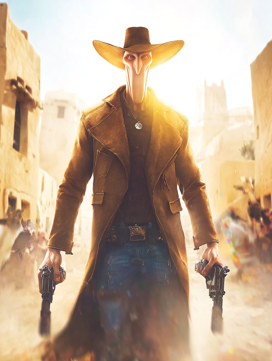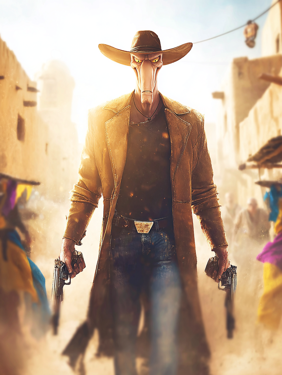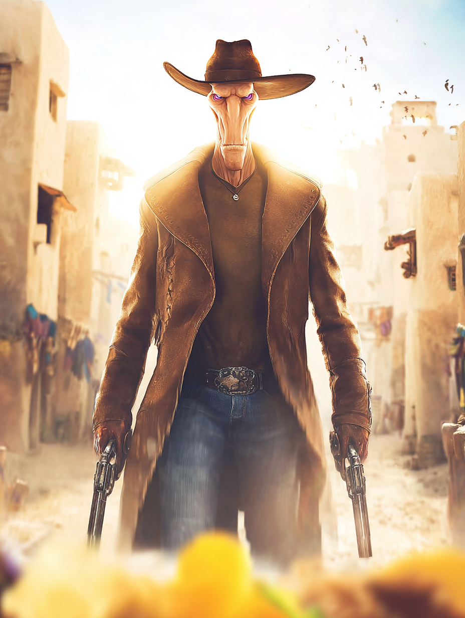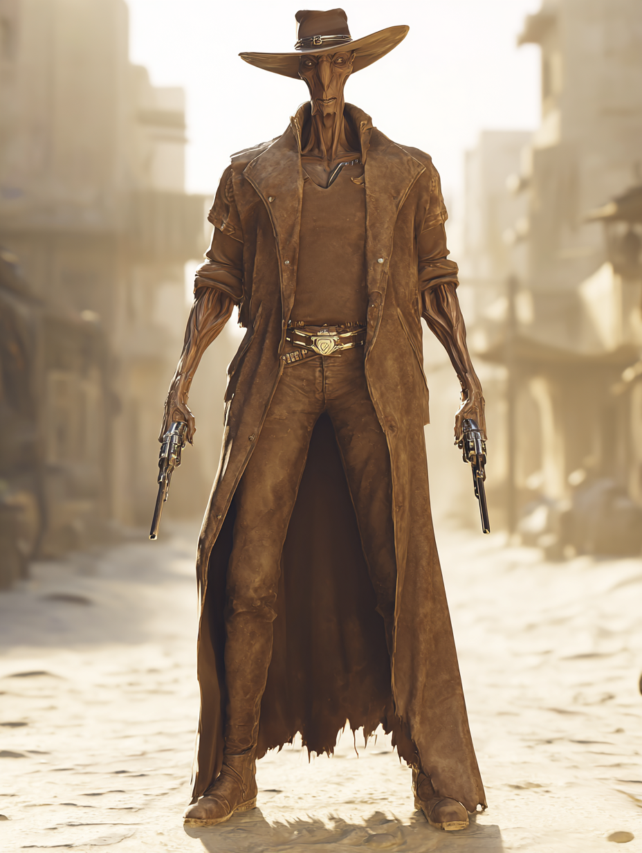 An intimidating alien cowboy with distinctive non-human features, textured alien skin, unique facial structure, standing in the middle of a dusty desert road in a classic gunslinger stance ready for a duel, wearing a weathered brown leather duster coat and wide-brimmed cowboy hat, holstered sci-fi blasters at the hips, desert planet landscape with buildings in background, front lighting, clear visibility, dramatic western standoff composition, cinematic sci-fi western style, sharp focus on character details in a sci-fi, confident, dramatic, intense style, viewed from a full shot, slight low angle shot, overcast, sunny lighting, at afternoon, with a cinematic, dusty, gritty vibe, accented by natural light, overhead, dramatic shadows, dust particles in light beams, high contrast, sharp shadows, subtle highlights, featuring high-contrast colors, muted earthy tones, vibrant with muted accents, warm tones, analogous colors, brown, ochre yellow, olive, orange, sandy brown, sienna, tan, teal, warm colors, with textured, textured stone, weathered leather, worn metal, matte and weathered surfaces, rough, subtle reflection, subtle glow effects --v 7 --ar 3:4 --weird 400 --s 800 keypromptninja