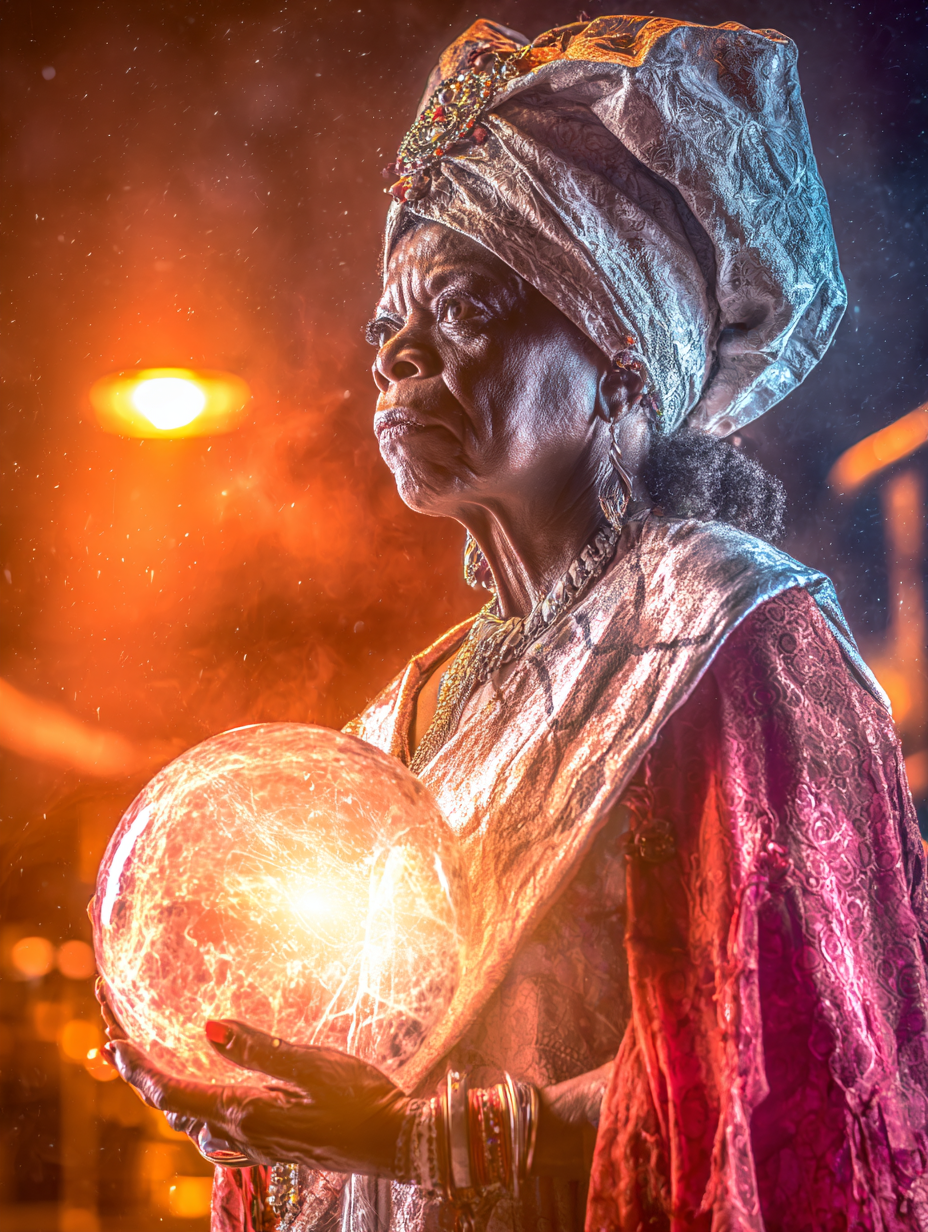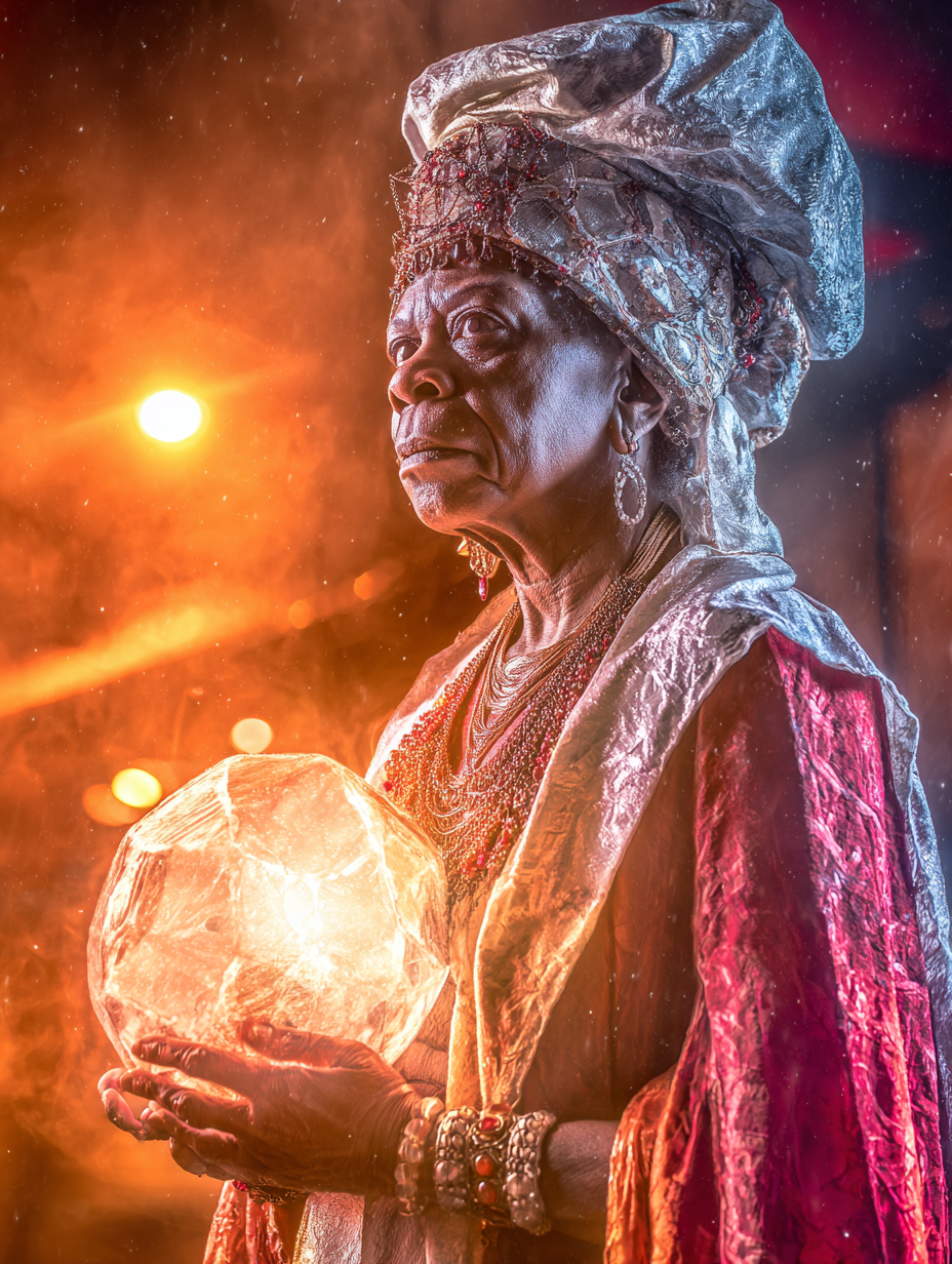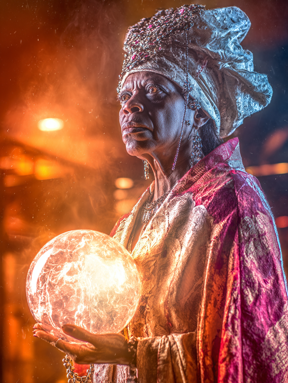 Dramatic portrait of powerful African American mystic fortune teller in elaborate ornate costume with flowing jeweled headwrap and mystical robes, hands hovering over glowing ethereal crystal ball emanating supernatural blue light, intense dramatic lighting from below illuminating face with otherworldly energy, rich jewel tones and theatrical staging, captured from high angle showing fortune teller gazing into crystal ball with mystical intensity, New Orleans voodoo priestess aesthetic with maximum drama and costume detail, cinematic movie poster style in a dark fantasy, contemplative, introspective, mysterious, mystical style, viewed from a high angle shot, overhead shot, at night, with a dark and moody, historical, mystical vibe, accented by atmospheric light, low light, warm glow, atmospheric particles, dramatic highlights, ethereal light, soft shadows, featuring darkened with golden highlights, saturated colors, warm tones, amber, crimson, gold, purple, vintage, warm antique colors, with atmospheric haze, subtle glow effects --v 7 --ar 3:4 --c 20 --weird 300 --s 400 --sref https://dhzkdndgolte1.cloudfront.net/eyJidWNrZXQiOiJtcG0tcHJvZHVjdGlvbi0yMDI1Iiwia2V5IjoicHJvbXB0cy92azJsd3hiN3EzOHNma2EvaW1hZ2VzLzE3NjE5MTcyMjExNzEtMTAtMzEtMjUtYmFsbC5wbmciLCJlZGl0cyI6eyJyZXNpemUiOnsid2lkdGgiOjgwMCwiaGVpZ2h0Ijo2MDAsImZpdCI6Imluc2lkZSJ9LCJxdWFsaXR5Ijo4NX19 --sw 600 sparker888
