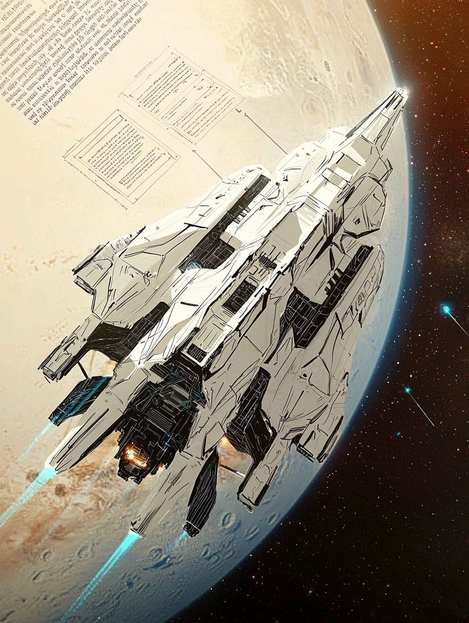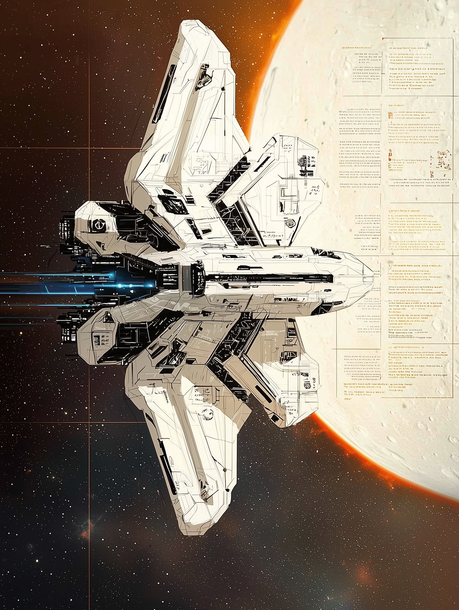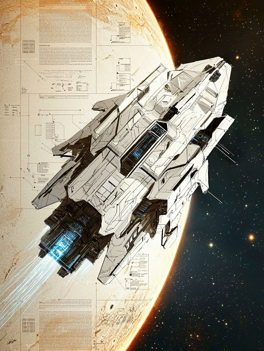 https://mpm-production-2025.s3.us-east-1.amazonaws.com/prompts/wh0gluf34m0ldjw/images/1763218788638-IMG_0904.jpeg A massive white futuristic spacecraft with angular plated armor and glowing blue engine trails, hovering in space against a vast blue moon or planet backdrop, with a small distant red sun creating a dramatic rim light, technical architectural blueprint style with engineering diagrams and annotations overlaid on aged parchment in a sci-fi, awe inspiring, majestic, mysterious style, viewed from a low angle shot, wide shot, alien sunlight, moonlight/starlight lighting, at night, with a futuristic, massive scale, sci-fi, space age vibe, accented by nebular glow, planetary glow, spacecraft glow, ethereal light, god rays, lens flare, sharp rim lighting, starship illumination, featuring cool tones, desaturated colors, charcoal gray, electric blue, firebrick, gold, white, deep space colors, with aerodynamic, massive, metallic, reflective, atmospheric haze, glossy, specular highlights, subtle reflection effects --v 6.1 --ar 3:4 --q 2 --c 20 --s 950 --sref https://mpm-production-2025.s3.us-east-1.amazonaws.com/prompts/wh0gluf34m0ldjw/images/1763218788638-IMG_0904.jpeg --sw 400 --cref https://mpm-production-2025.s3.us-east-1.amazonaws.com/prompts/wh0gluf34m0ldjw/images/1763218807894-SCR-20251115-jdid.jpeg --iw 1.5 --w 0 gogravital