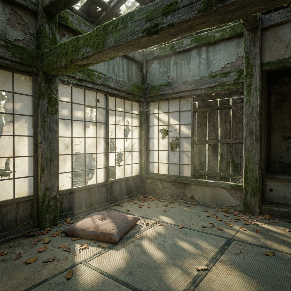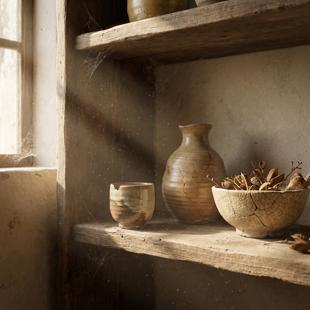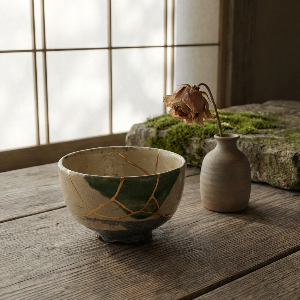 A cracked ceramic tea bowl with gold kintsugi repair lines, weathered wooden surface with natural grain, wilting flower in simple vase, morning light through paper shoji screen, moss growing on aged stone, perfect imperfection in a wabi-sabi, contemplative, melancholic, serene/tranquil style, viewed from a close-up shot, eye level shot, diffused sunlight, soft morning light lighting, at morning, with a minimalist, organic, rustic vibe, accented by natural light, diffused light, soft shadows, subtle highlights, featuring desaturated colors, earth tones, muted colors, beige, forest green, gold, gray, earth, muted tones, neutral colors, with ceramic, cracked, textured, weathered stone effects --v 7 --ar 1:1 --c 10 --w 0 --s 750 --q 2