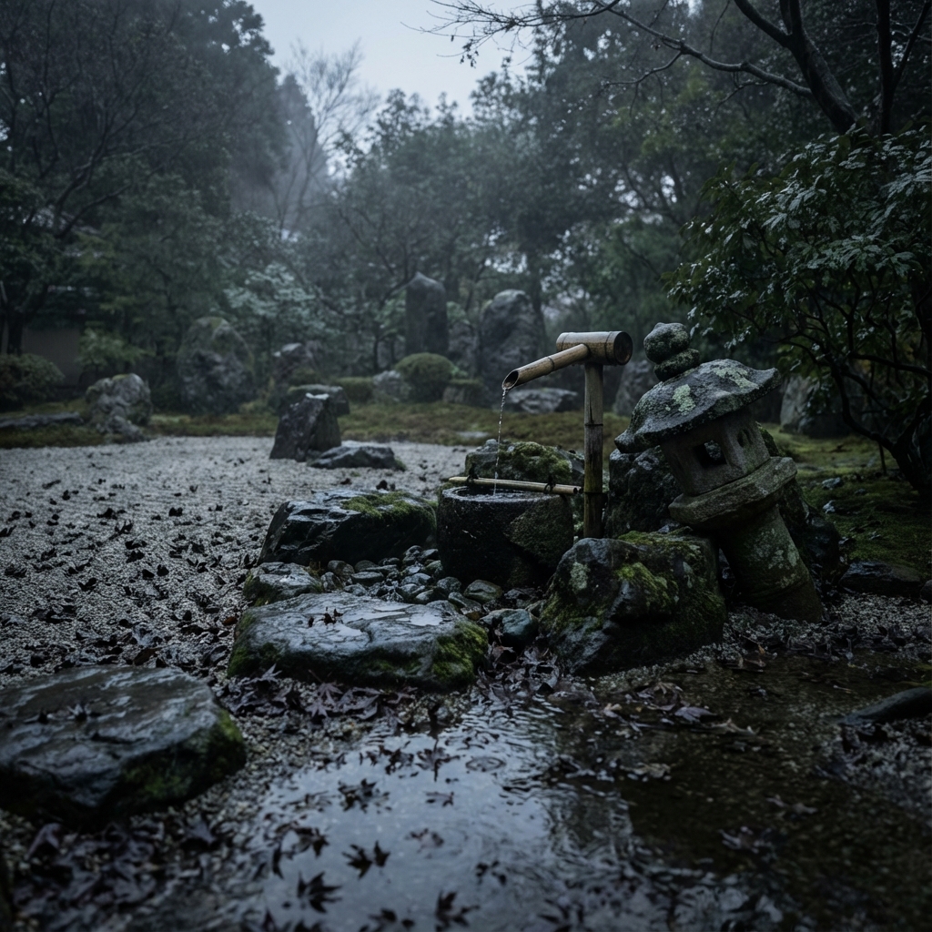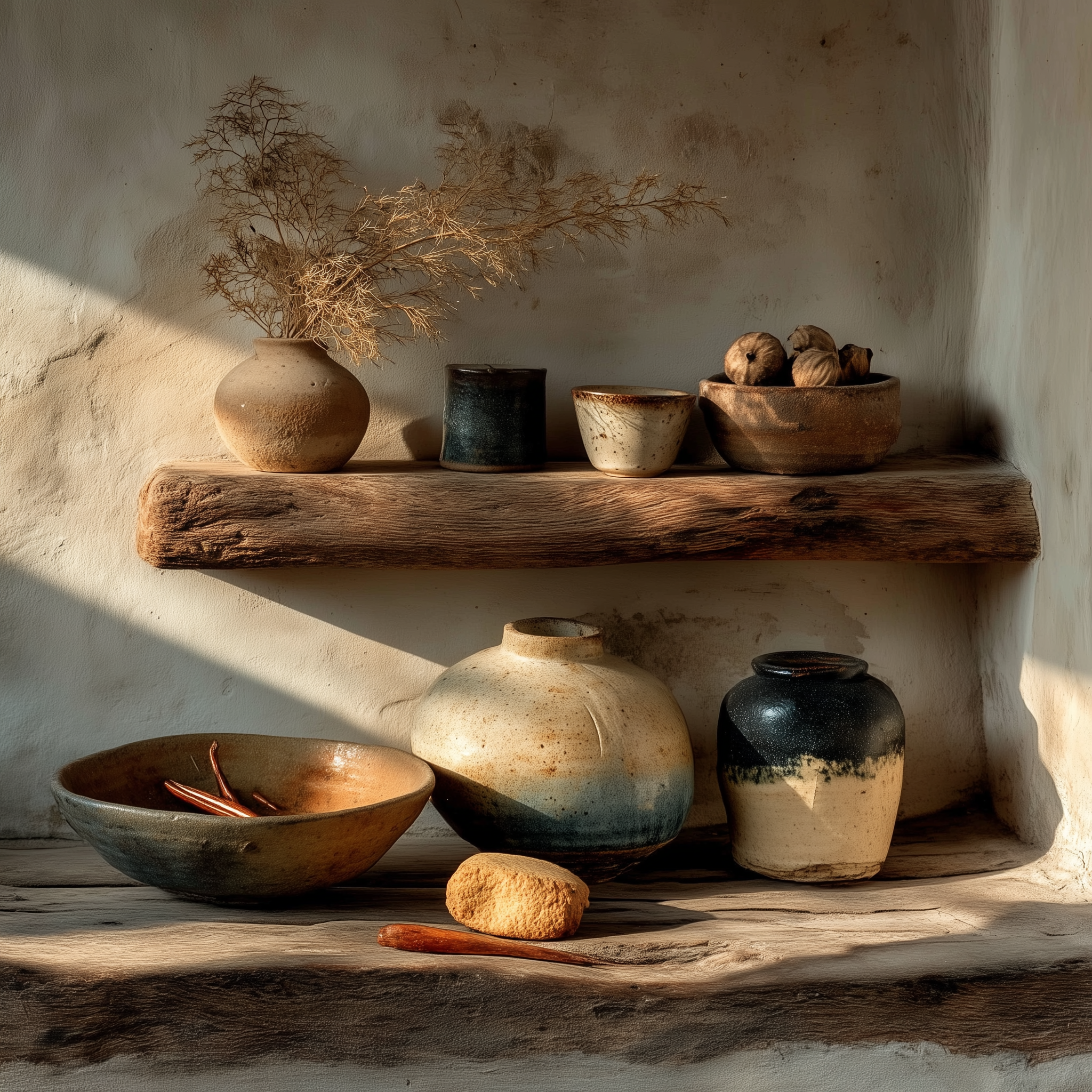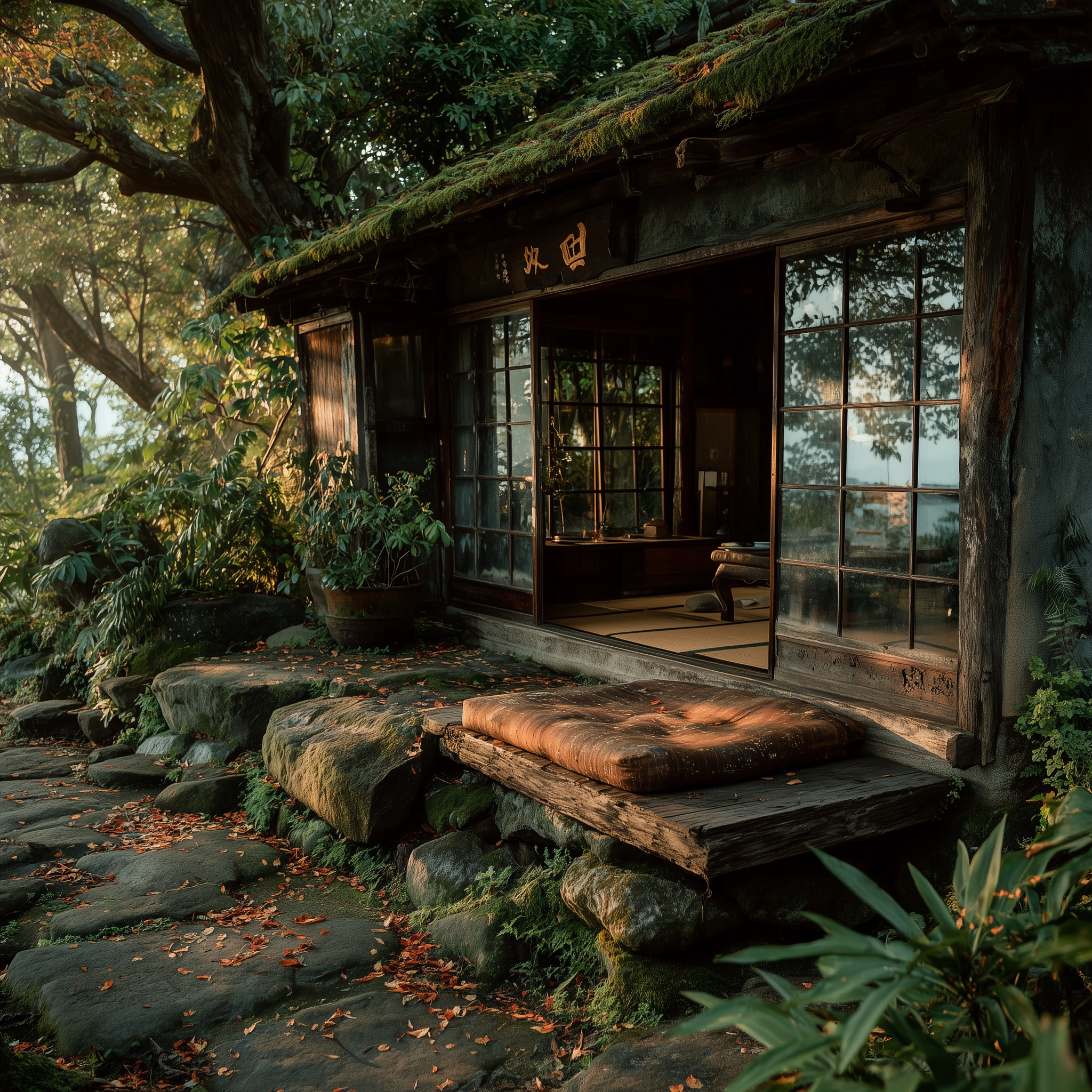 A cracked ceramic tea bowl with gold kintsugi repair lines, weathered wooden surface with natural grain, wilting flower in simple vase, morning light through paper shoji screen, moss growing on aged stone, perfect imperfection in a wabi-sabi, contemplative, melancholic, serene/tranquil style, viewed from a close-up shot, eye level shot, diffused sunlight, soft morning light lighting, at morning, with a minimalist, organic, rustic vibe, accented by natural light, diffused light, soft shadows, subtle highlights, featuring desaturated colors, earth tones, muted colors, beige, forest green, gold, gray, earth, muted tones, neutral colors, with ceramic, cracked, textured, weathered stone effects --v 7 --ar 1:1 --c 10 --w 0 --s 750 --q 2