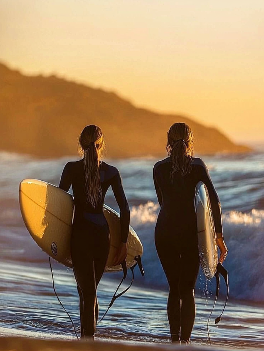 https://mpm-production-2025.s3.us-east-1.amazonaws.com/prompts/xmez6sj3qbisj9d/images/1763912613735-11-23-25-surfers.png Two female surfers in silhouette standing at the ocean's edge holding surfboards, golden hour sunset with warm orange and amber sky, gentle waves rolling onto sandy beach, atmospheric haze, serene coastal scene in a contemplative, serene/tranquil style, viewed from a eye level shot, medium shot, diffused sunlight lighting, at sunset, with a bright and vibrant, elegant, romantic vibe, accented by natural light, warm glow, back light, soft shadows, featuring saturated colors, vibrant colors, warm tones, amber, gold, orange, peach, summer, sunset-rayleigh-scattering, warm colors, with churning ocean waves, wet surfaces, subtle reflection effects --v 6.1 --ar 3:4 --c 20 --s 400 --iw 1.5 --w 0