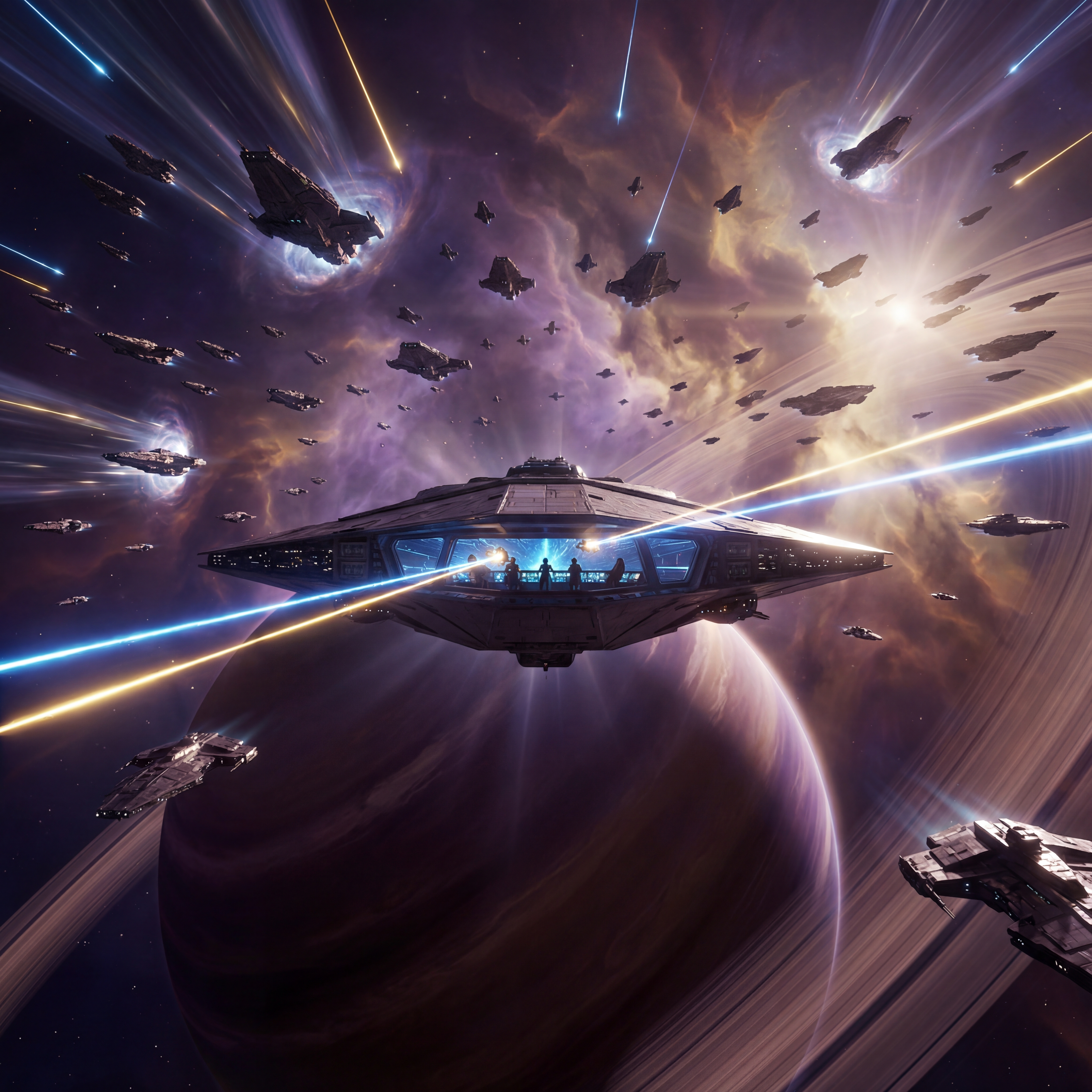 An epic fleet of massive starships emerging from hyperspace near ringed gas giant, laser fire illuminating bridge crew silhouettes, dramatic nebula backdrop in purple and gold, sense of galactic scale and adventure in a space opera, awe inspiring, dramatic, heroic style, viewed from a establishing shot, wide shot, alien sunlight lighting, at night, with a cinematic, massive scale, sci-fi vibe, accented by nebular glow, planetary glow, spacecraft glow, dramatic highlights, god rays, lens flare, featuring high-contrast colors, saturated colors, vibrant colors, deep brown, electric blue, gold, purple, bold, deep space, space colors, with aerodynamic, massive, metallic, specular highlights effects --v 7 --ar 1:1 --c 10 --w 0 --s 750 --q 2 --sref https://mpm-production-2025.s3.us-east-1.amazonaws.com/prompts/xmh75ife6j9jryz/images/1765308381910-mid-2.png --sw 400 keypromptninja